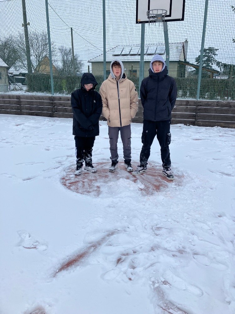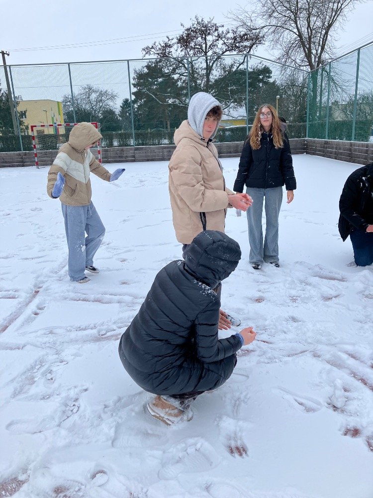Datum: 11. 1. 2026Osmáci naší školy zažili v pátek 9. 1. netradiční hodinu výtvarné výchovy. Díky čerstvé sněhové nadílce se učebna přesunula ven, na zasněžené školní hřiště. Bílá pokrývka se stala plátnem a žáci sami hlavními „nástroji“ pro tvorbu.