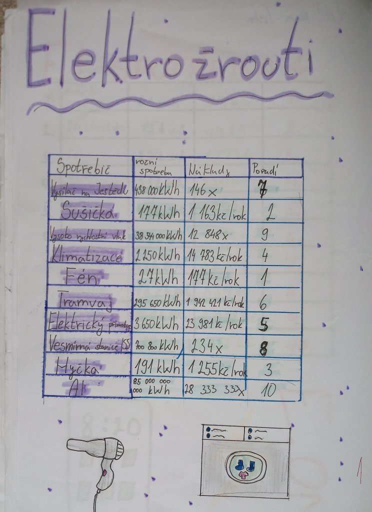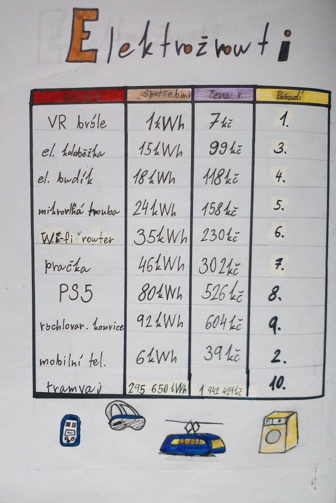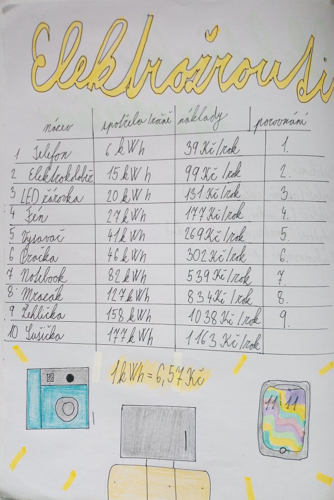 Krátké úvodní video je seznámilo se spotřebou energie. Následovalo prostudování infografiky s různými spotřebiči či elektrickými zařízeními. Své znalosti si ověřili kvízovými otázkami přímo v aplikaci. Vybrané "elektrožrouty" zapsali do přehledné tabulky a doplnili vlastními obrázky.