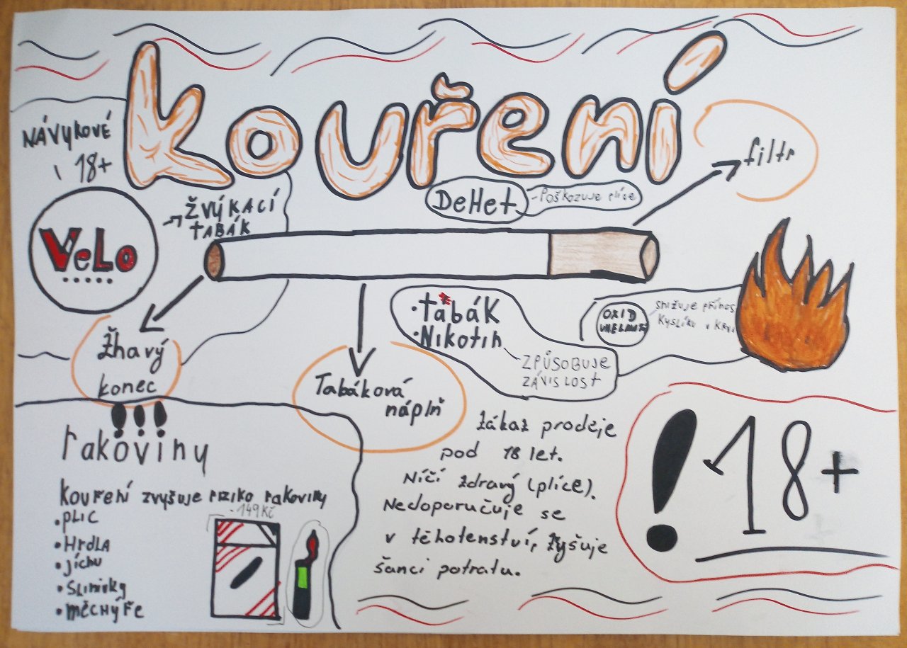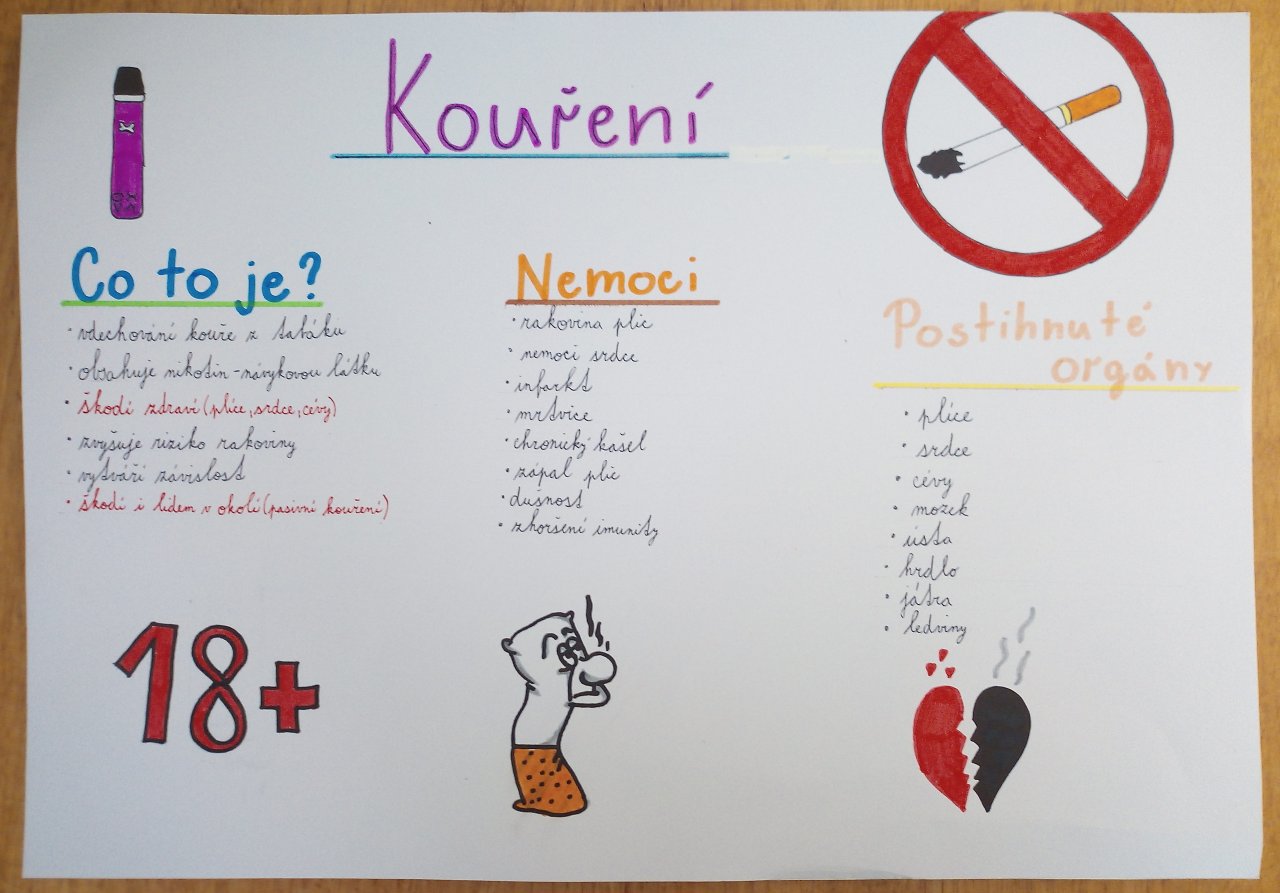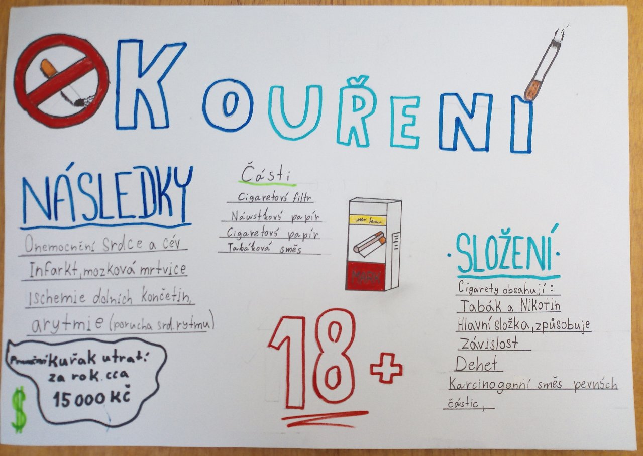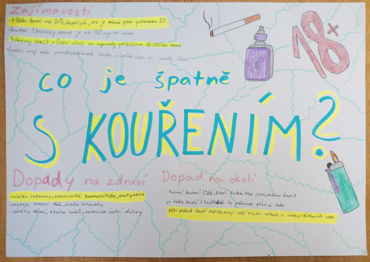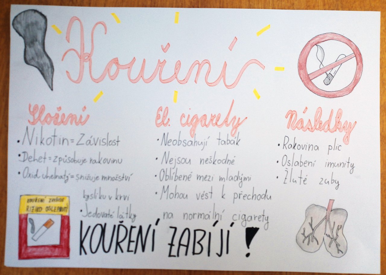 Datum: 16. 1. 2026V hodině výchovy ke zdraví se žáci 9. třídy věnovali tématu „Kouření a jeho vliv na zdraví“. Pracovali ve skupinách, ve kterých vytvářeli plakáty doplněné vlastními obrázky a nápaditými slogany. Výsledky své práce následně představili spolužákům formou krátkých vystoupení. Aktivita vedla k diskuzi o rizicích kouření a pomohla žákům lépe pochopit dopady závislosti na zdraví i každodenní život.