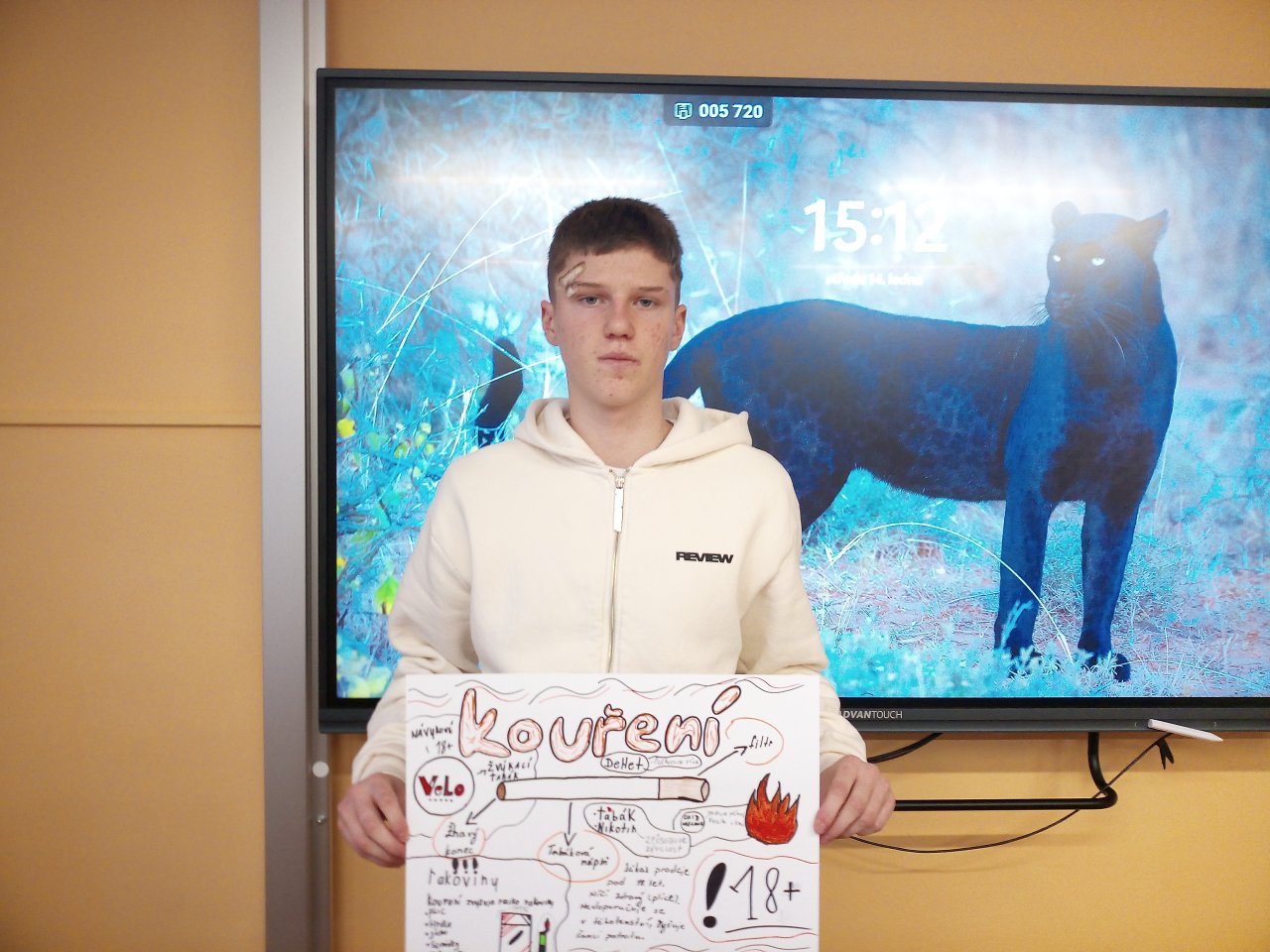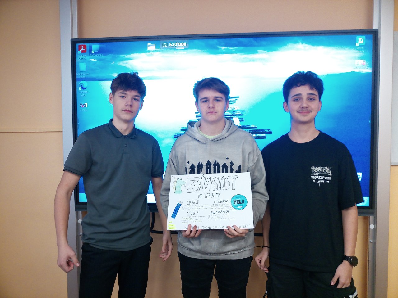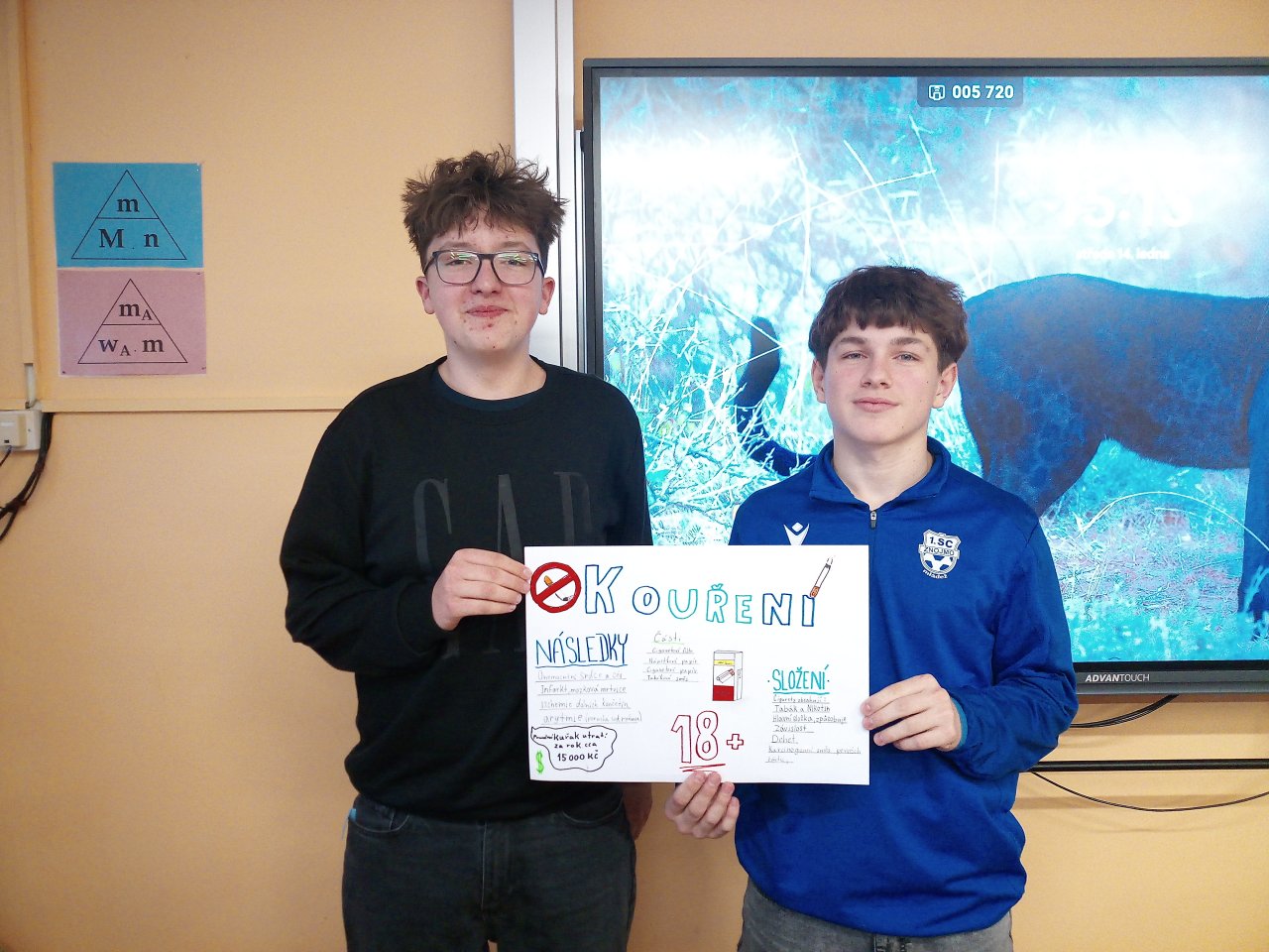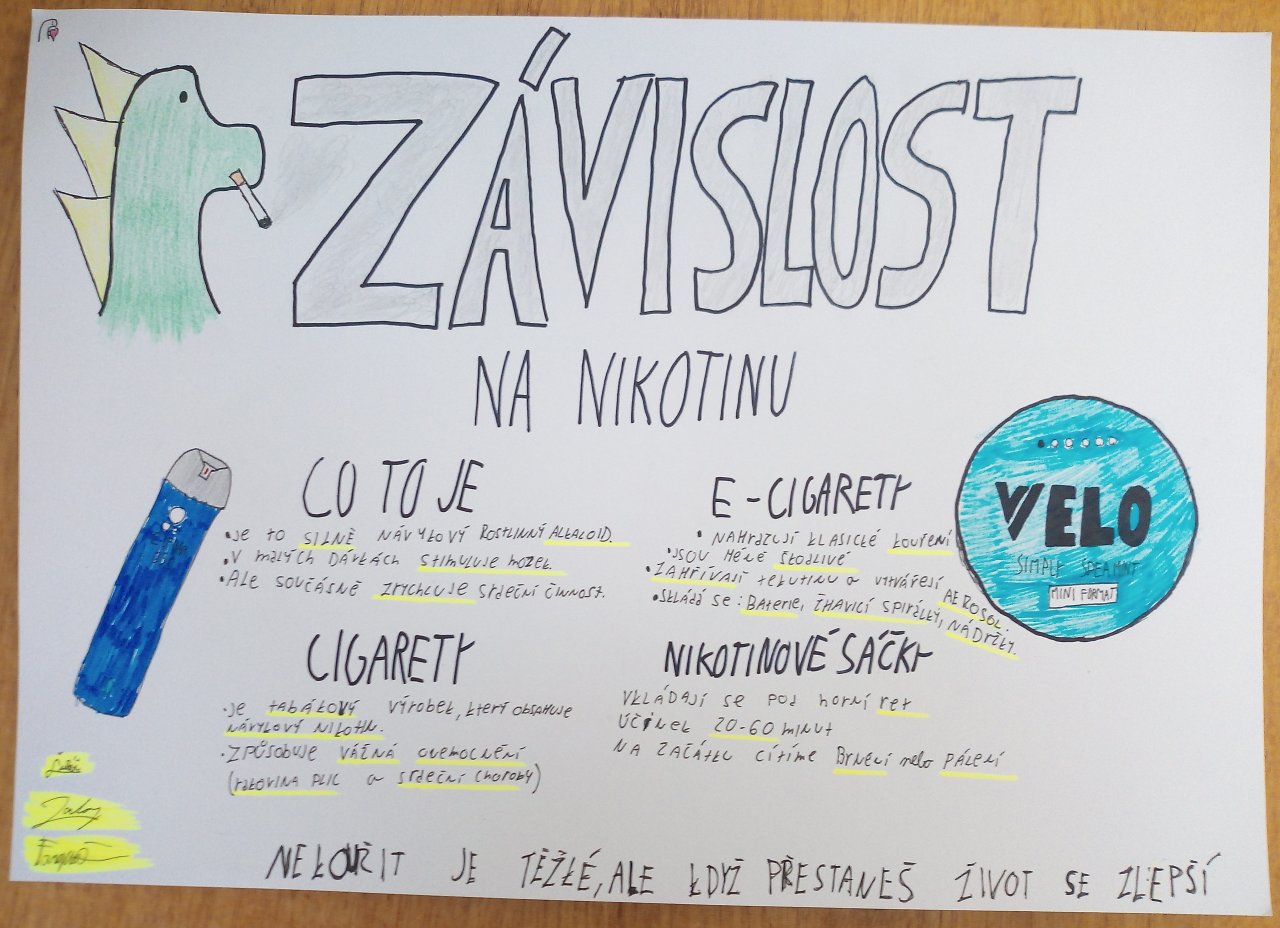 Datum: 16. 1. 2026V hodině výchovy ke zdraví se žáci 9. třídy věnovali tématu „Kouření a jeho vliv na zdraví“. Pracovali ve skupinách, ve kterých vytvářeli plakáty doplněné vlastními obrázky a nápaditými slogany. Výsledky své práce následně představili spolužákům formou krátkých vystoupení. Aktivita vedla k diskuzi o rizicích kouření a pomohla žákům lépe pochopit dopady závislosti na zdraví i každodenní život.