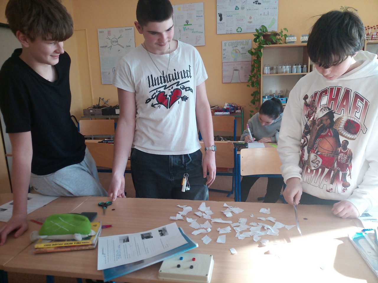 Zajímavým pozorováním bylo i elektrování balónku – po tření se přilepil na zeď nebo přitahoval drobné kousky papíru. Žáci si tak názorně ukázali, že elektrické pole působí i na dálku.