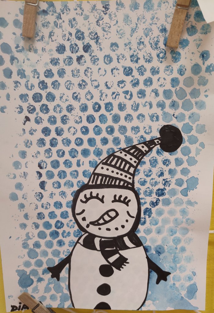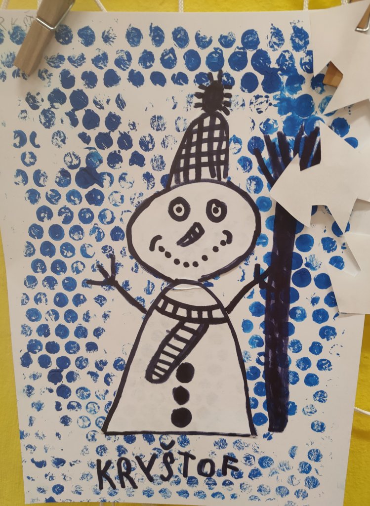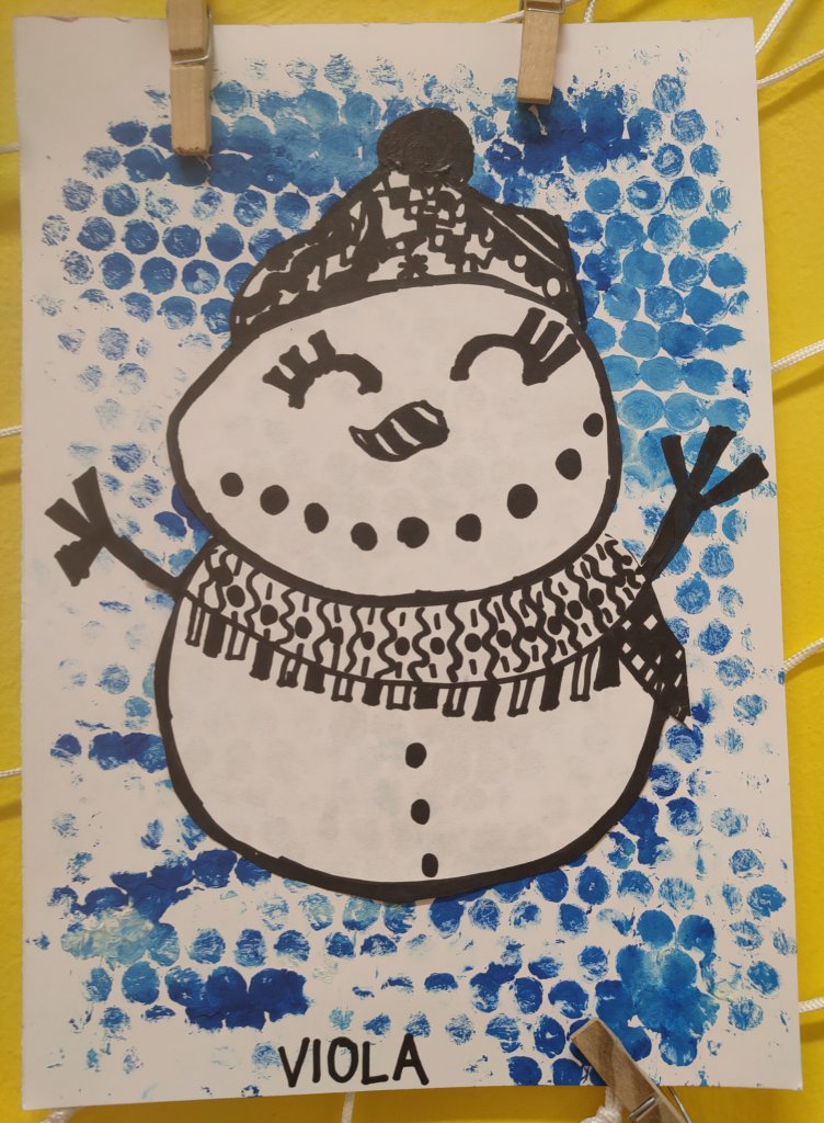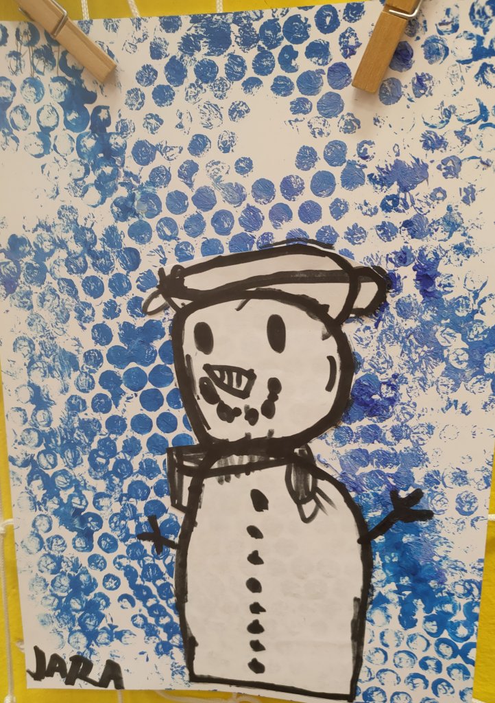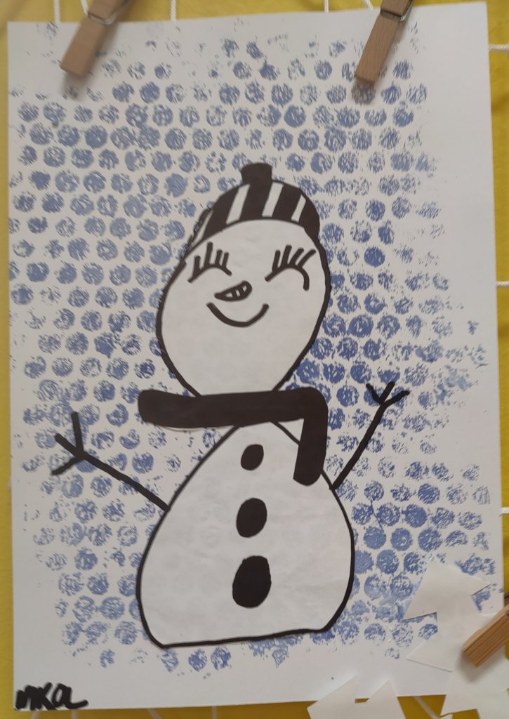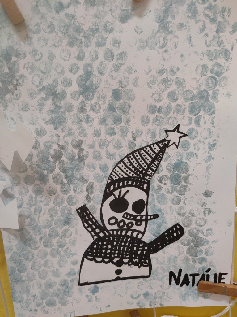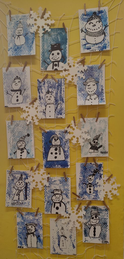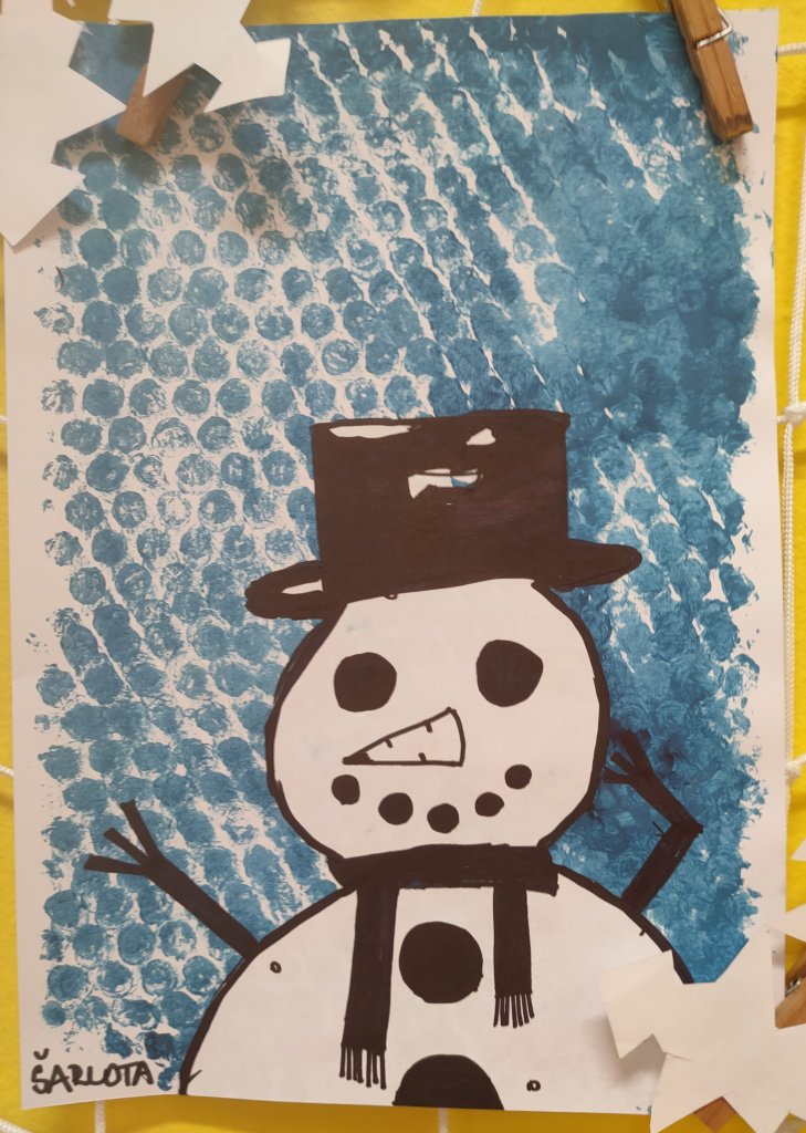 Žáci vytvořili zimní sněhuláky kombinovanou technikou – otiskem bublinové folie a dokreslení černým fixem. Folie vytvořila zajímavou strukturu připomínající sníh, černý fix dodal sněhulákům jejich detaily.