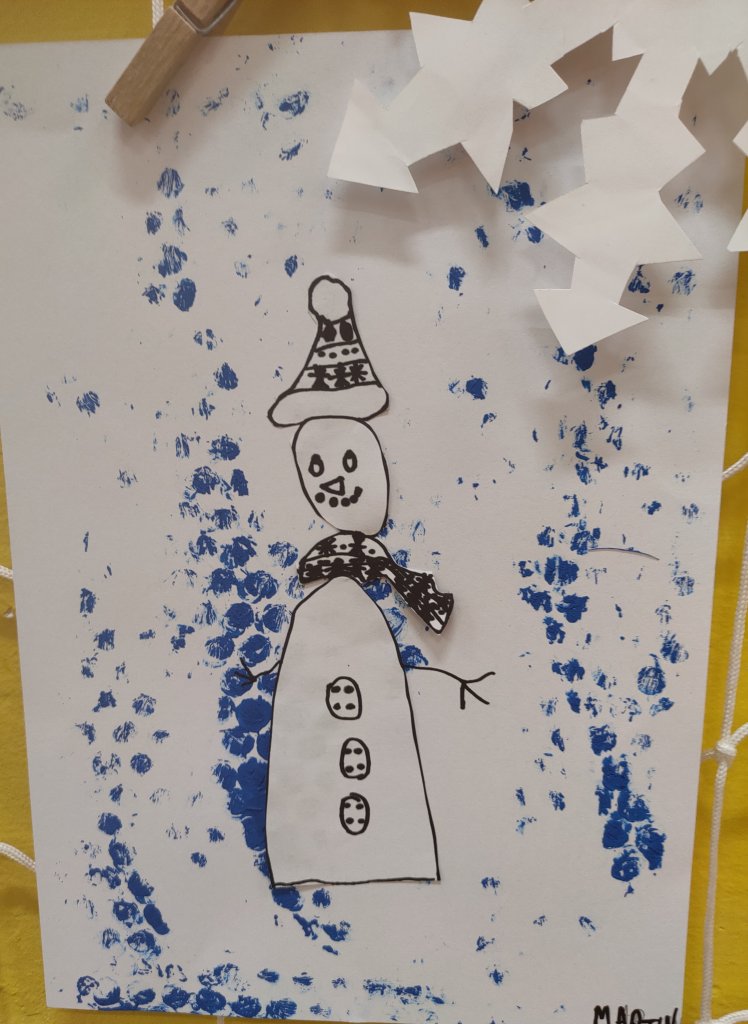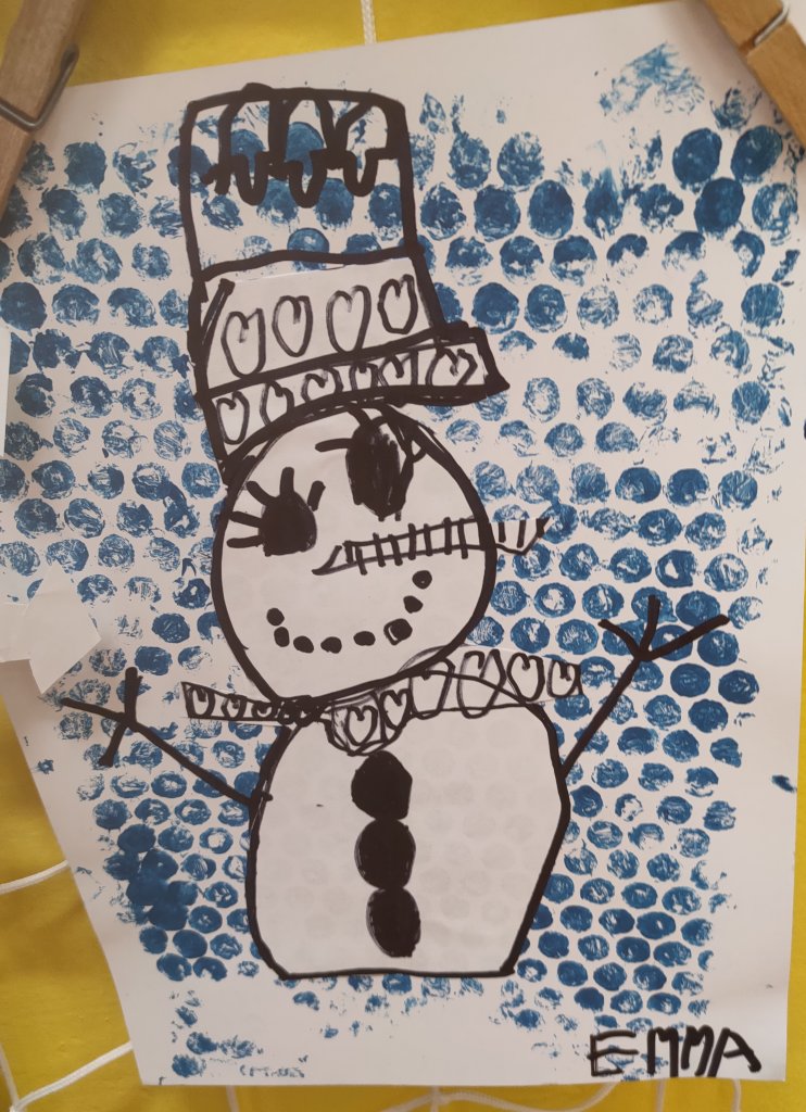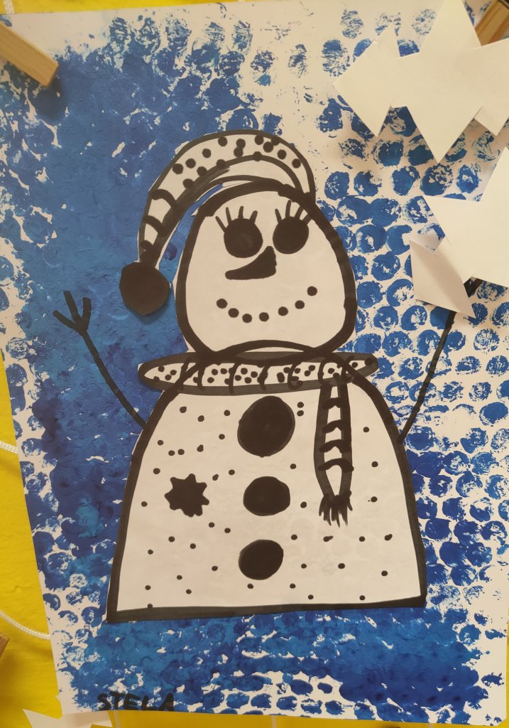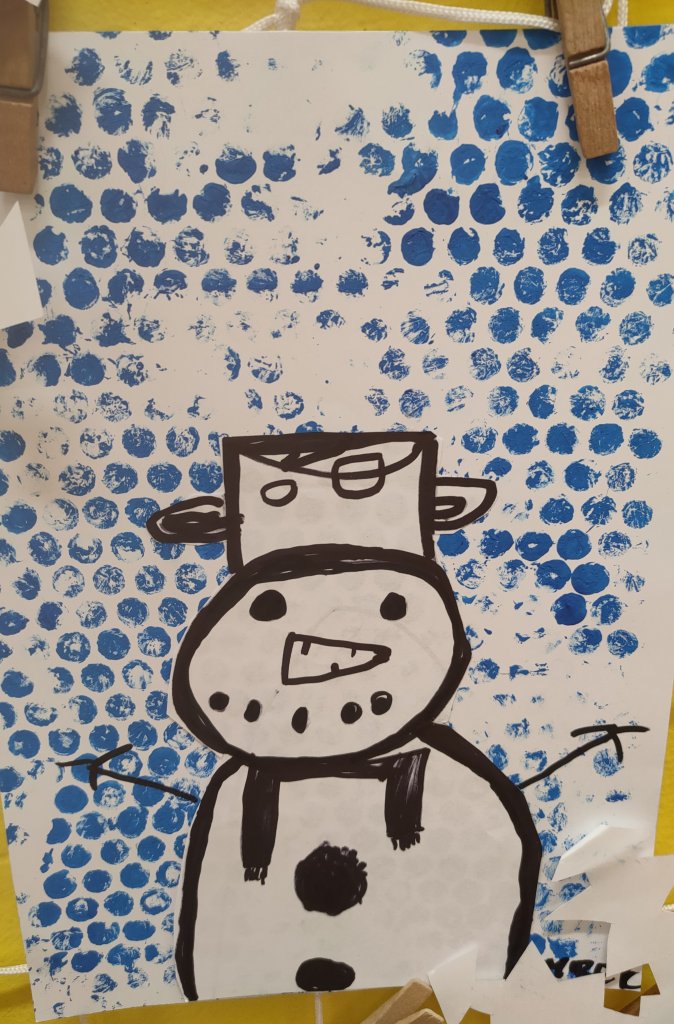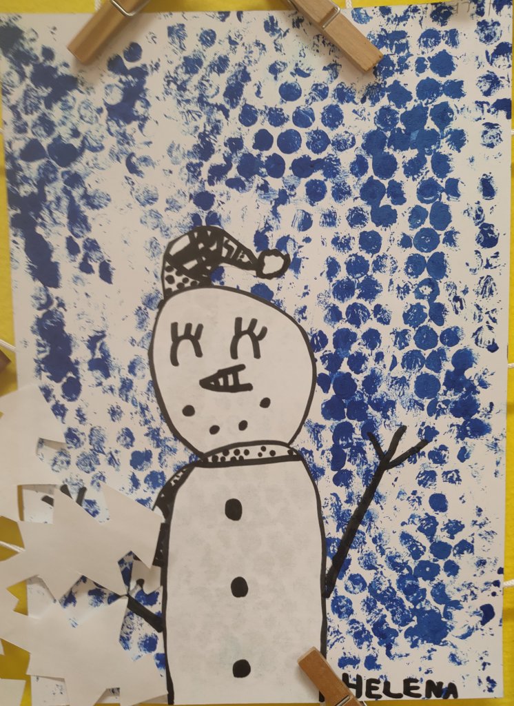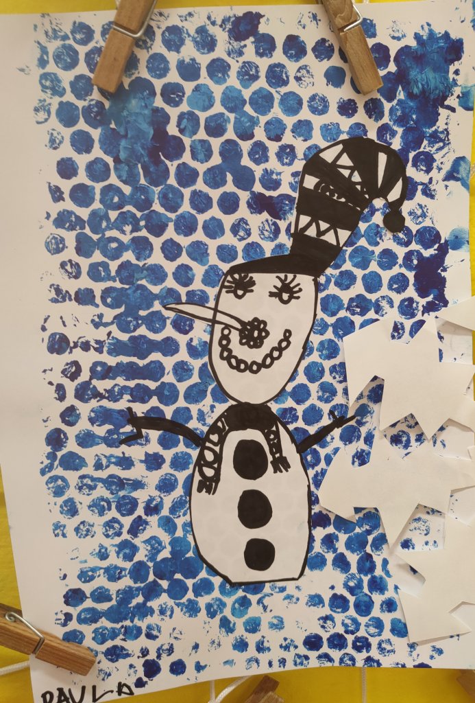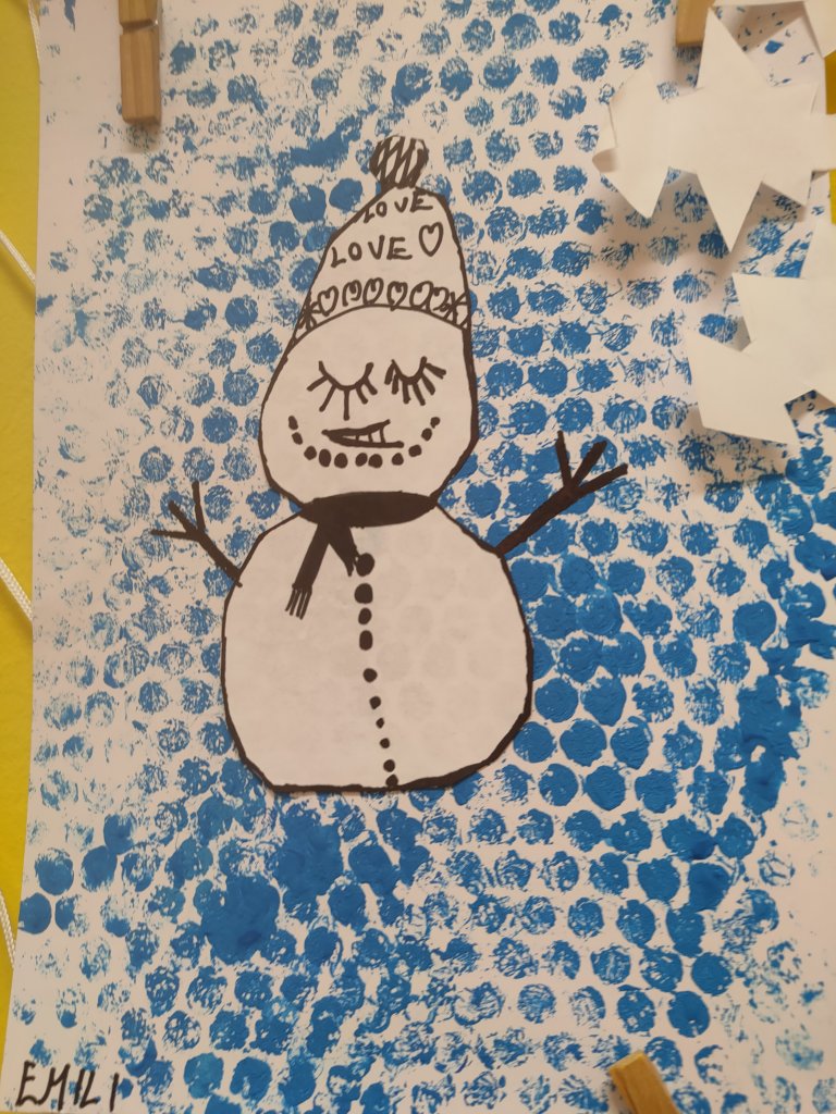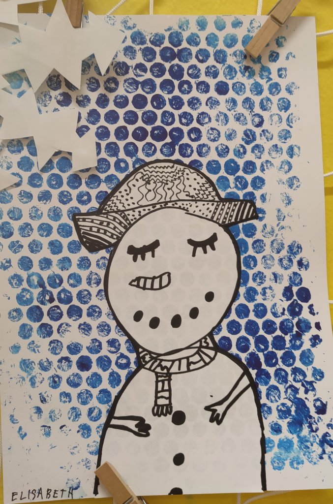 Žáci vytvořili zimní sněhuláky kombinovanou technikou – otiskem bublinové folie a dokreslení černým fixem. Folie vytvořila zajímavou strukturu připomínající sníh, černý fix dodal sněhulákům jejich detaily.