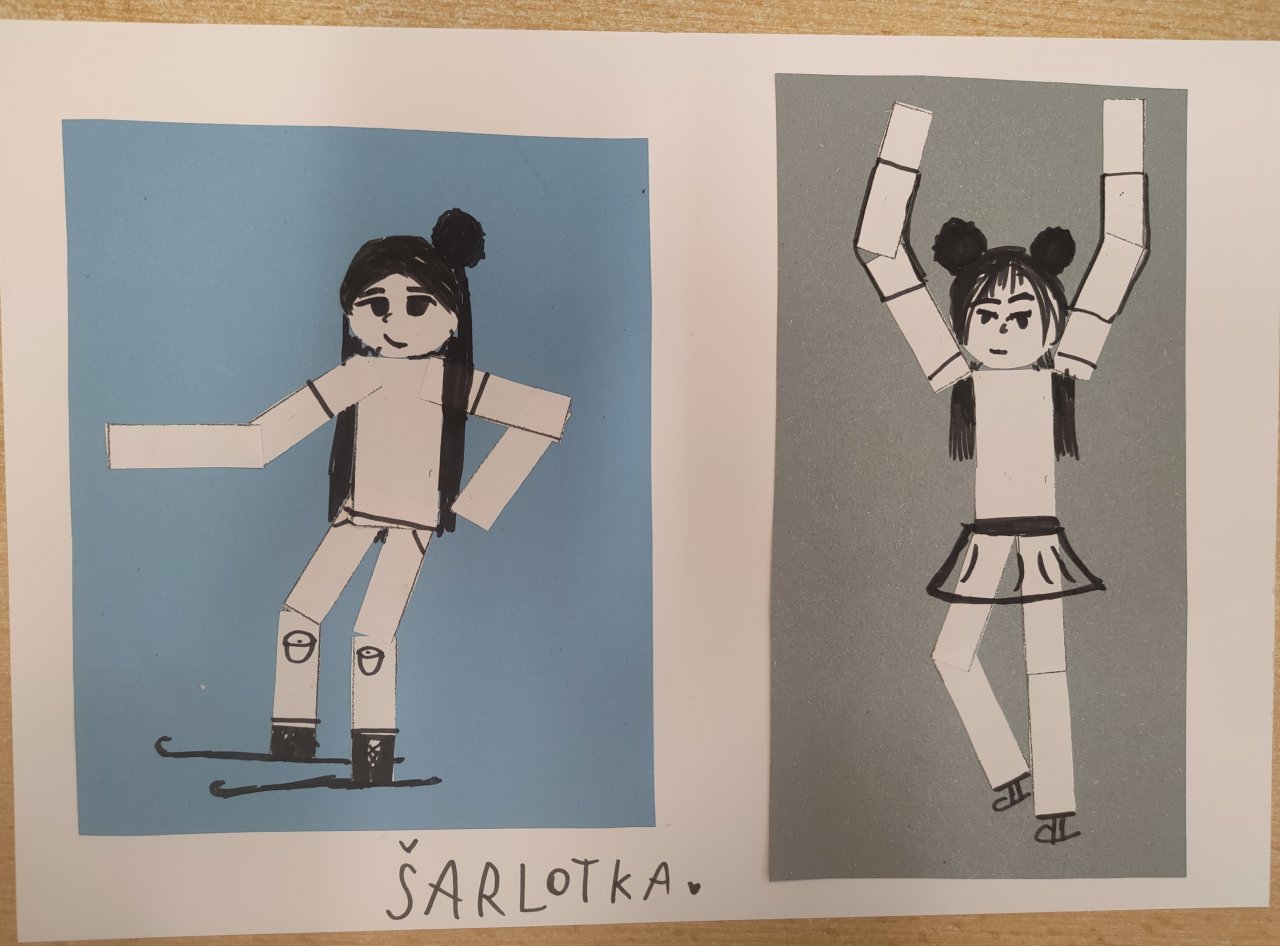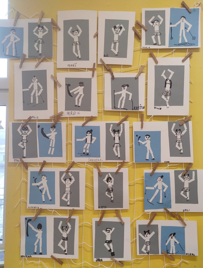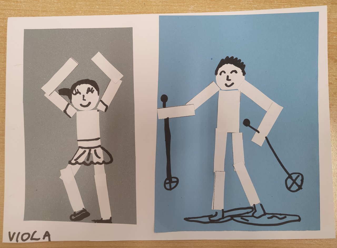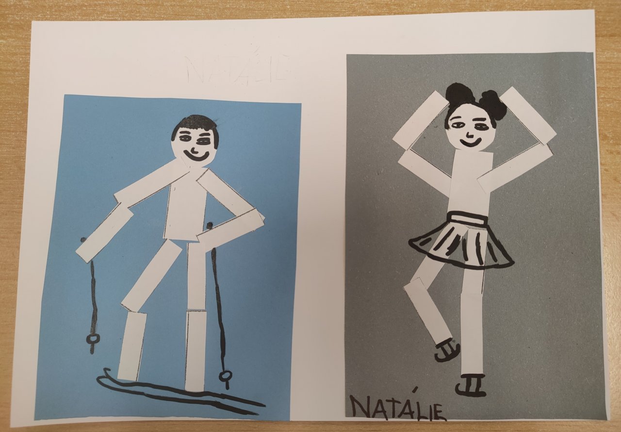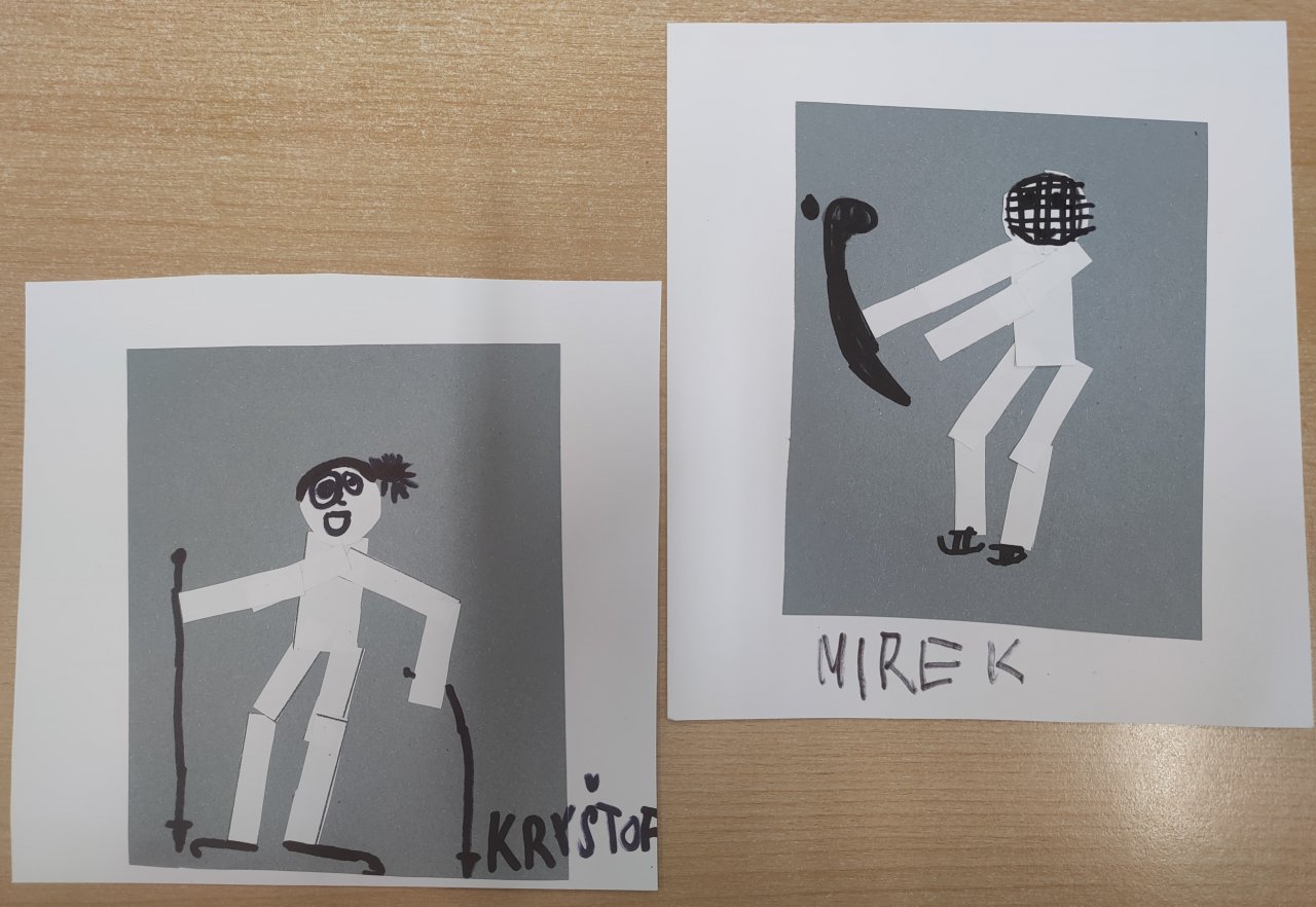 Žáci vystřihovali geometrické tvary a skládali z nich lidské postavy při zimních sportech. Následně postavy dokreslily černým fixem.