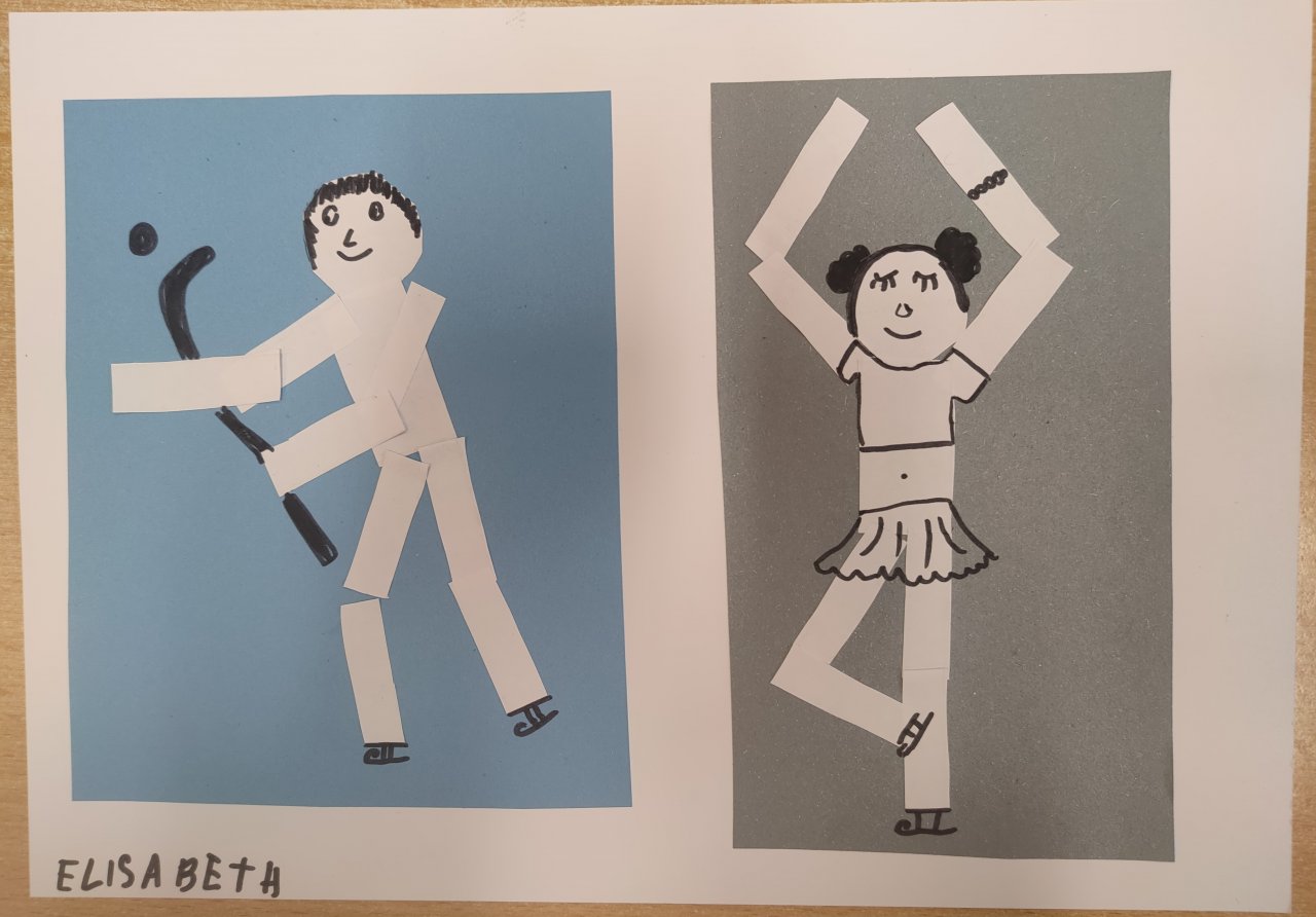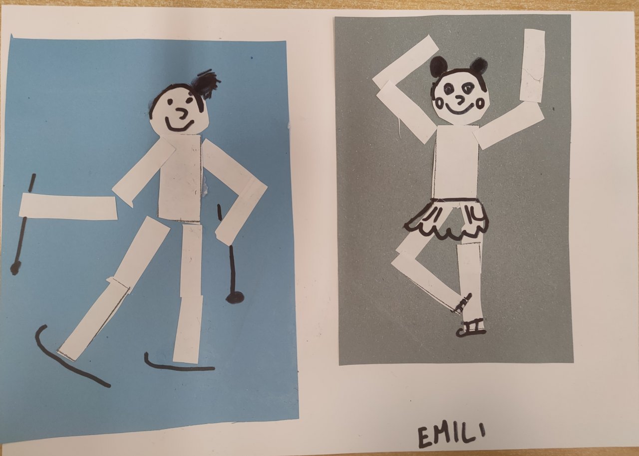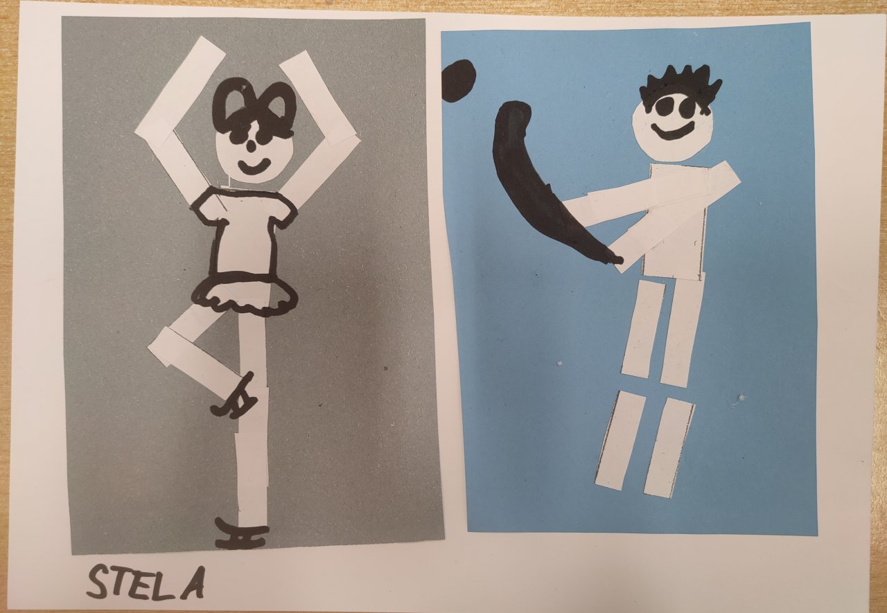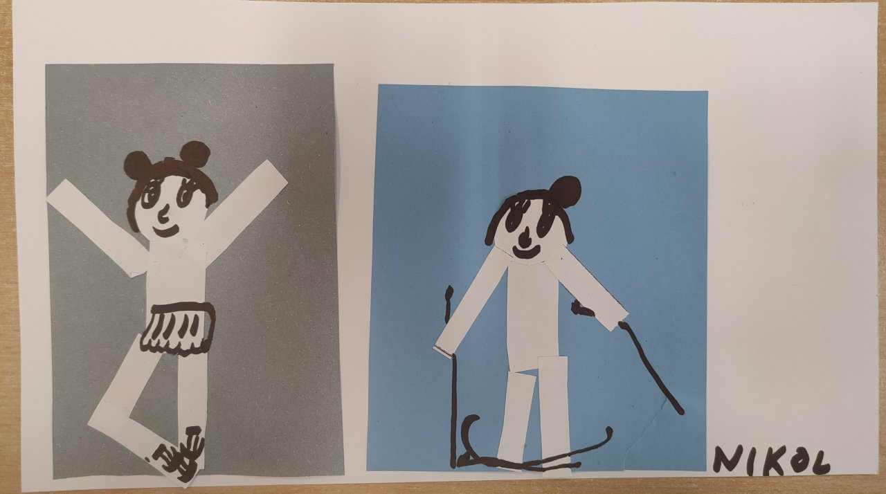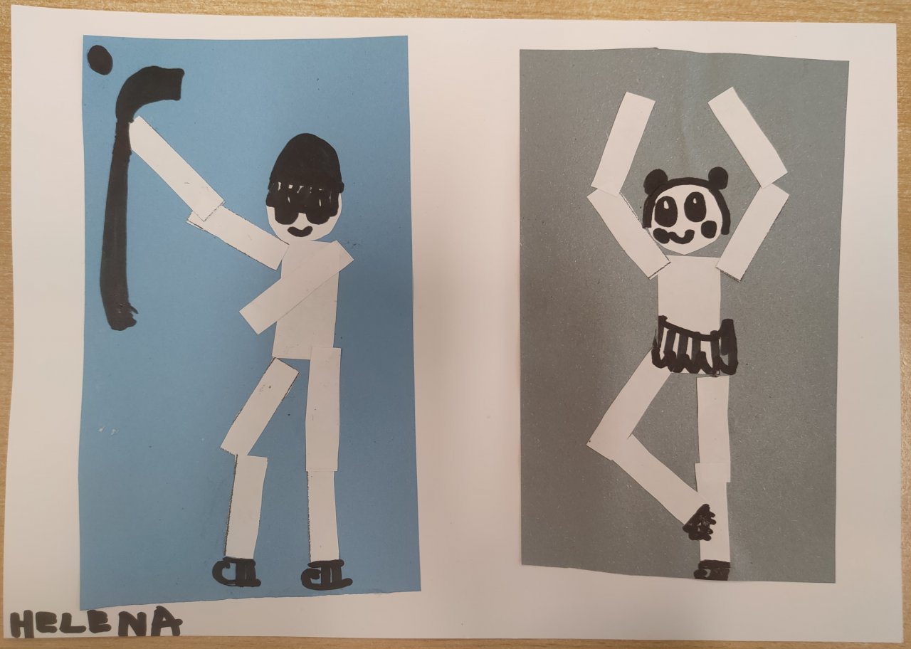 Žáci vystřihovali geometrické tvary a skládali z nich lidské postavy při zimních sportech. Následně postavy dokreslily černým fixem.