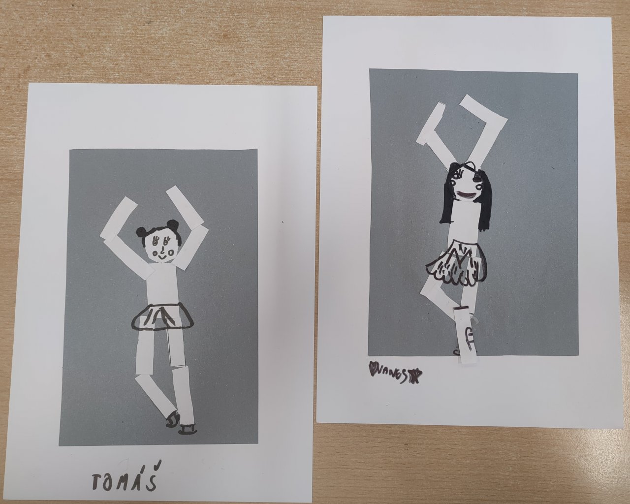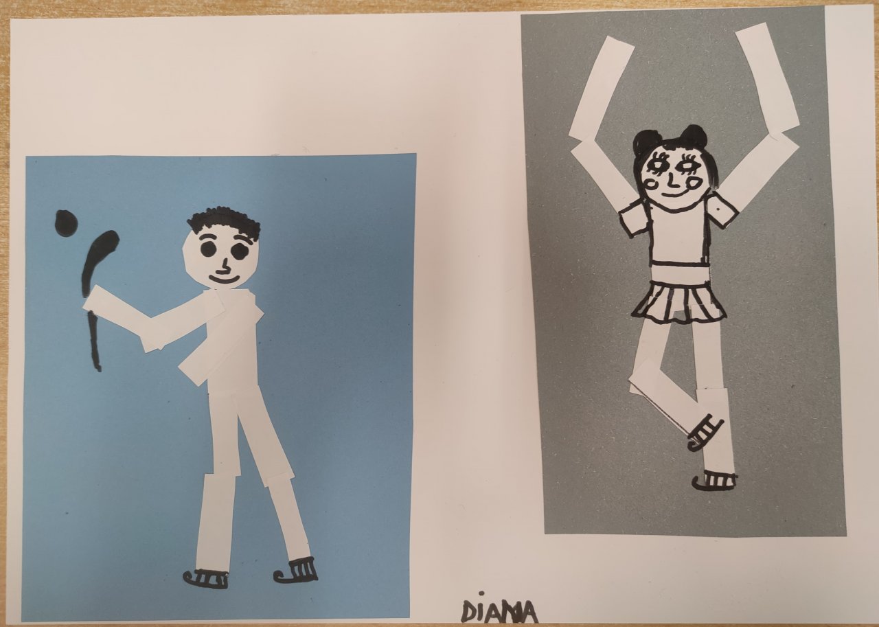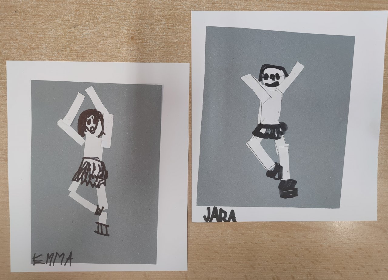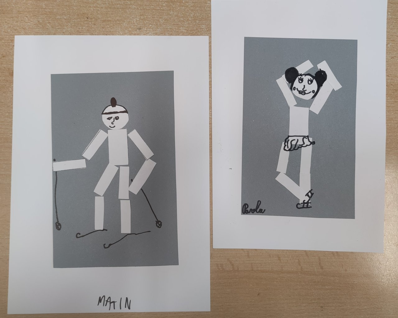 Žáci vystřihovali geometrické tvary a skládali z nich lidské postavy při zimních sportech. Následně postavy dokreslily černým fixem.