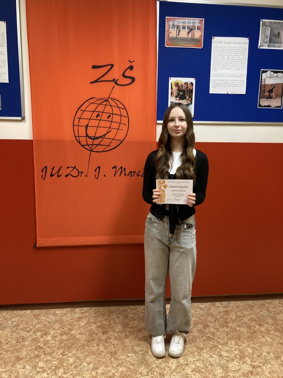 Markéta se s oběma částmi soutěže vyrovnala velmi zodpovědně a svým výkonem důstojně reprezentovala naši školu. Za snahu, pečlivou přípravu i odvahu zúčastnit se okresního kola jí patří poděkování. Věříme, že získané zkušenosti pro ni budou cennou motivací do dalšího studia českého jazyka a přejeme jí mnoho dalších úspěchů.