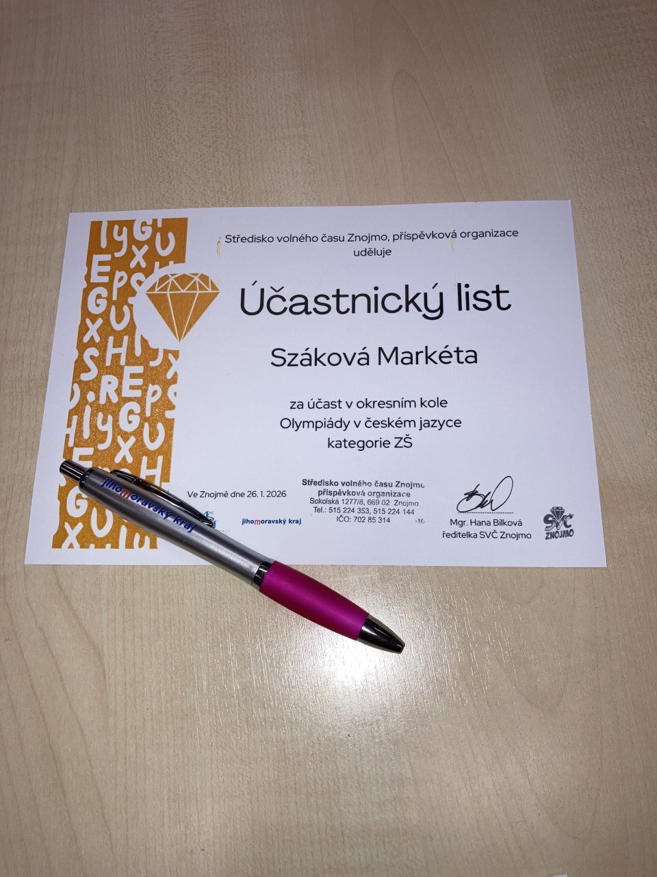 Okresního kola OČJ, které se konalo ve Znojmě v pondělí 26. 1. 2026, se zúčastnila i žákyně naší školy Markéta Száková. Žáci řešili zadané jazykové úkoly (60 minut) a poté psali slohovou práci na téma: Co si pamatuje náš dům.