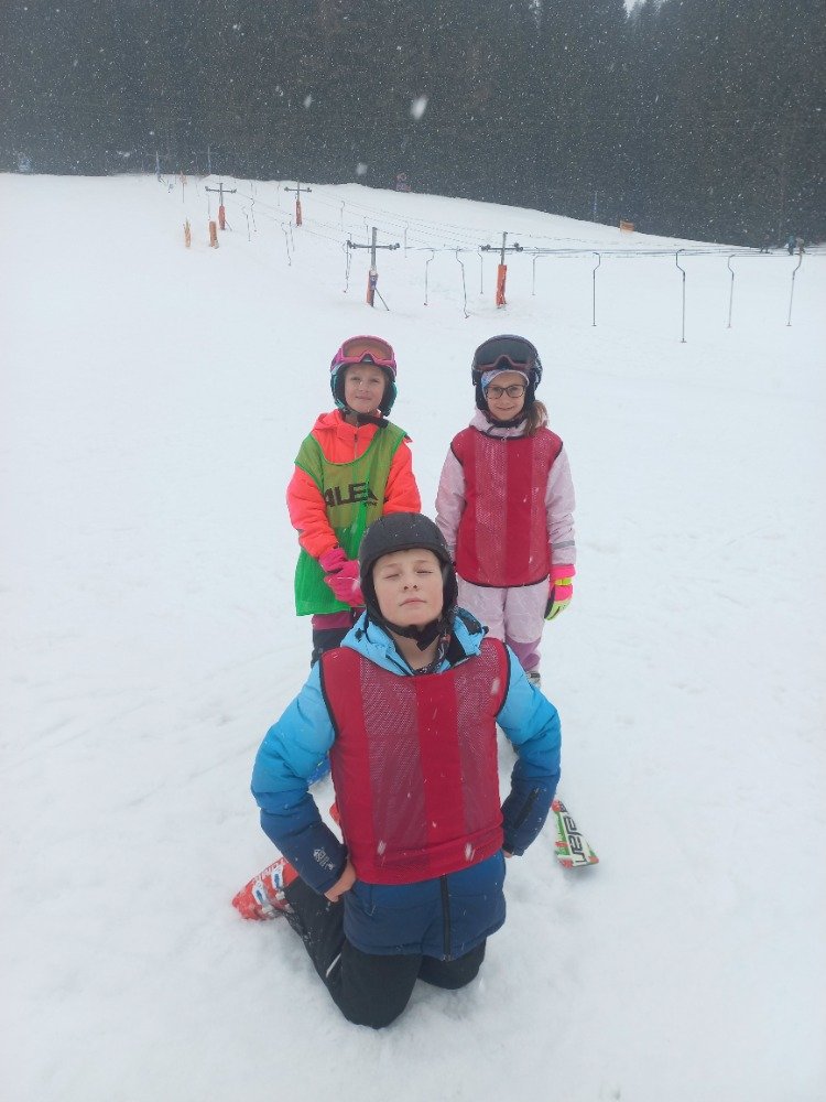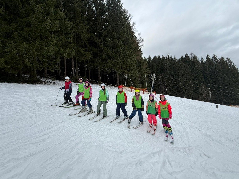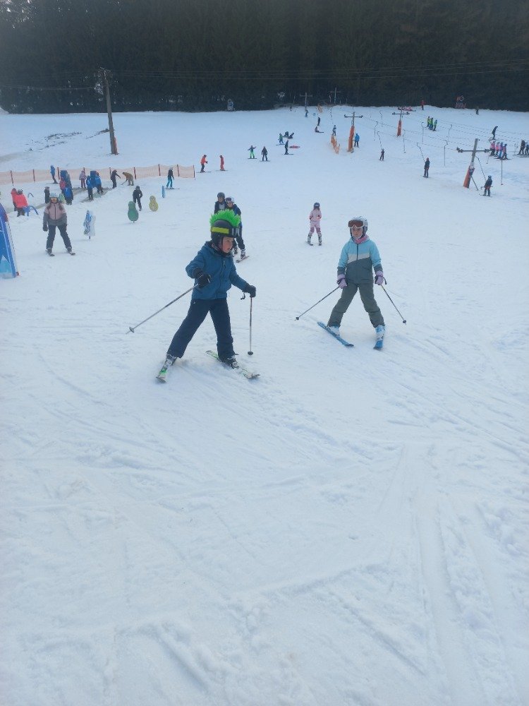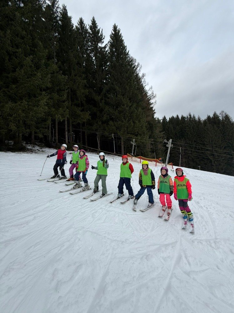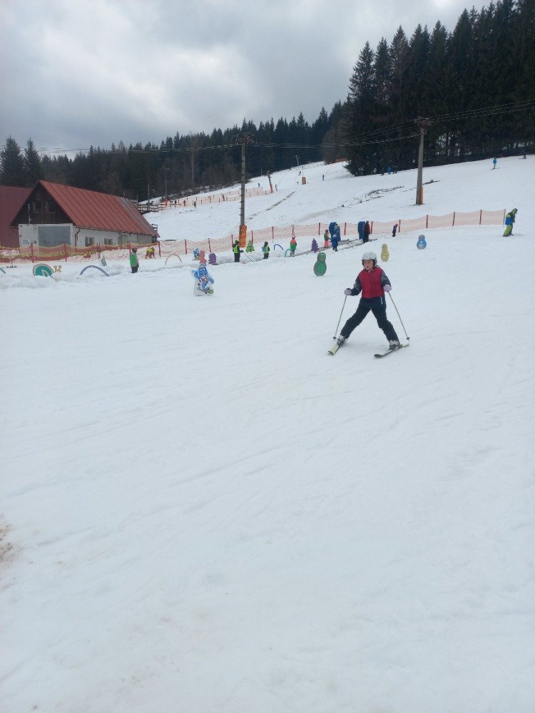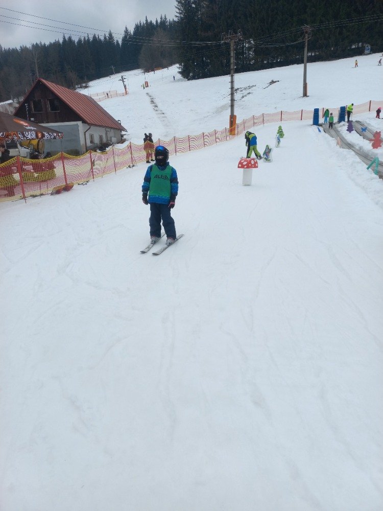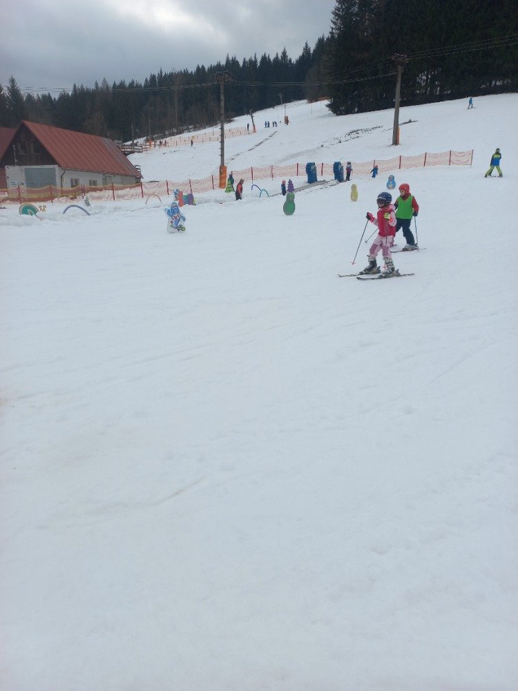 Po rychlém obědě jsme se vydali na svah. Sníh byl místy měkčí, ale všichni zvládli sjet kopec – někdo delší, jiný kratší.
