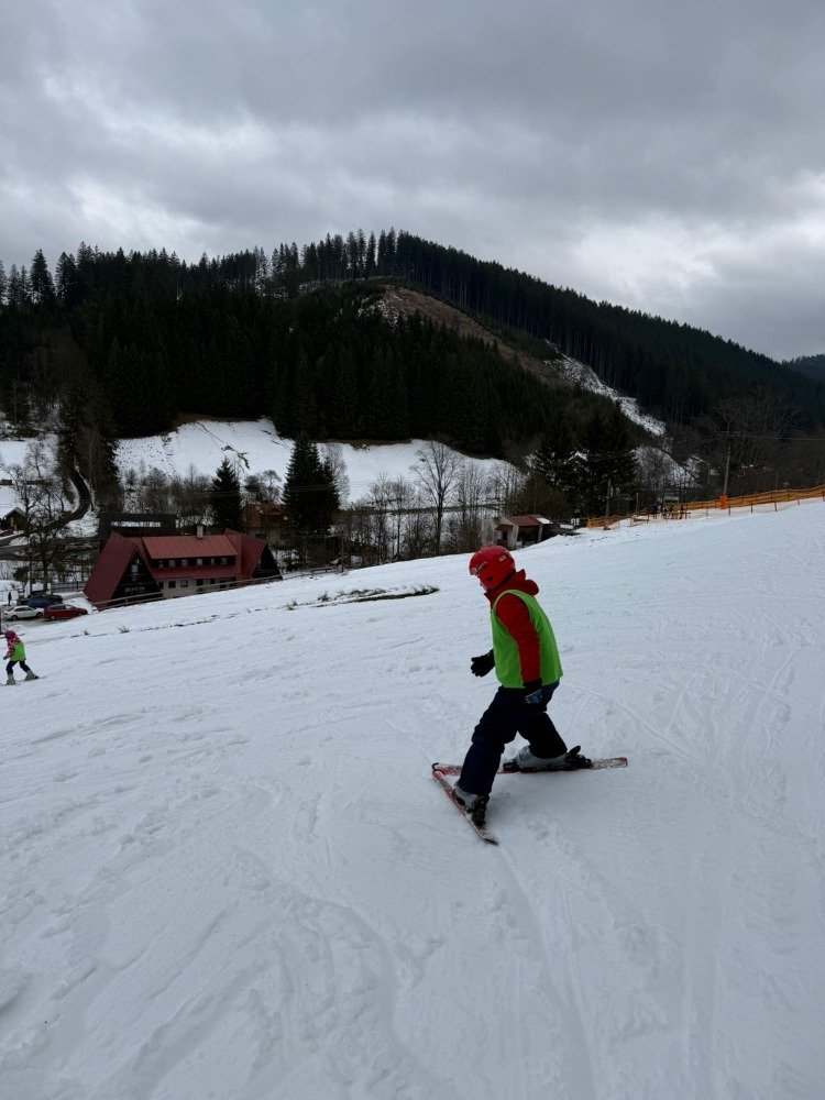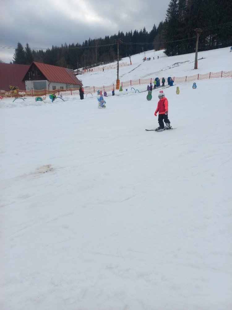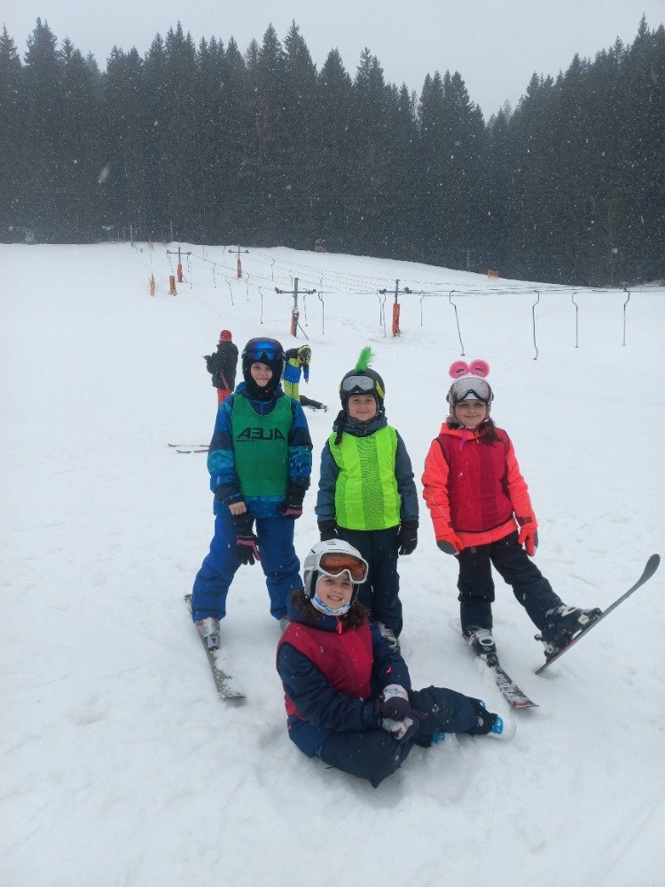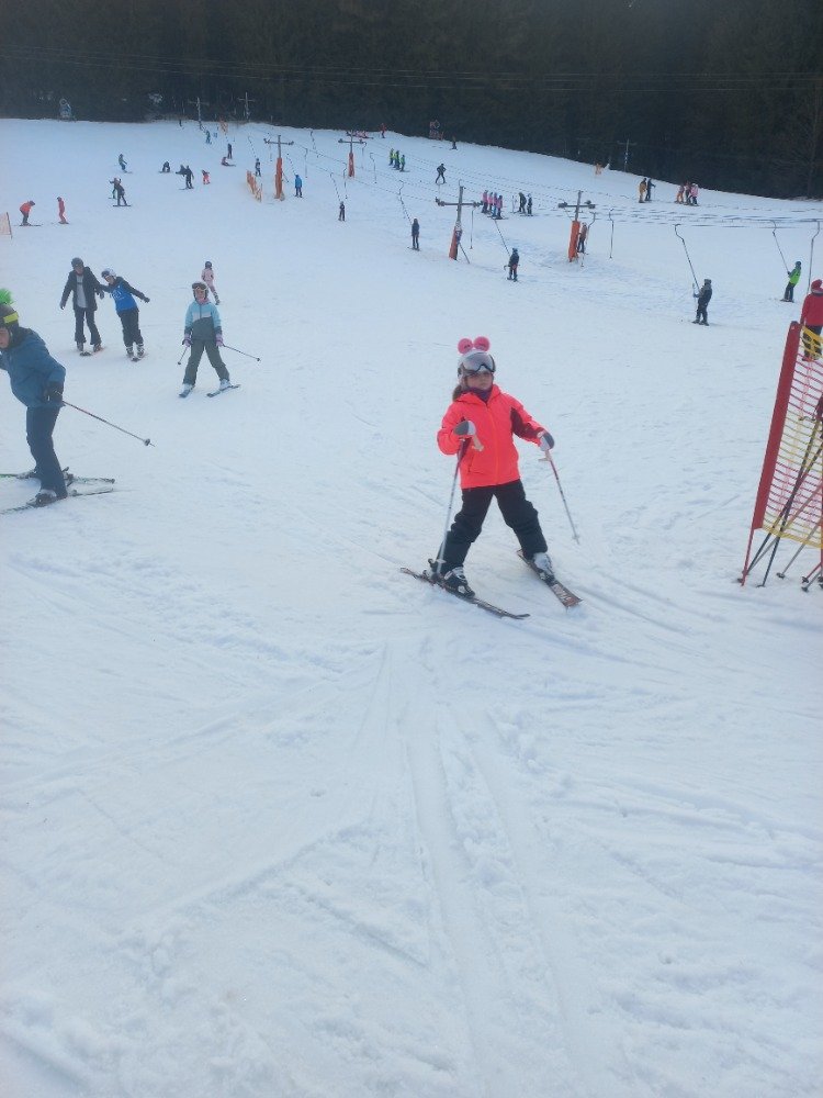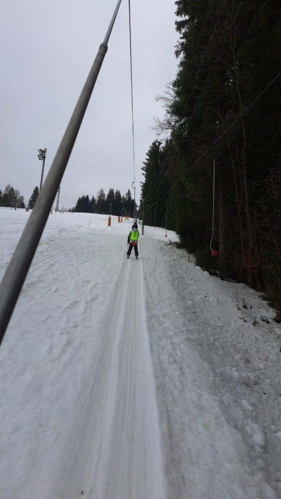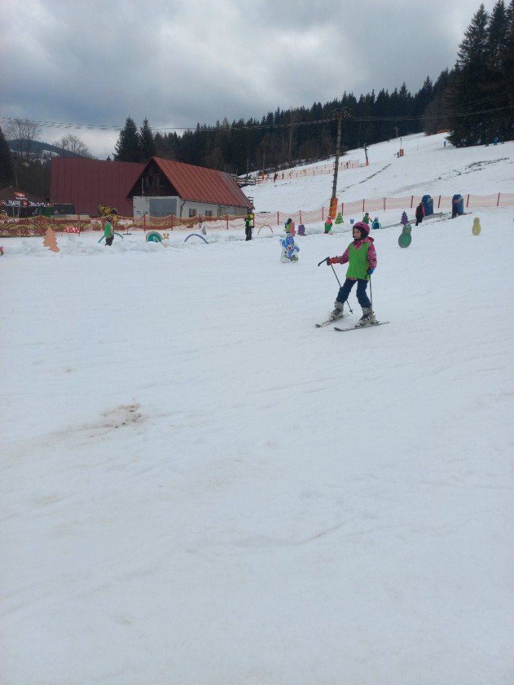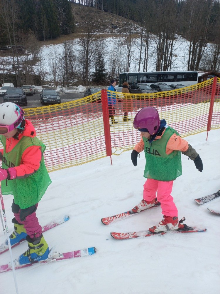Po rychlém obědě jsme se vydali na svah. Sníh byl místy měkčí, ale všichni zvládli sjet kopec – někdo delší, jiný kratší.