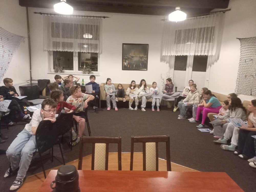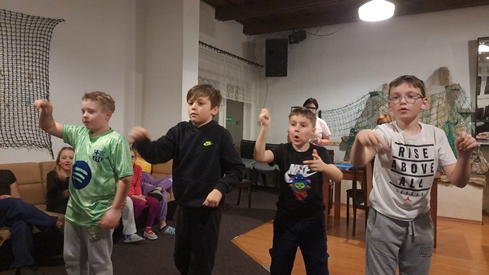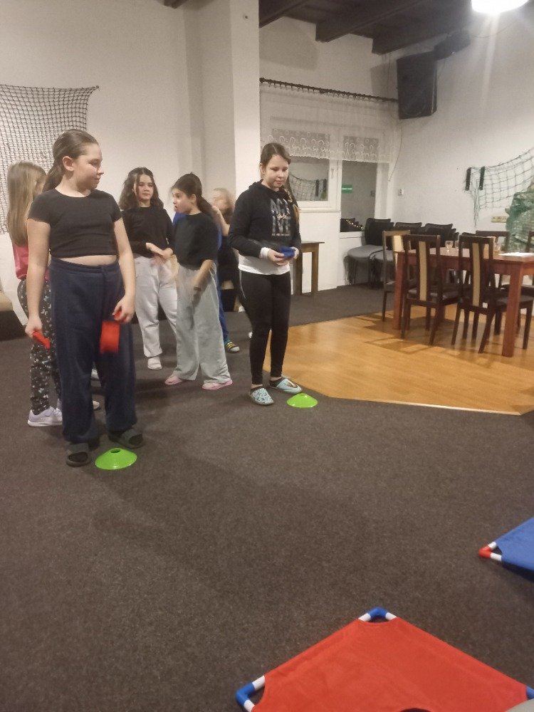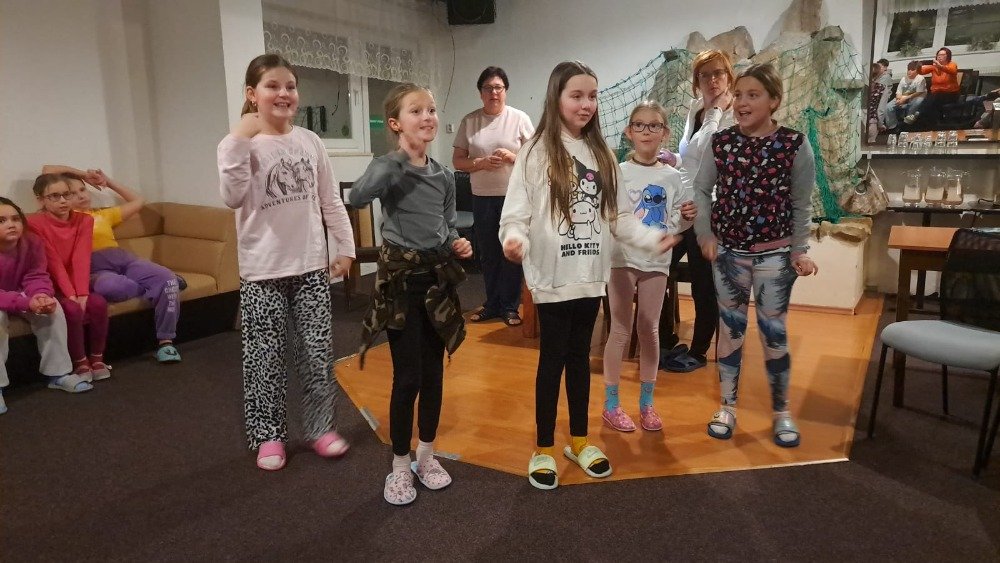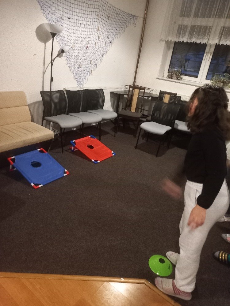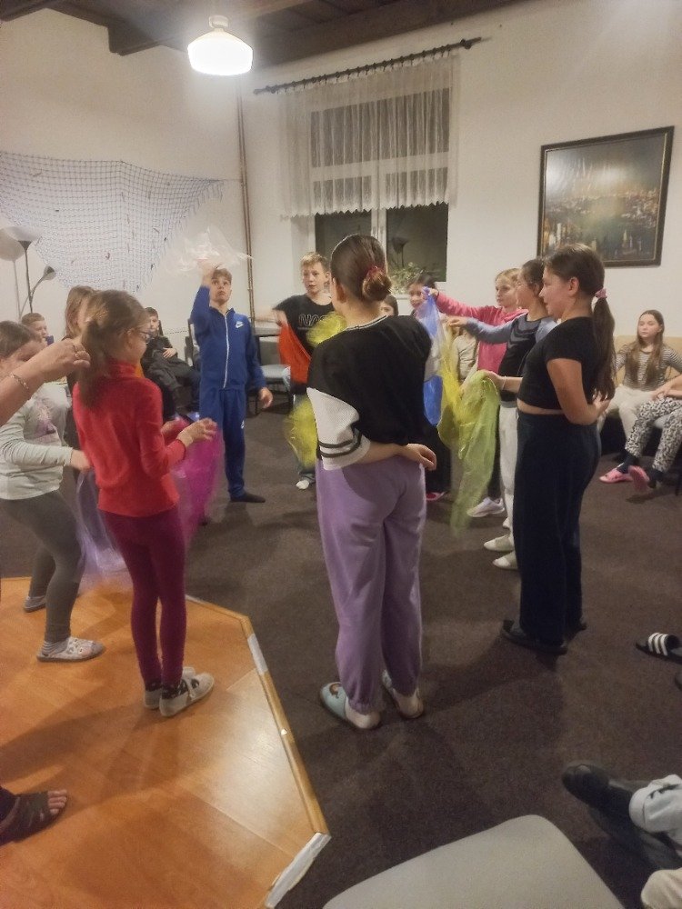 Večerní program byl zaměřený jak na přemýšlení, tak na pohyb. Děti hledaly anglická slovíčka, předváděly pojmy pantomimou a soutěžily ve shazování kelímků míčkem, což je velmi bavilo.