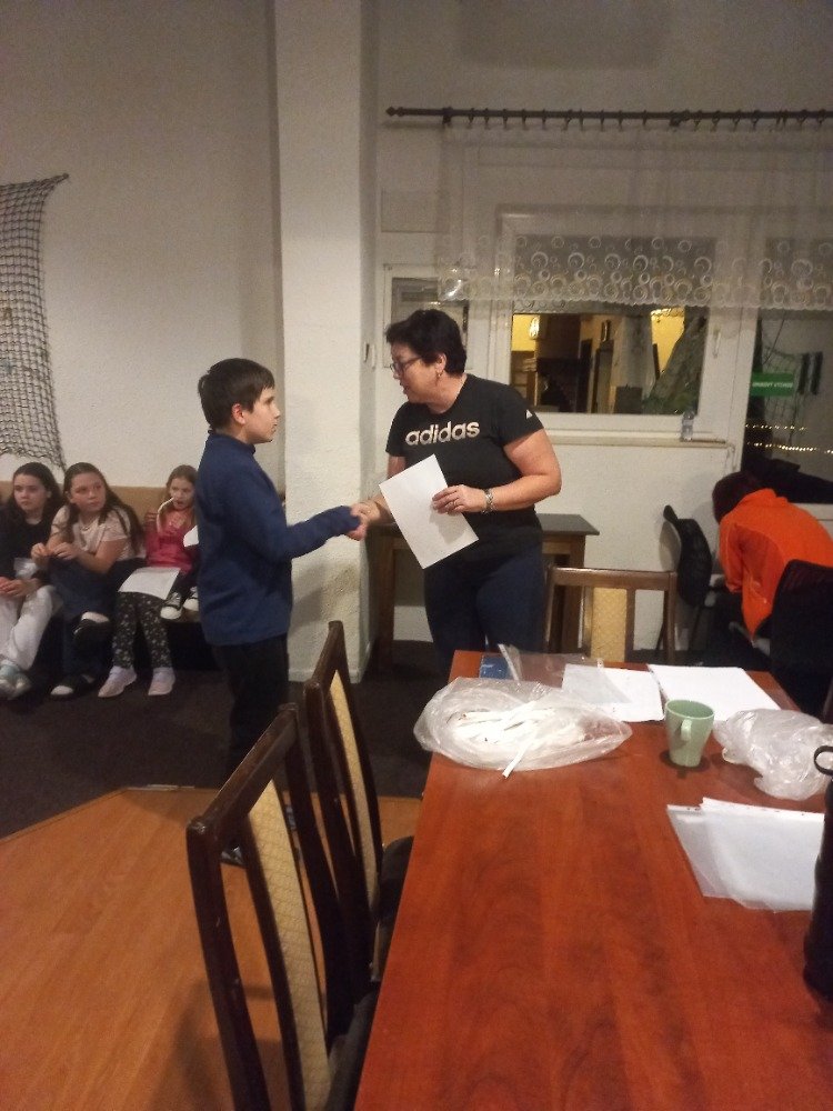Po večeři proběhlo rozdávání vysvědčení a vyhodnocení celopobytové hry, během které děti sbíraly body za aktivity, hry a úklid pokojů. První místo obsadila 3. skupina, druhé místo 2. skupina a třetí místo 1. skupina. Všechny děti obdržely odměny.