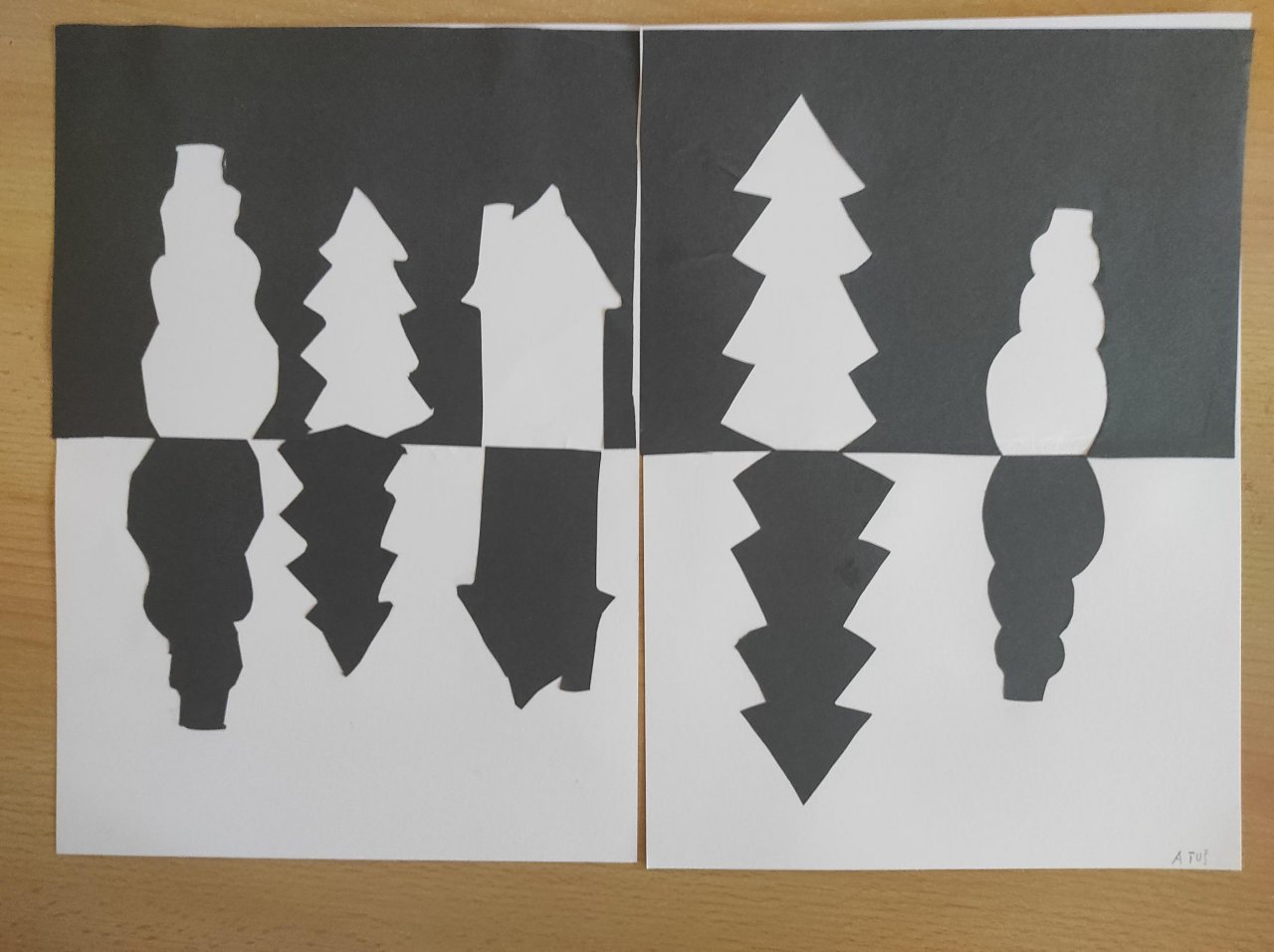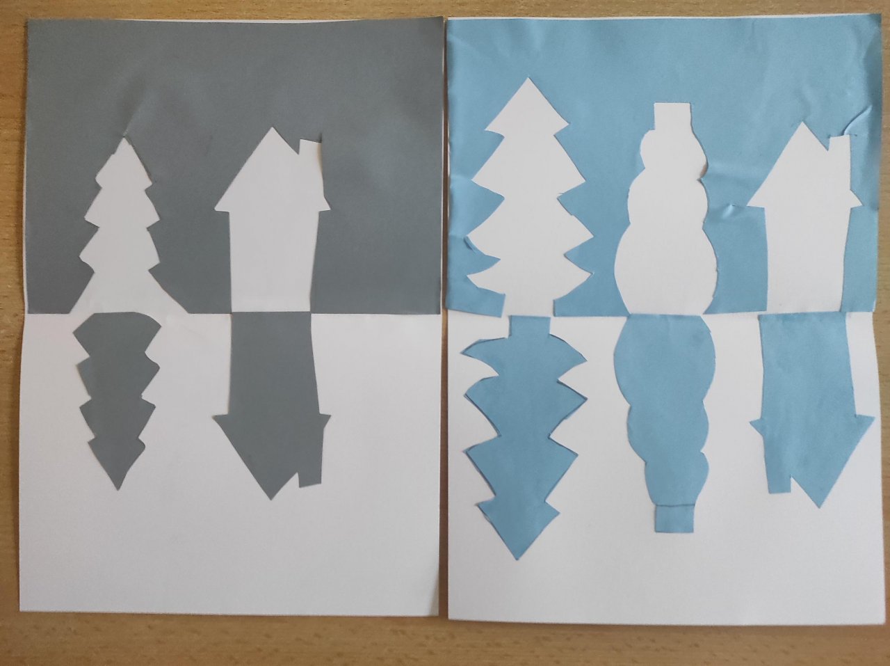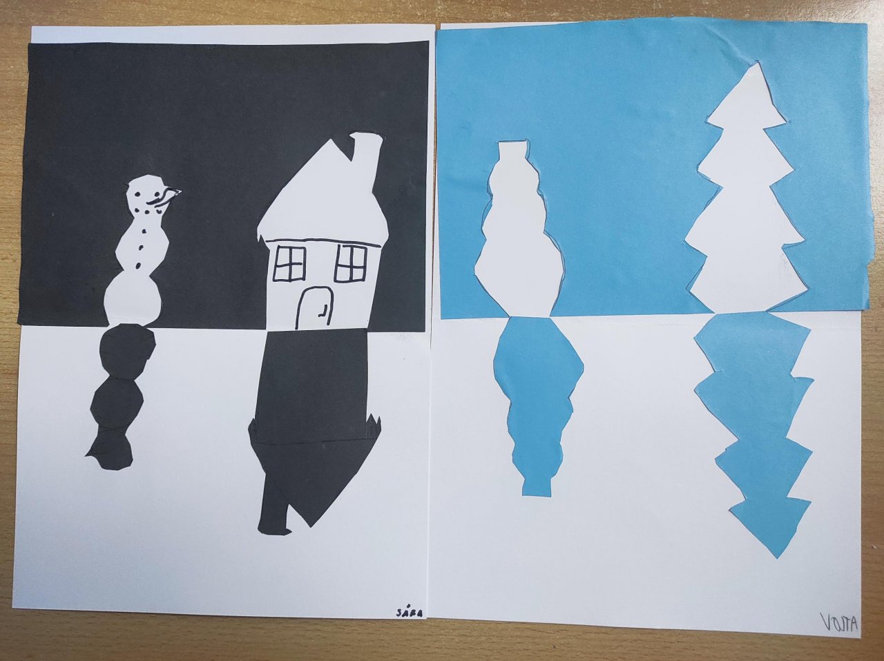 Zimní krajina – vyklápěcí technikou děti vytvořily zimní krajinu, kterou si předkreslily, vystřihly a následně nalepily.