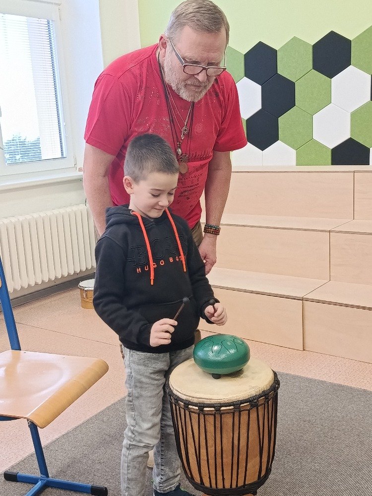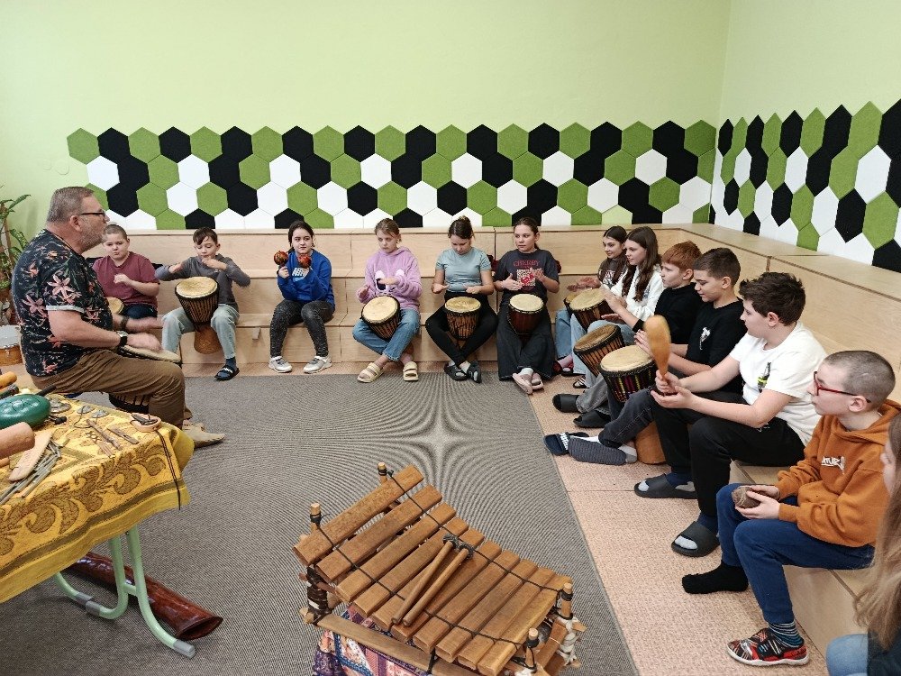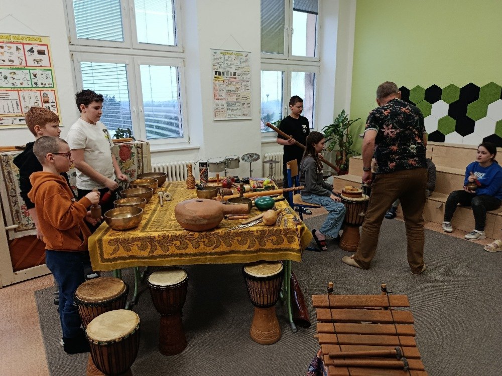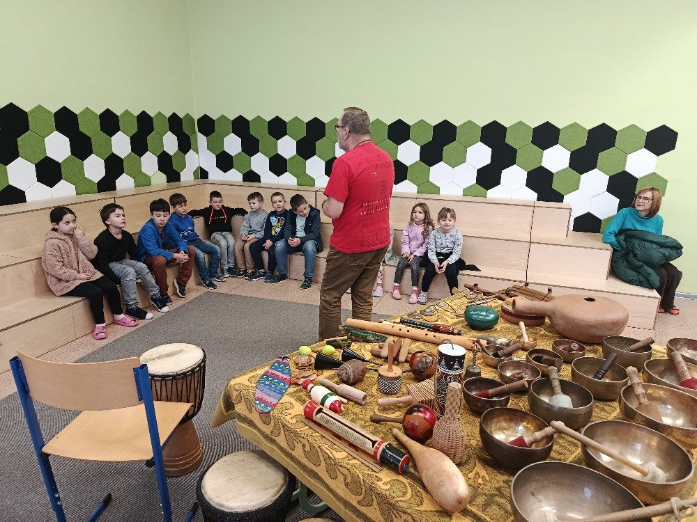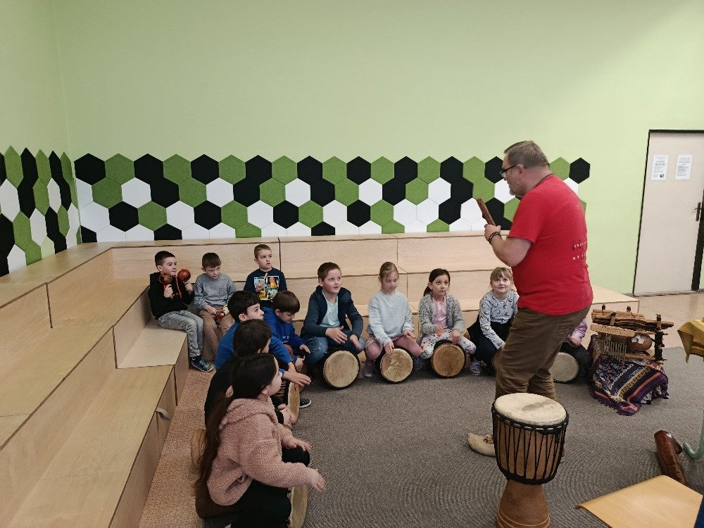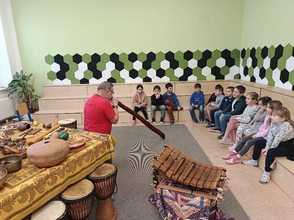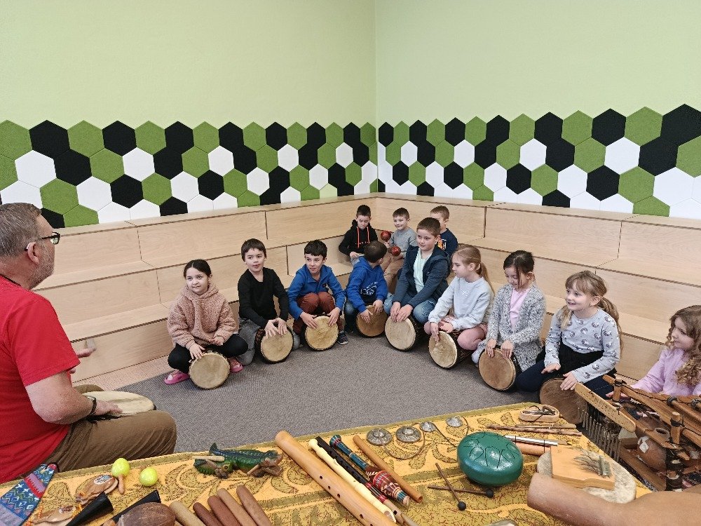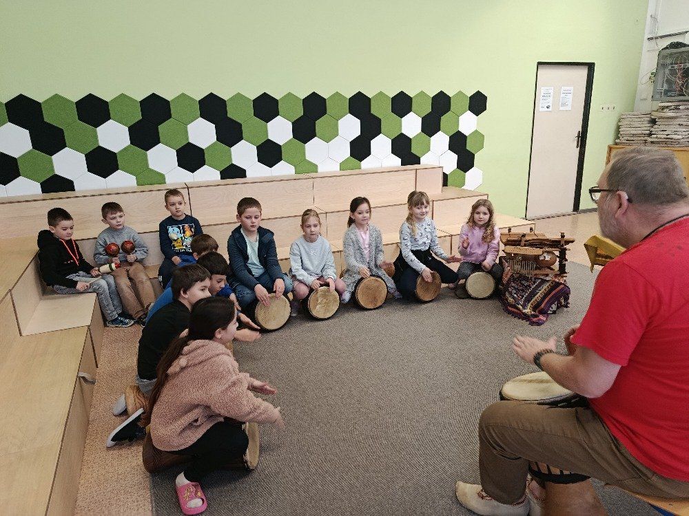 Děti si samy vyzkoušely bubnování a hru na vybrané nástroje, někteří se k hudbě přidali i zpěvem. Setkání bylo pro žáky příjemným a podnětným zážitkem, který podpořil jejich kreativitu i společný prožitek z hudby
