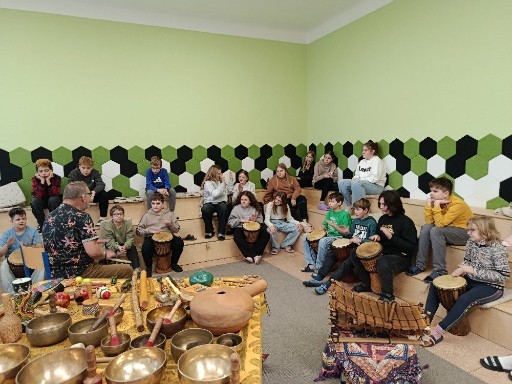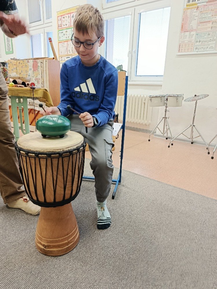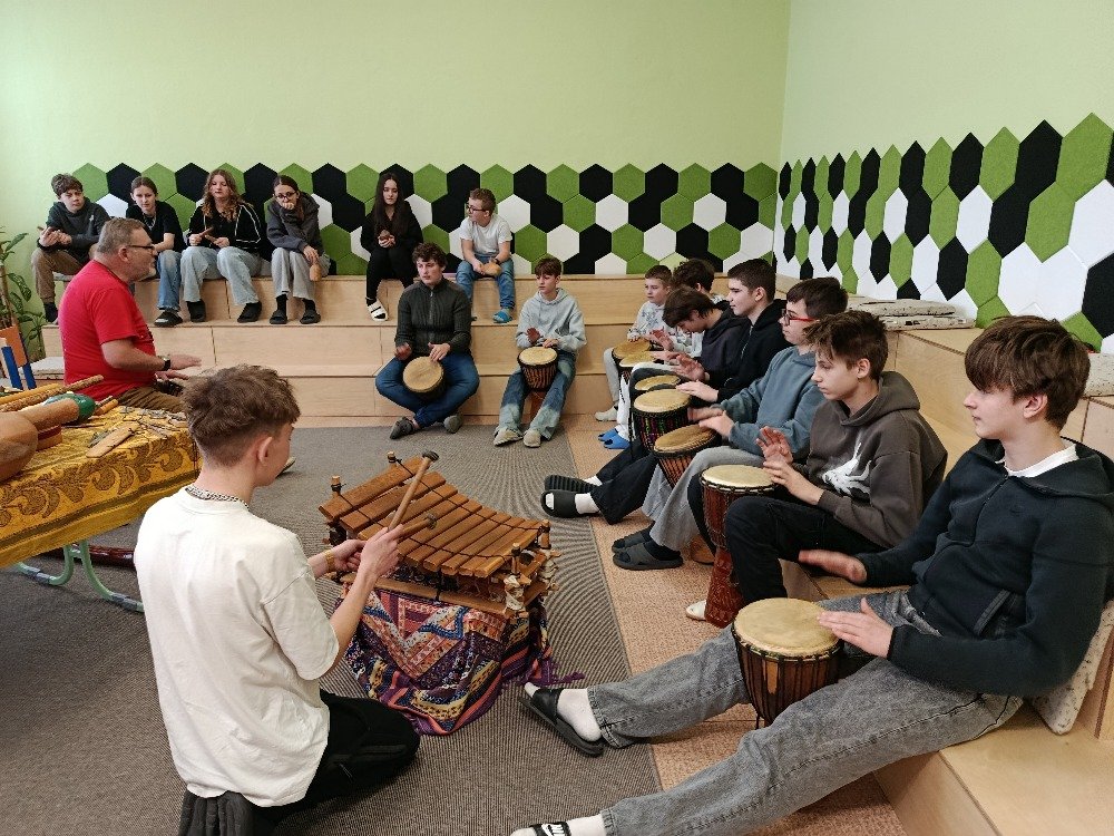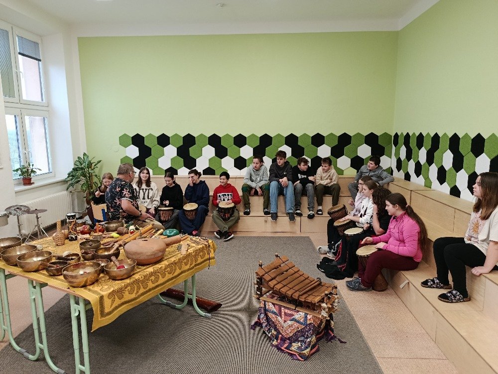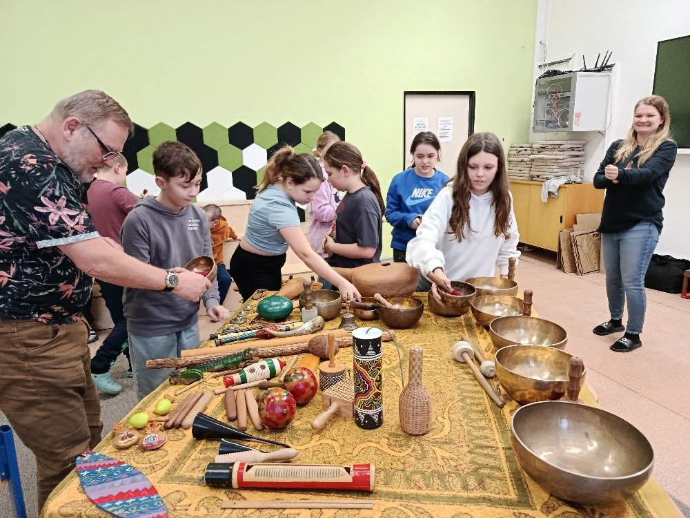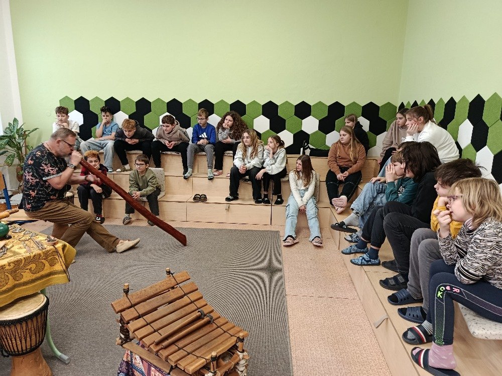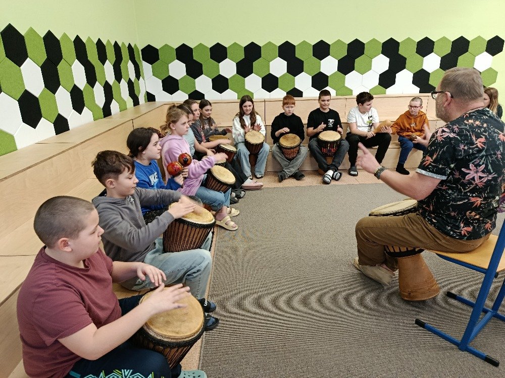 Děti si samy vyzkoušely bubnování a hru na vybrané nástroje, někteří se k hudbě přidali i zpěvem. Setkání bylo pro žáky příjemným a podnětným zážitkem, který podpořil jejich kreativitu i společný prožitek z hudby