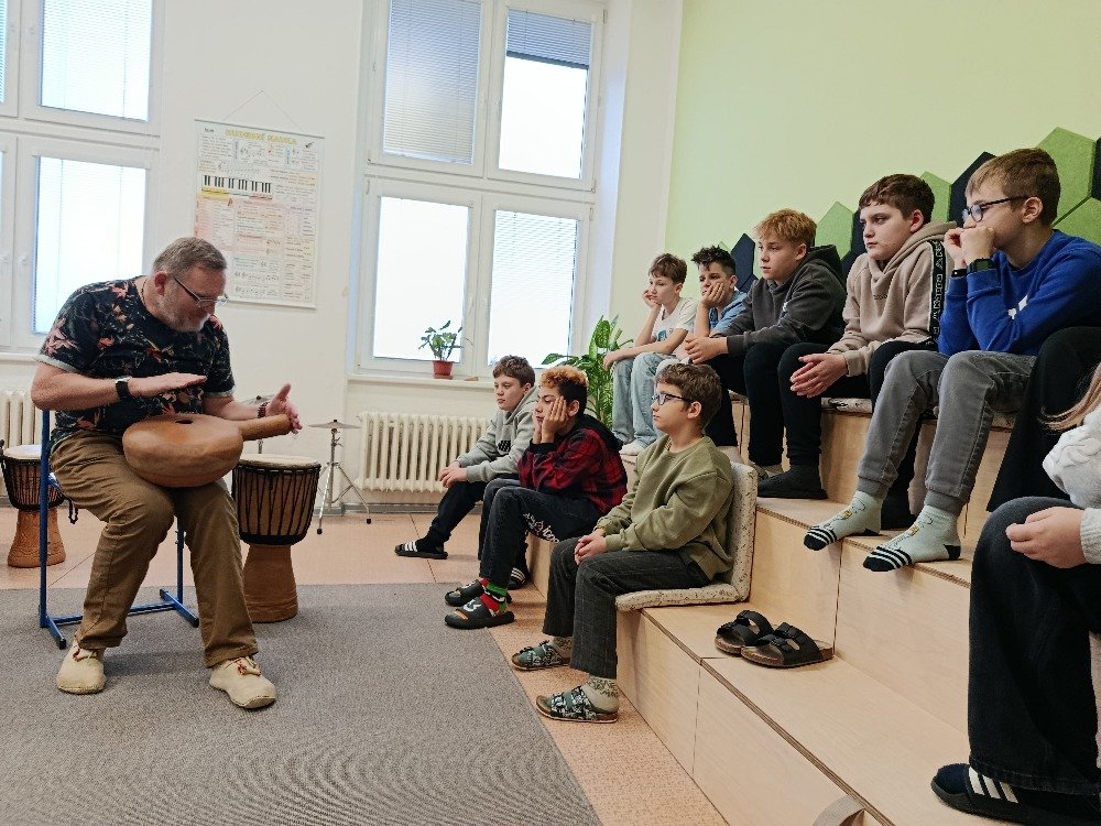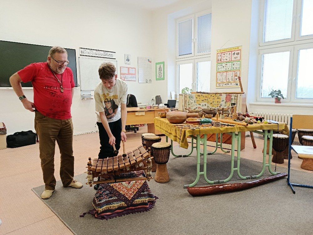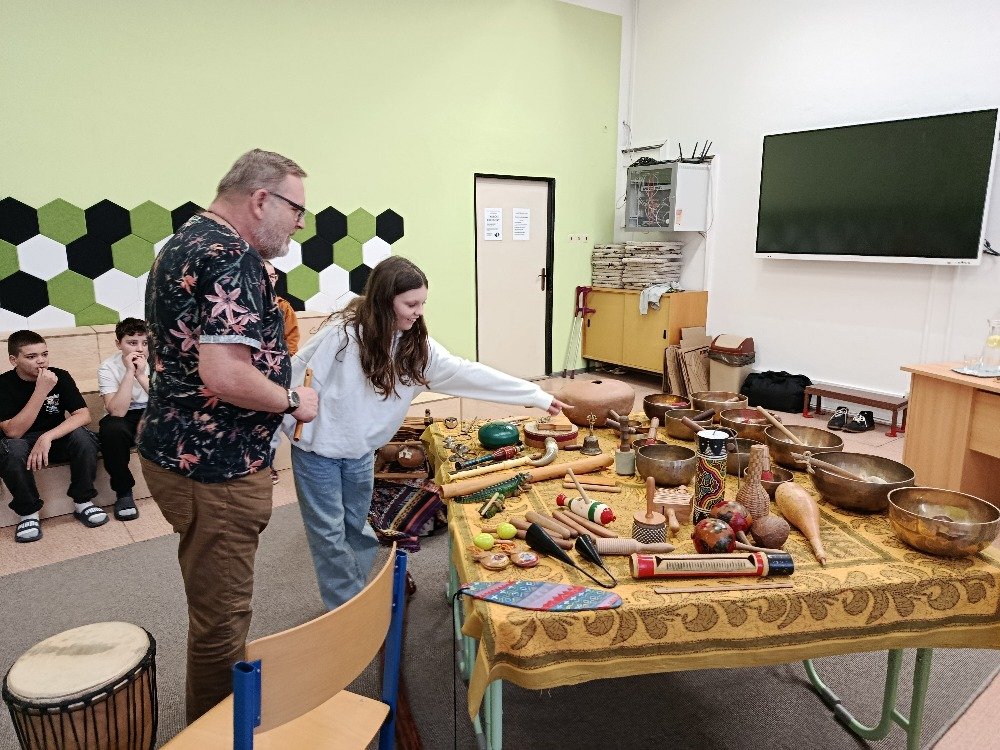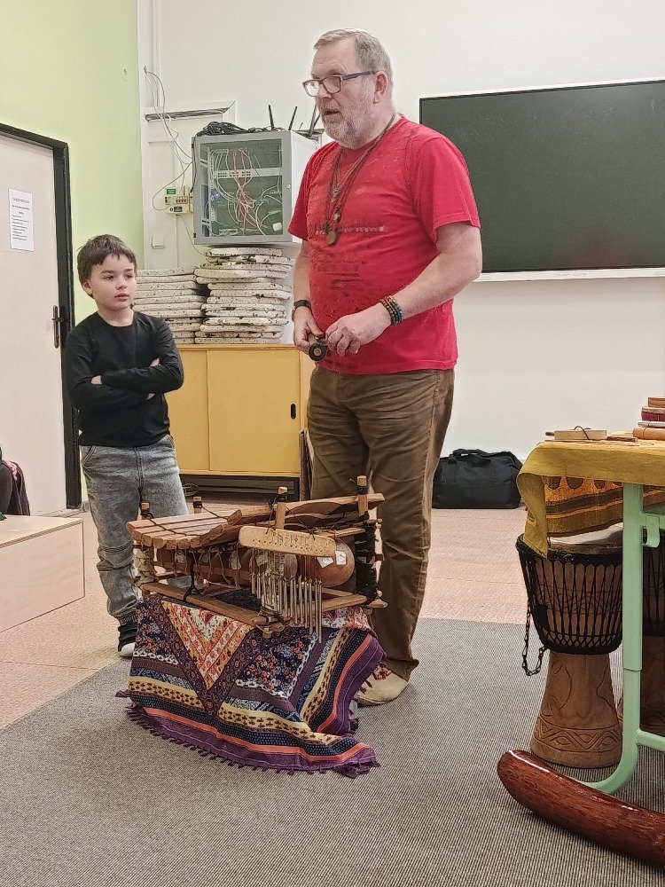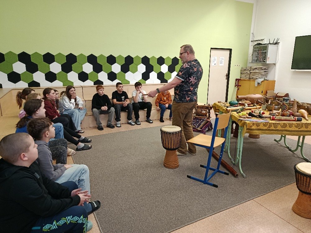 Datum: 3. 2. 2026Ve škole proběhla muzikoterapie, kterou vedl pan Petr Vysočan. Žákům představil různé hudební nástroje a seznámil je s jejich zvuky i využitím.