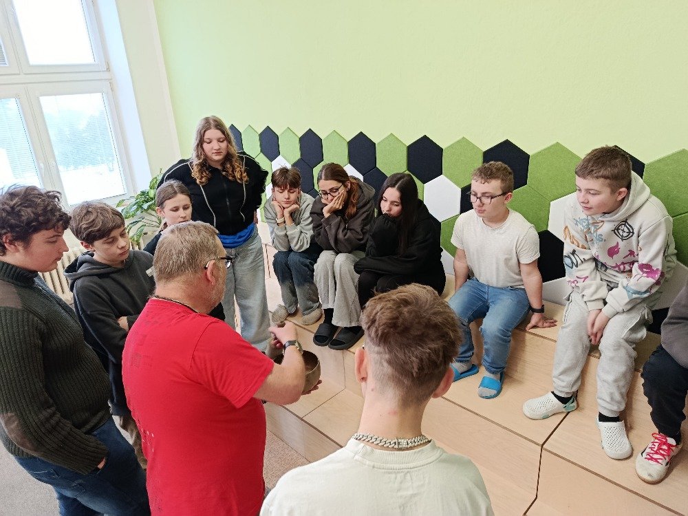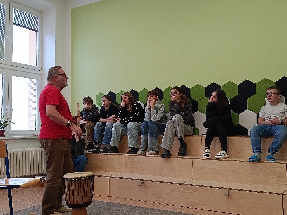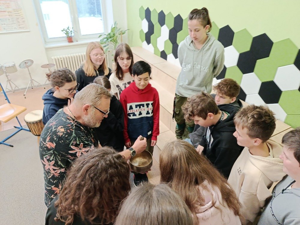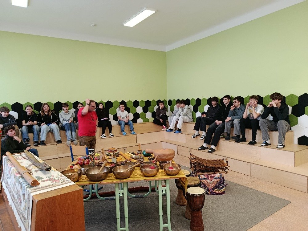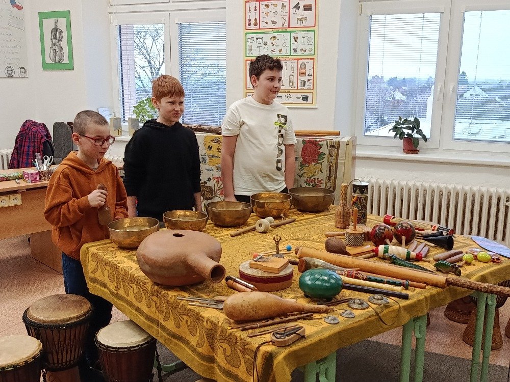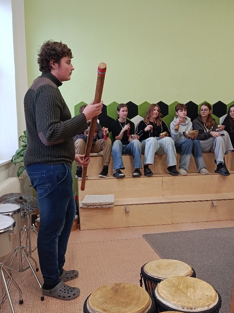 Datum: 3. 2. 2026Ve škole proběhla muzikoterapie, kterou vedl pan Petr Vysočan. Žákům představil různé hudební nástroje a seznámil je s jejich zvuky i využitím.