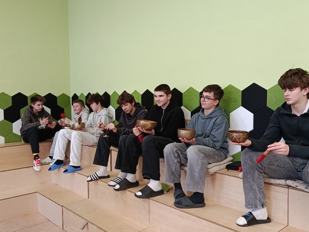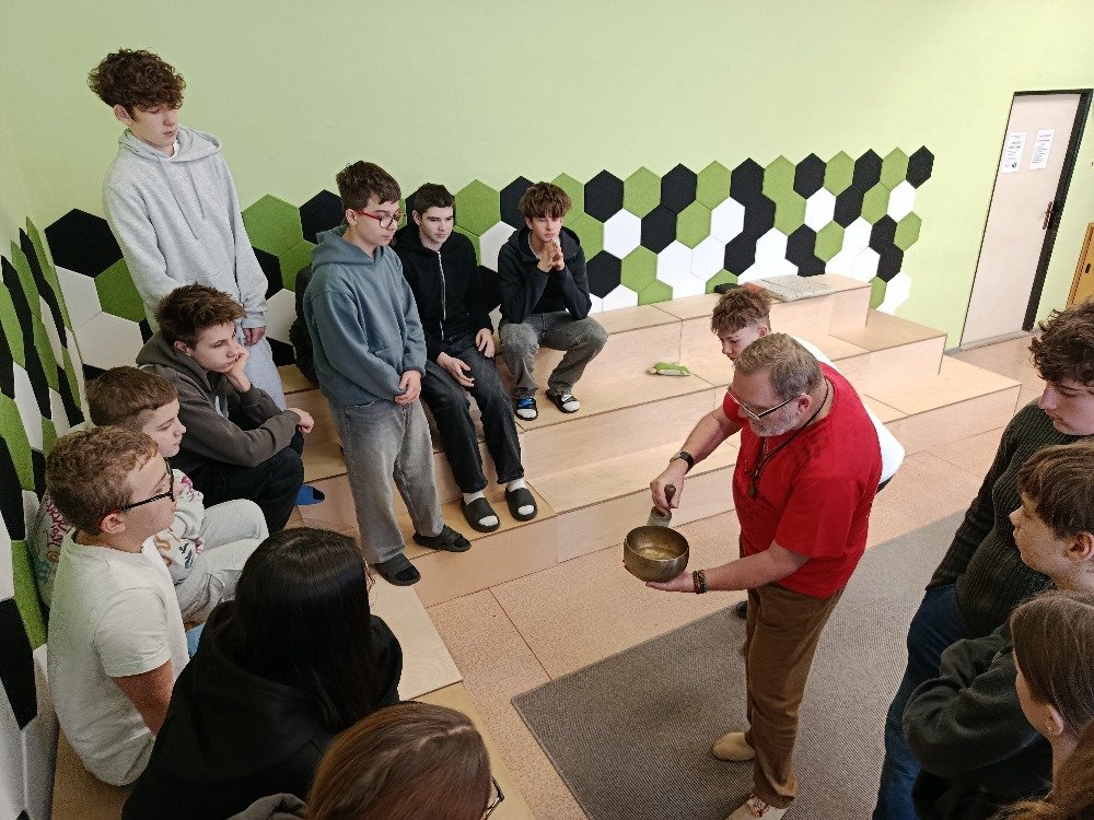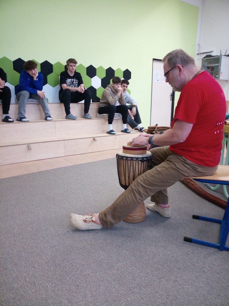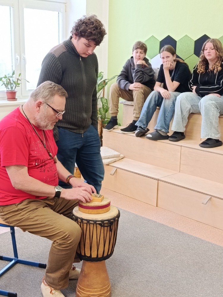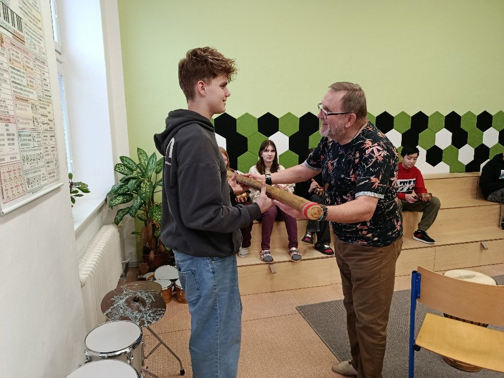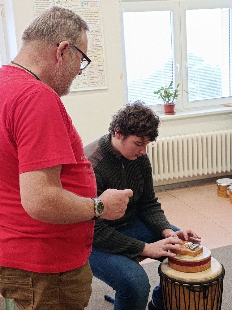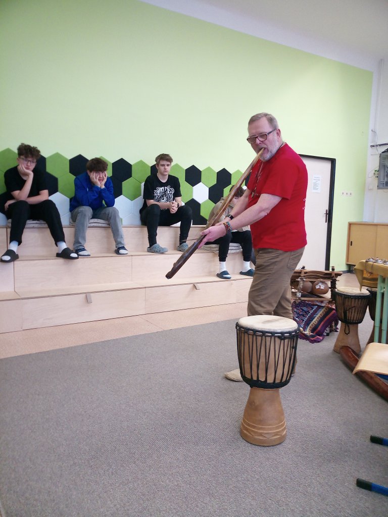 Děkujeme panu Petru Vysočanovi za krásnou muzikoterapii, inspirativní přístup a možnost vyzkoušet si hru na různé hudební nástroje. Velmi si vážíme příjemné atmosféry, kterou vytvořil, i radosti, kterou hudba žákům přinesla.