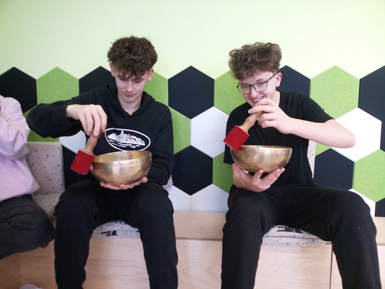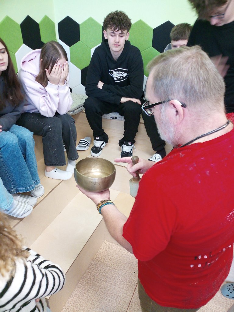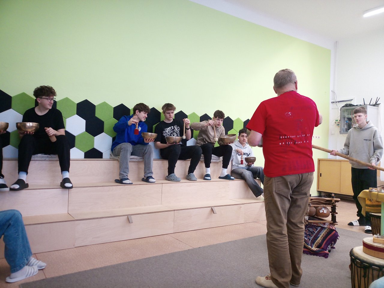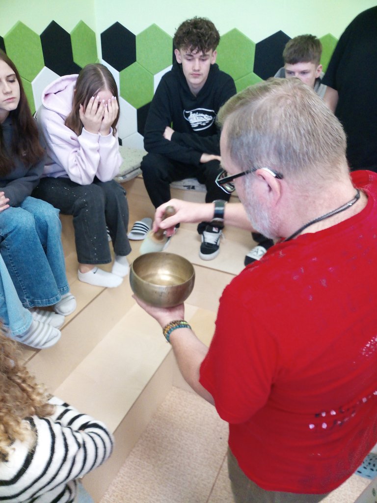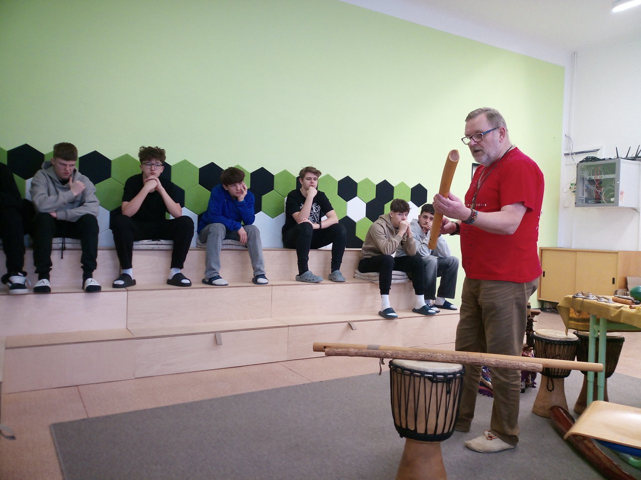 Děkujeme panu Petru Vysočanovi za krásnou muzikoterapii, inspirativní přístup a možnost vyzkoušet si hru na různé hudební nástroje. Velmi si vážíme příjemné atmosféry, kterou vytvořil, i radosti, kterou hudba žákům přinesla.