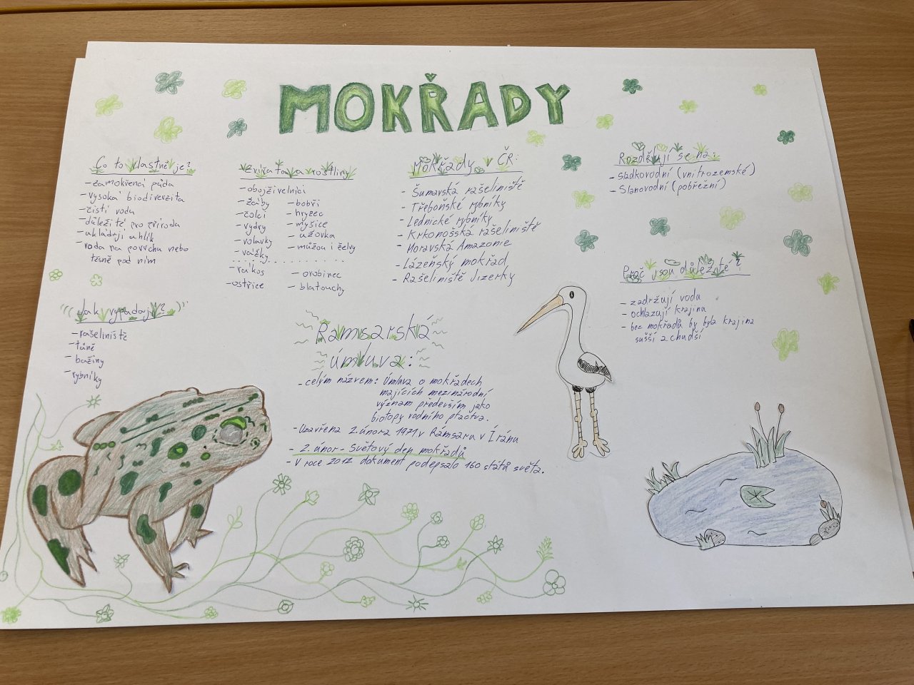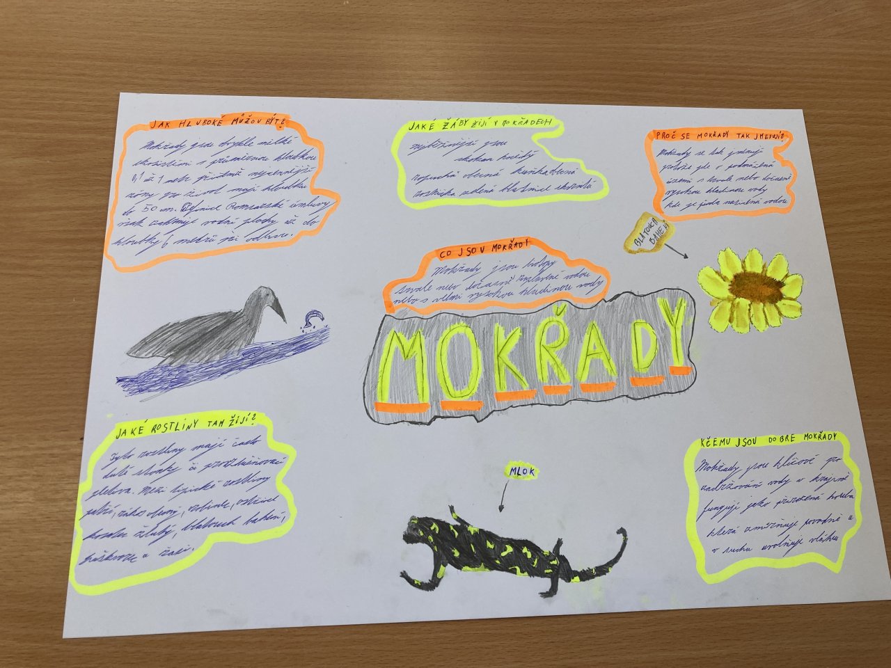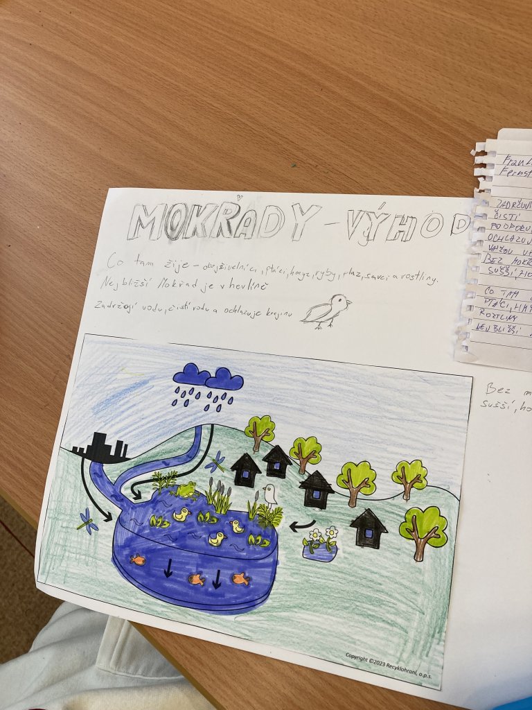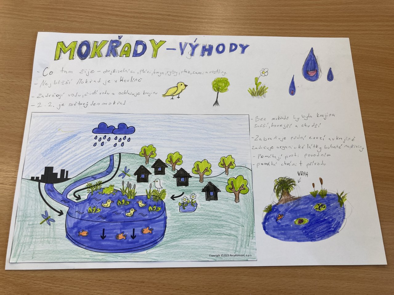 Datum: 5. 2. 2026V rámci programu Recyklohraní jsme se zapojili do projektu Mokřady a tajemství ztracené vody. Pomocí myšlenkových map jsme si ujasnili, co jsou mokřady, proč jsou důležité a jakou roli hrají v zadržování vody v krajině. Zjistili jsme, že mokřady pomáhají proti suchu, povodním a jsou domovem mnoha rostlin a živočichů.