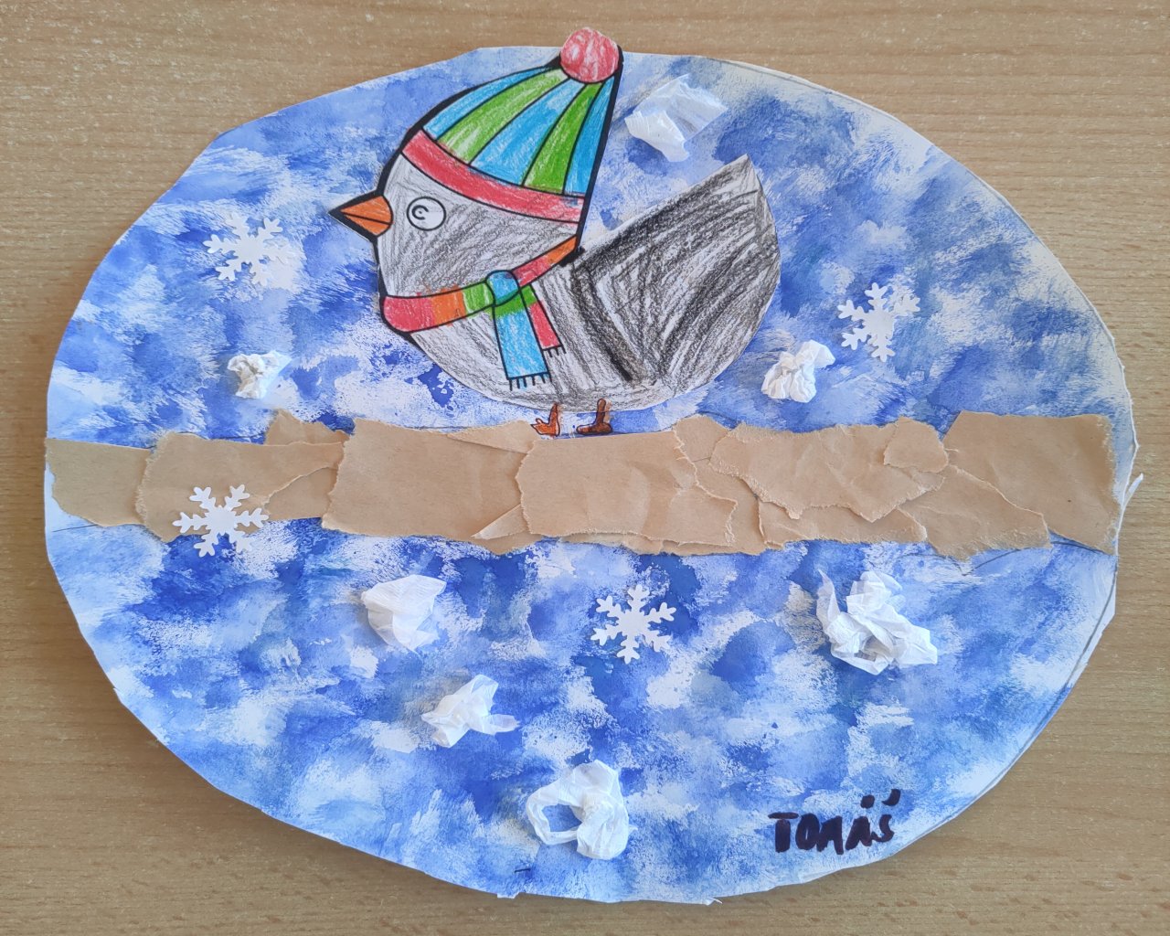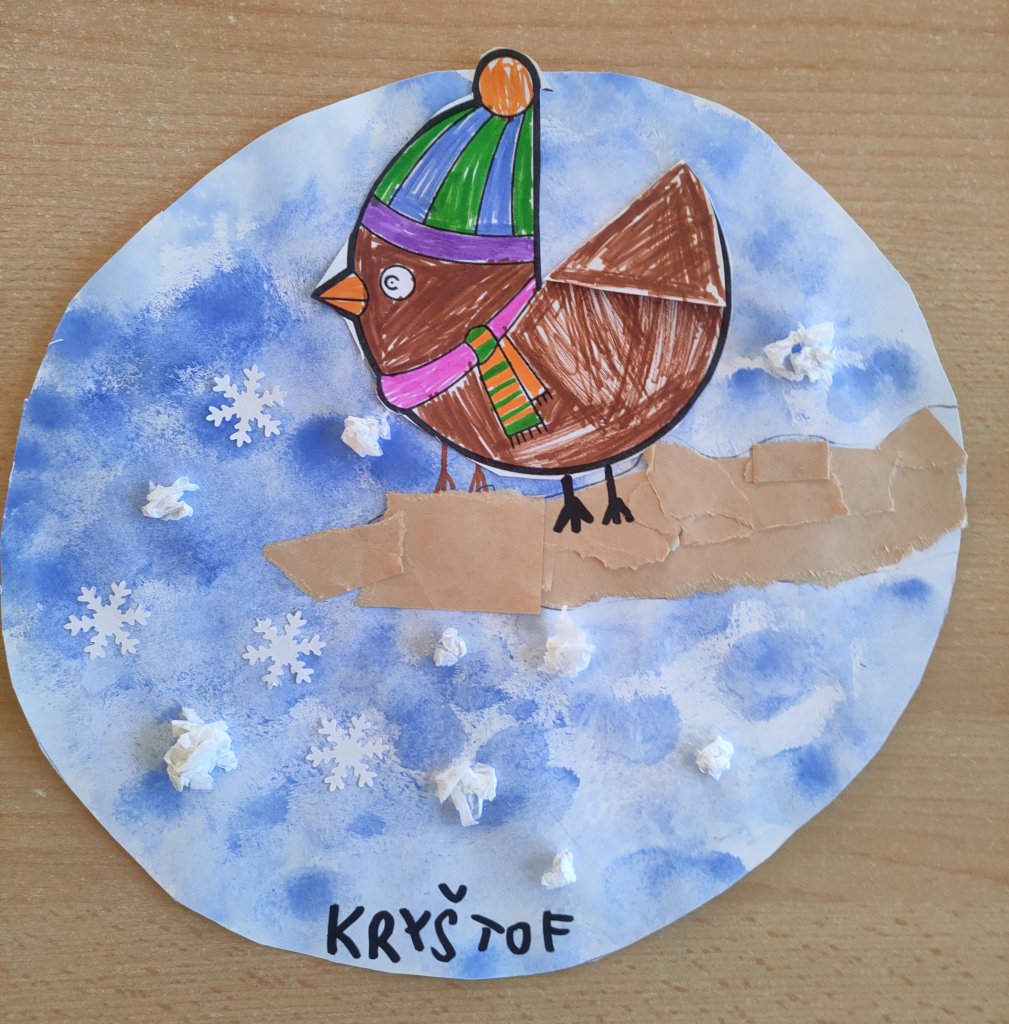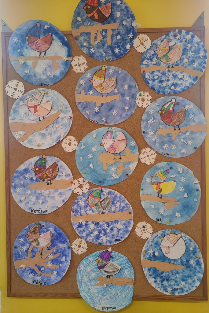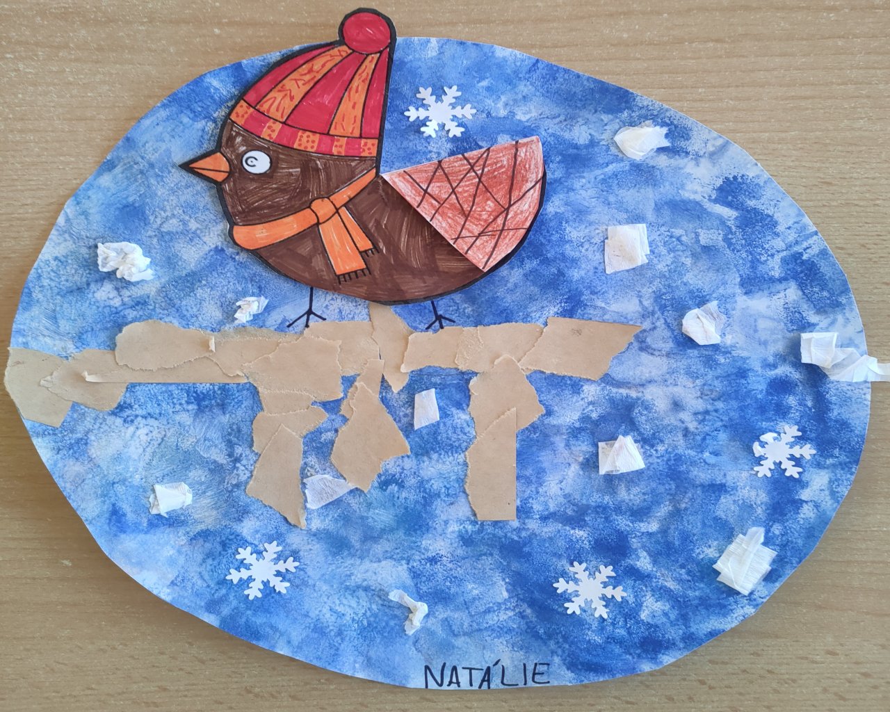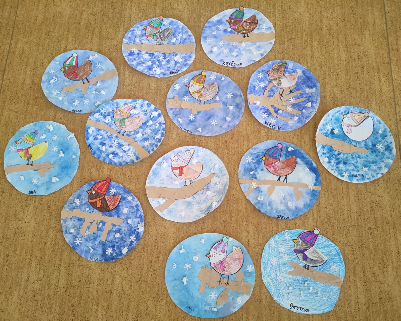Žáci vytvořili zimní pozadí technikou otisku houbičkou. Poté vymalovali, vystřihli a nalepili ptáčka na větvičku z vytrhaného barevného papíru. Práci dokončili nalepením papírových sněhových vloček.