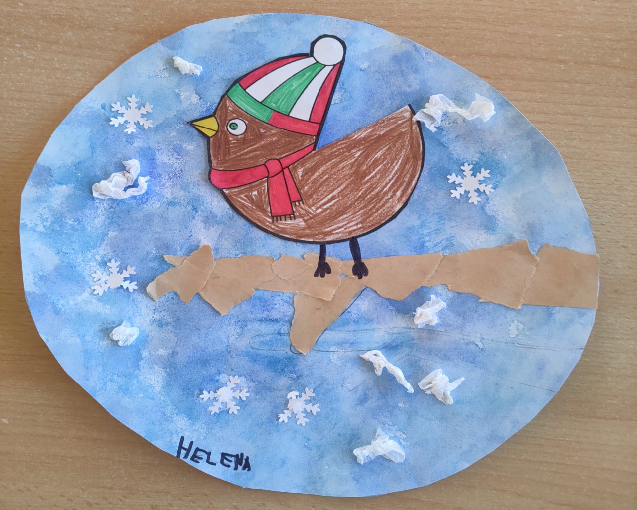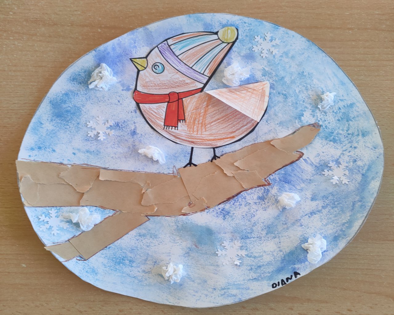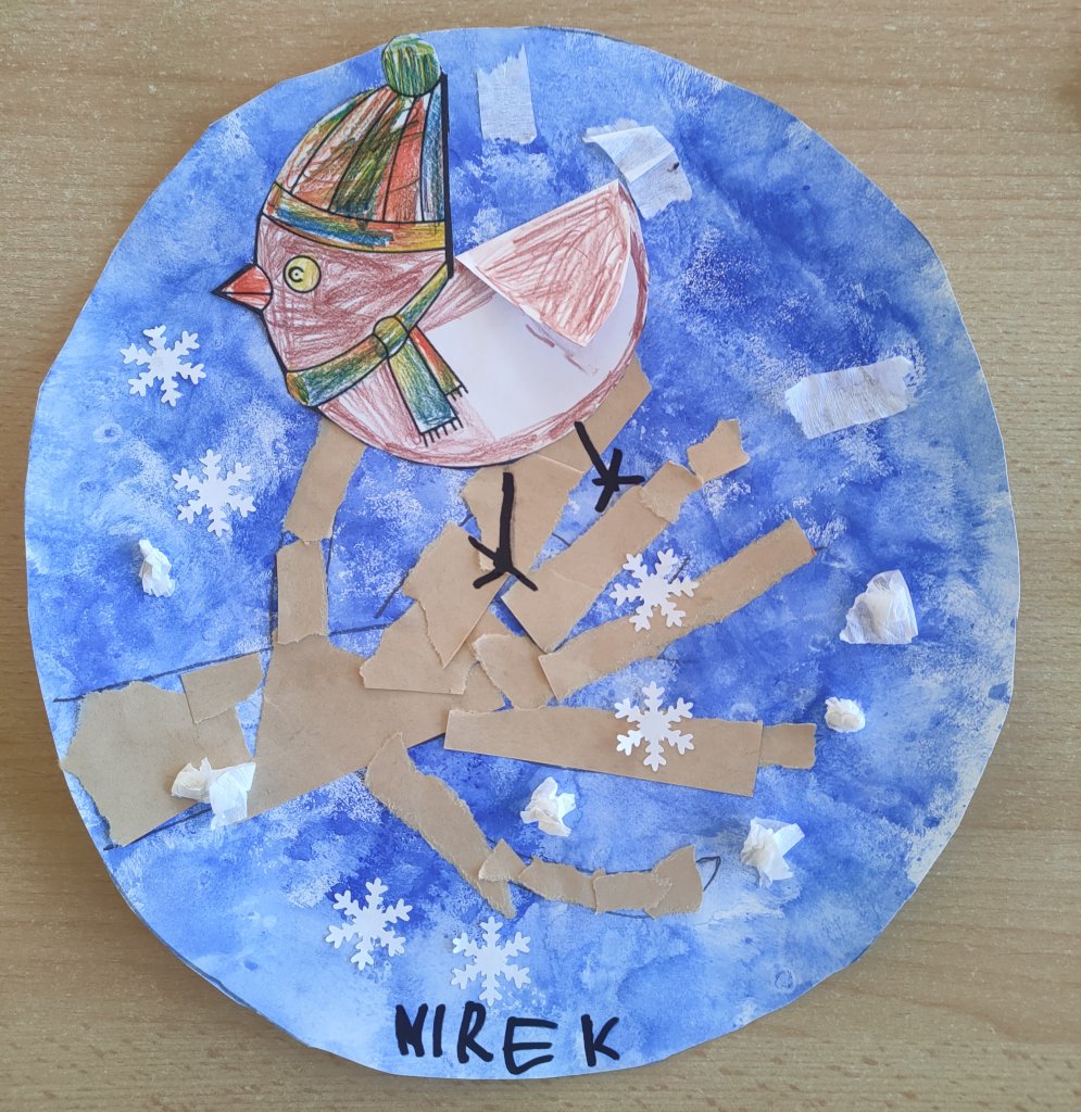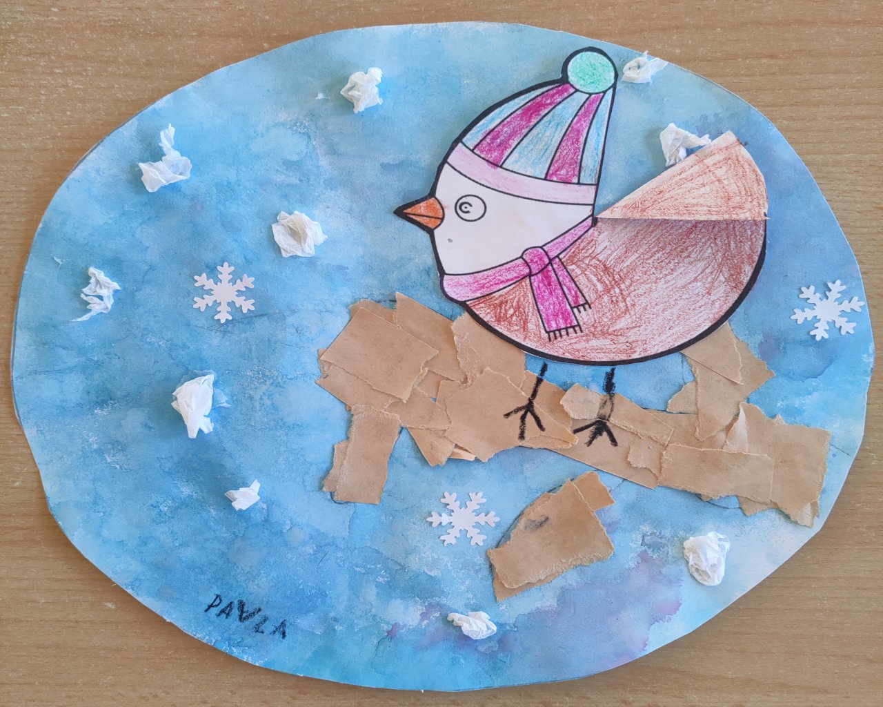 Žáci vytvořili zimní pozadí technikou otisku houbičkou. Poté vymalovali, vystřihli a nalepili ptáčka na větvičku z vytrhaného barevného papíru. Práci dokončili nalepením papírových sněhových vloček.