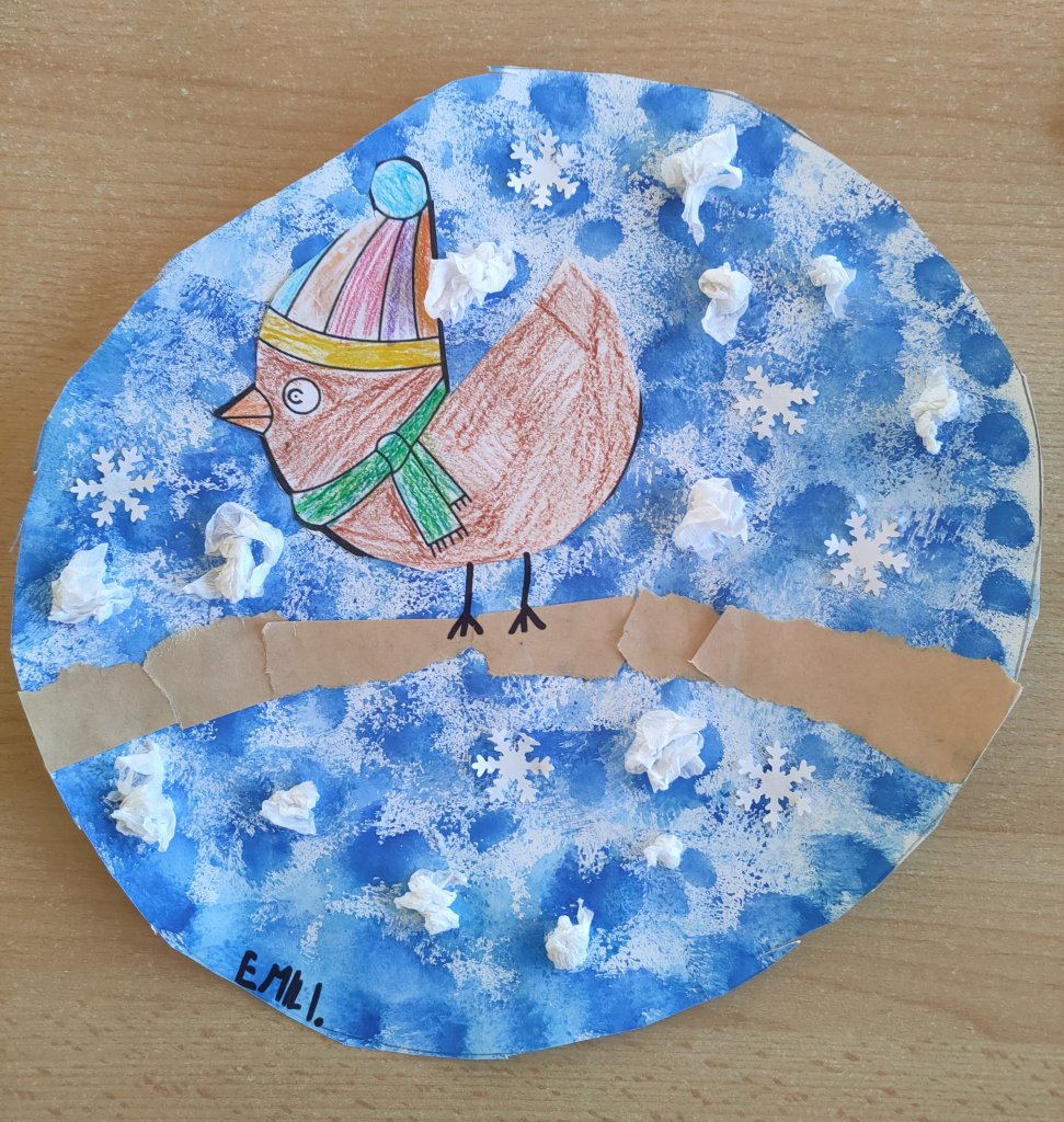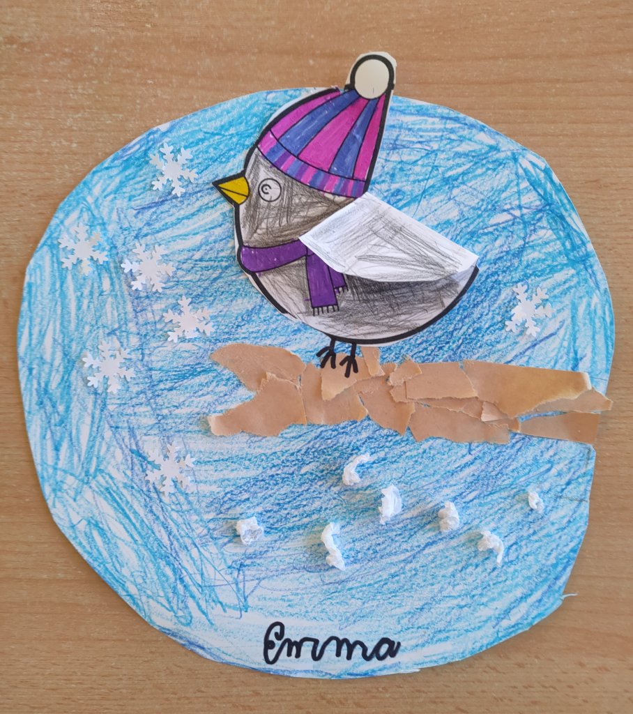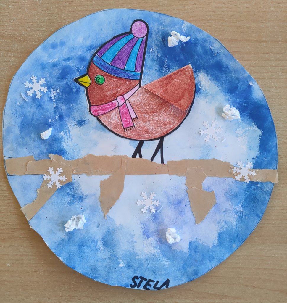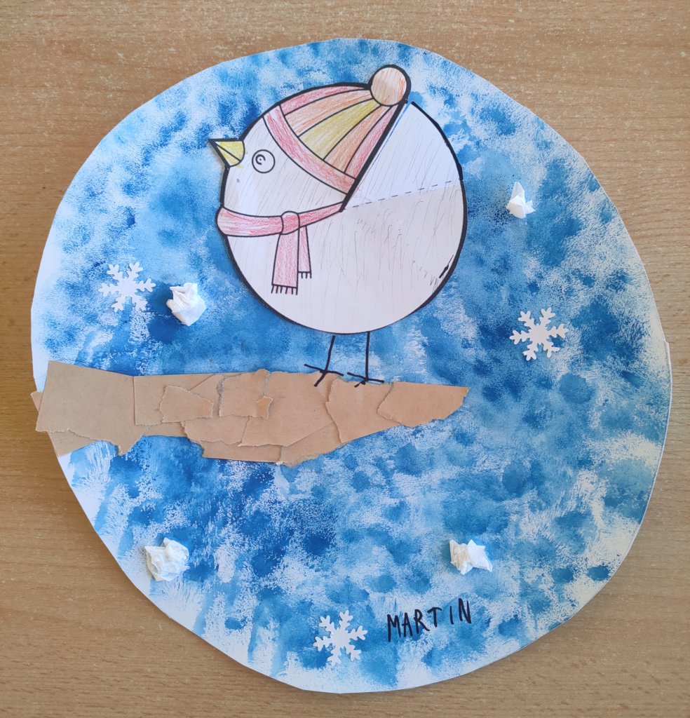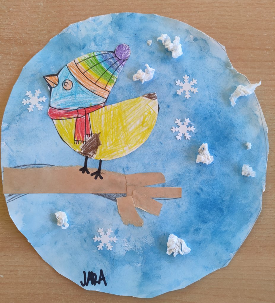 Žáci vytvořili zimní pozadí technikou otisku houbičkou. Poté vymalovali, vystřihli a nalepili ptáčka na větvičku z vytrhaného barevného papíru. Práci dokončili nalepením papírových sněhových vloček.