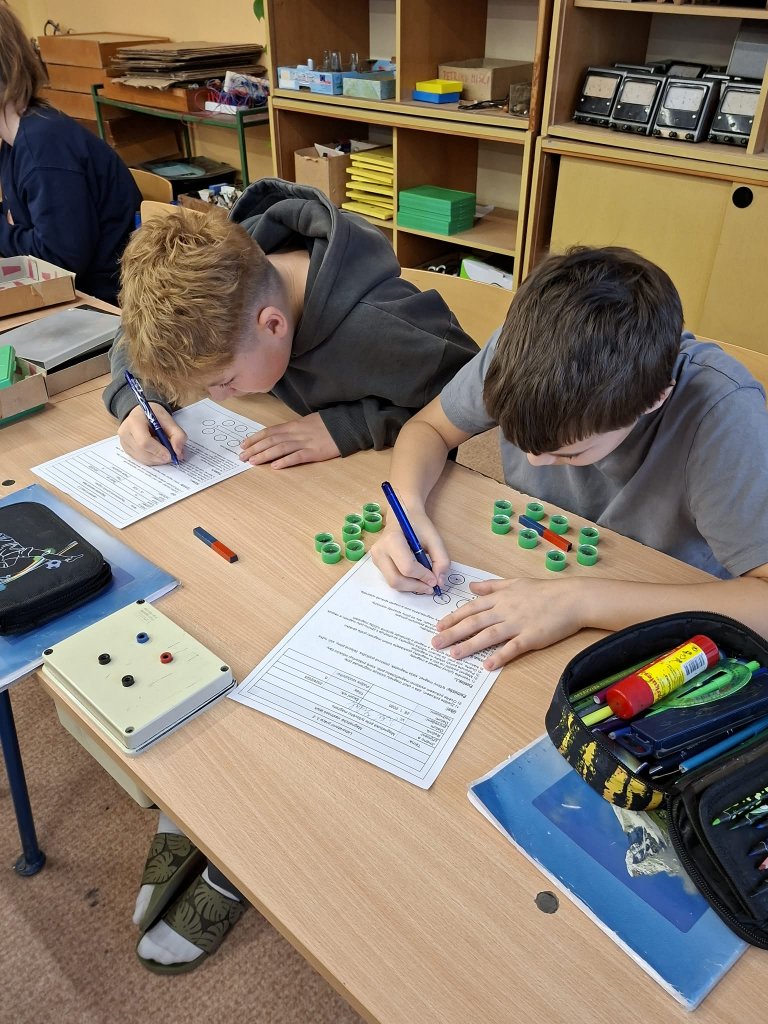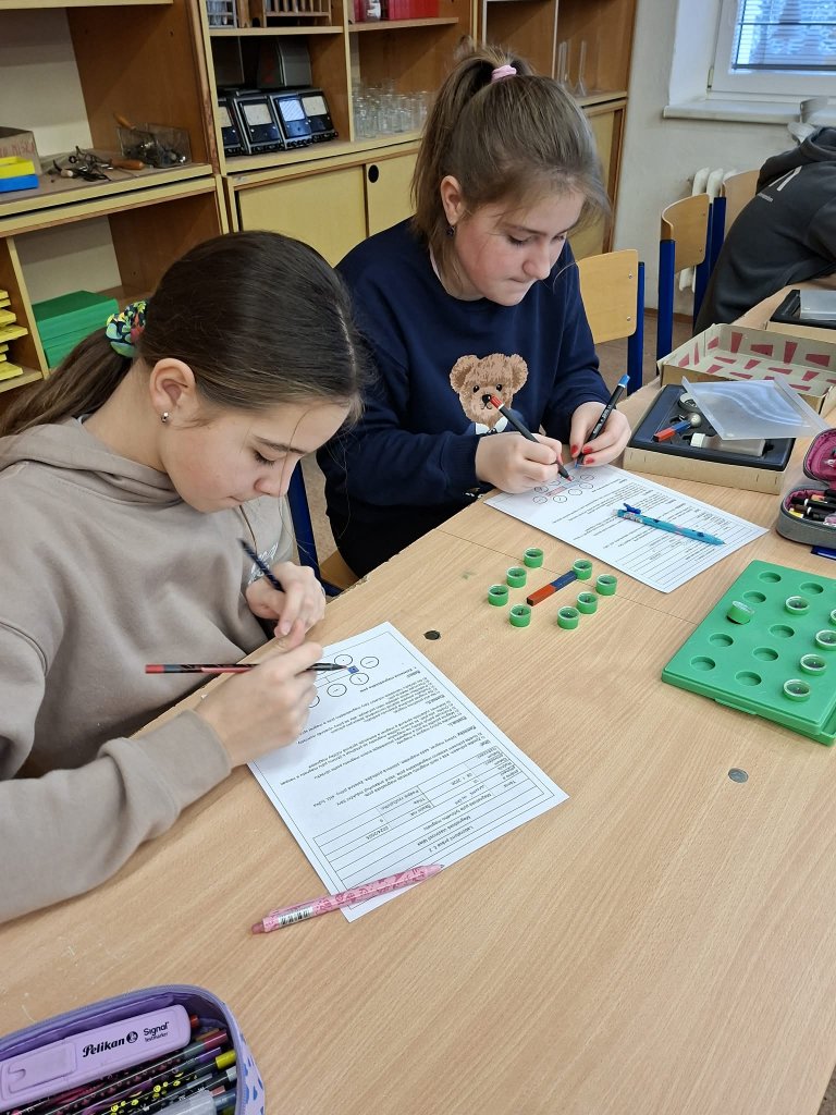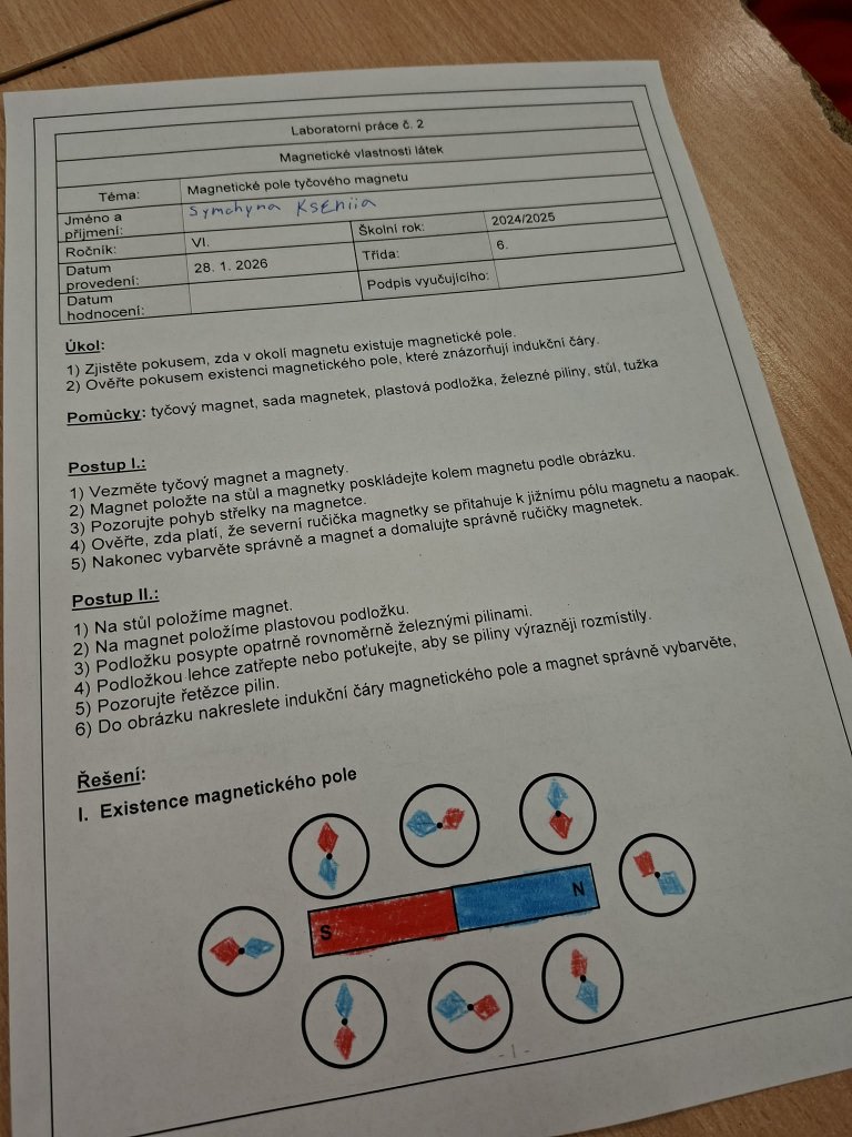 Datum: 23. 2. 2026V hodině fyziky si žáci šestého ročníku vyzkoušeli laboratorní práci zaměřenou na magnetismus. Pomocí pokusů s magnety a kompasem si ověřili, že Země je jeden velký kulový magnet. Zjistili, že má své magnetické póly a že právě díky magnetickému poli se střelka kompasu vždy stáčí stejným směrem.