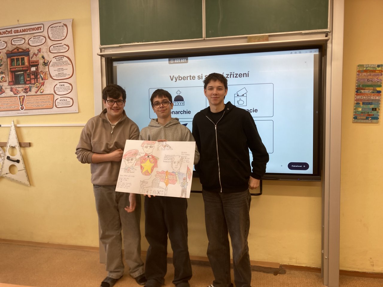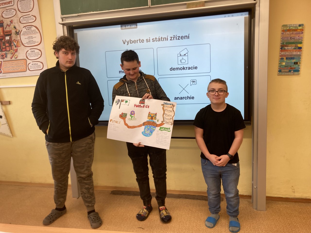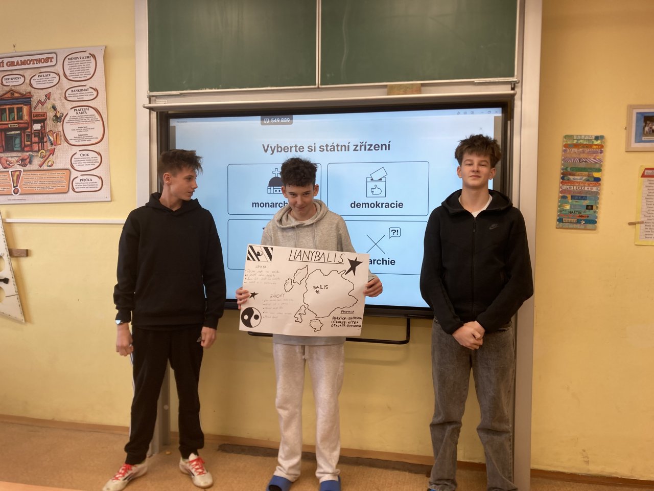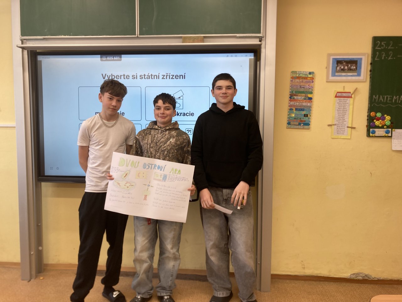 Datum: 24. 2. 2026V hodině VKO se žáci zapojili do projektu „Stát jsme my“ na platformě Skoala. Ve skupinách založili vlastní státní útvary – zvolili si státní zřízení (monarchie, demokracie, diktatura nebo anarchie), vybrali vedoucí představitele a vytvořili název, vlajku, státní znak, základní pravidla nebo hymnu.