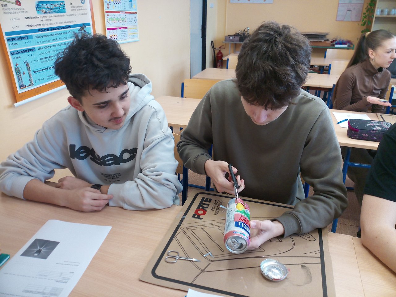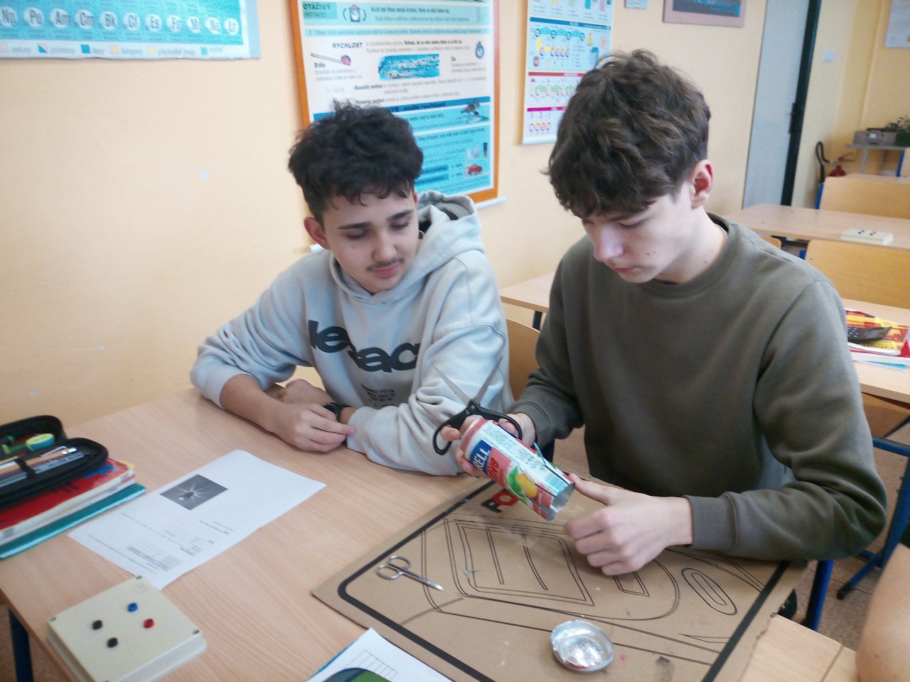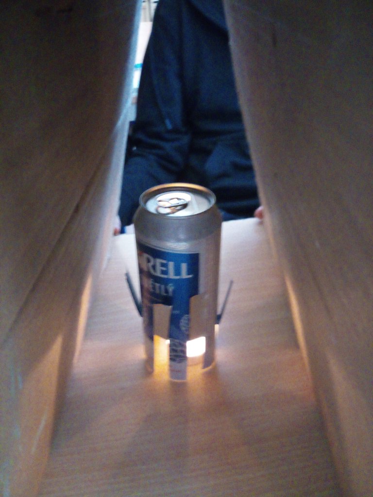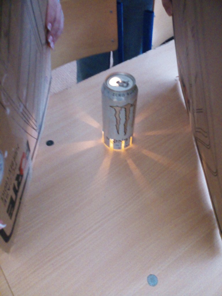 V první části experimentu pracovali s plechovkami, do kterých vystřihli malé podélné otvory. Přímočaré šíření světla si ověřili pomocí zapálené svíčky, kterou umístili pod plechovku.