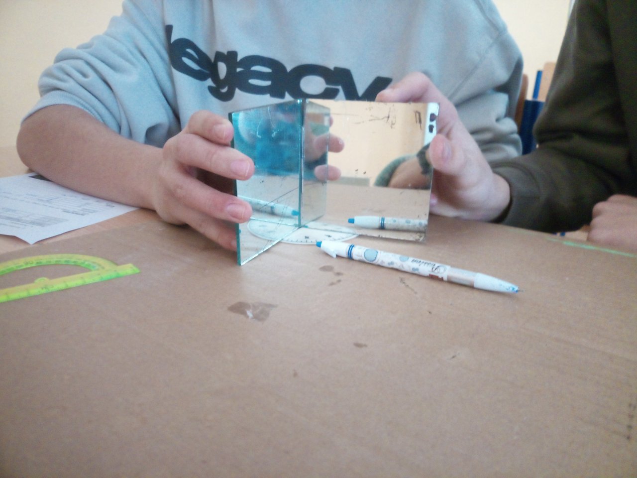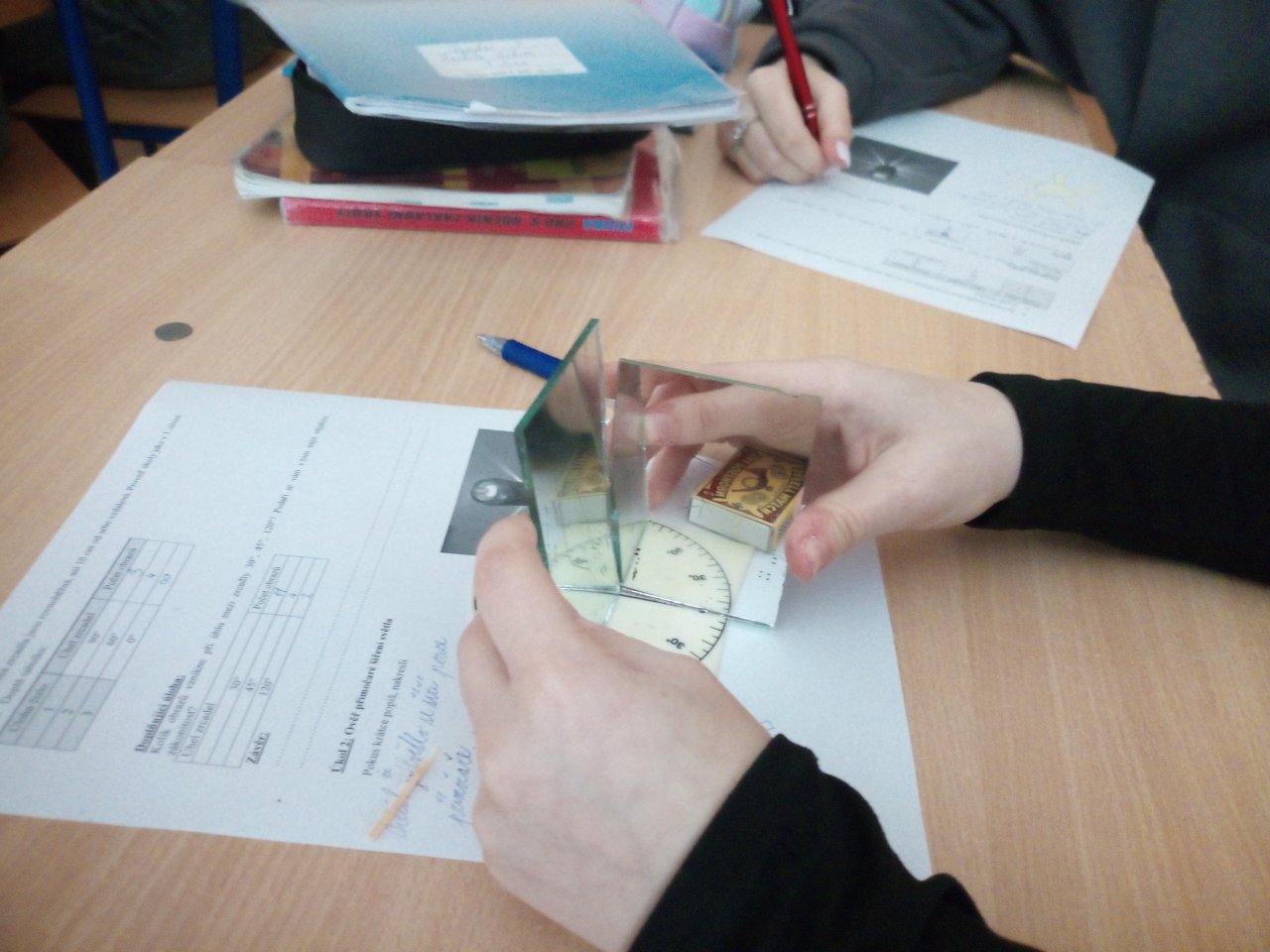 Ve druhé části využili dvě zrcátka, která nastavovali pod různými úhly. Jejich úkolem bylo určit počet vzniklých obrazů. Zjistili, že čím menší je úhel mezi zrcadly, tím více obrazů vzniká.