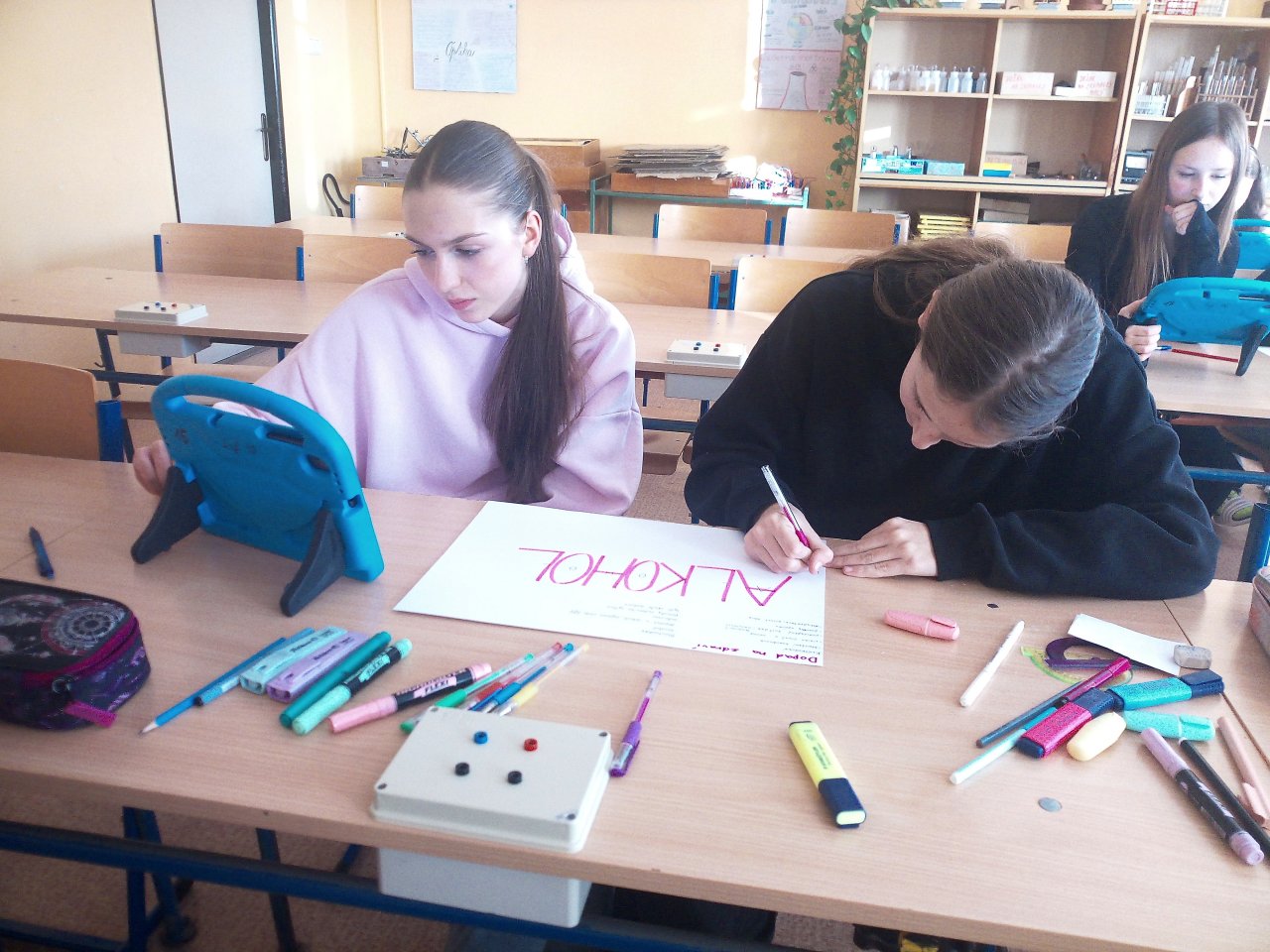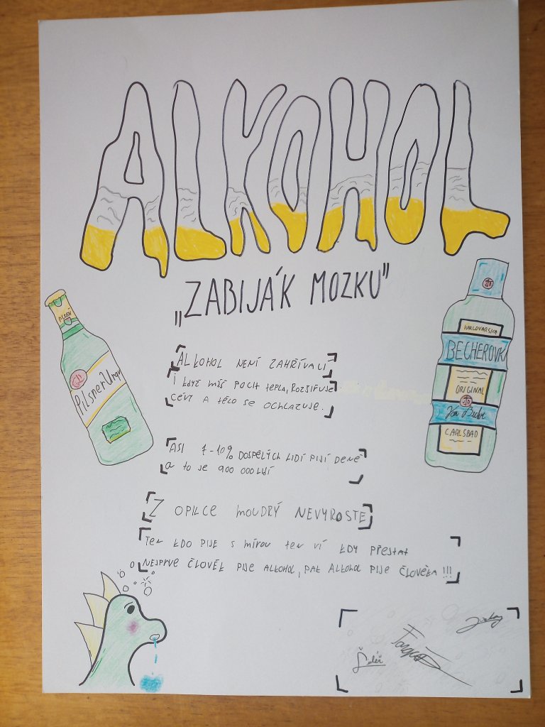 Na závěr žáci shrnuli získané poznatky do přehledných plakátů. Každá skupina zpracovala své téma kreativním způsobem – doplnila důležité informace, varovné statistiky i vlastní ilustrace. Plakáty tak nejen informovaly o rizicích spojených s konzumací alkoholu, ale také motivovaly k zodpovědnému přístupu ke zdraví. Hodina žáky vedla k zamyšlení nad vlastním chováním a významem prevence v oblasti závislostí.