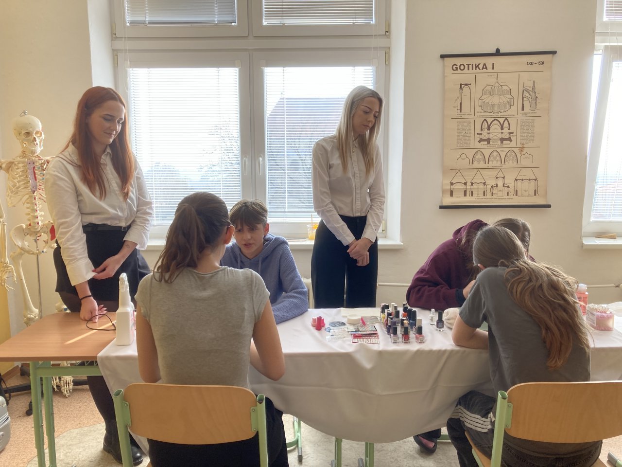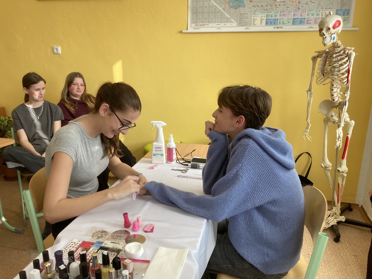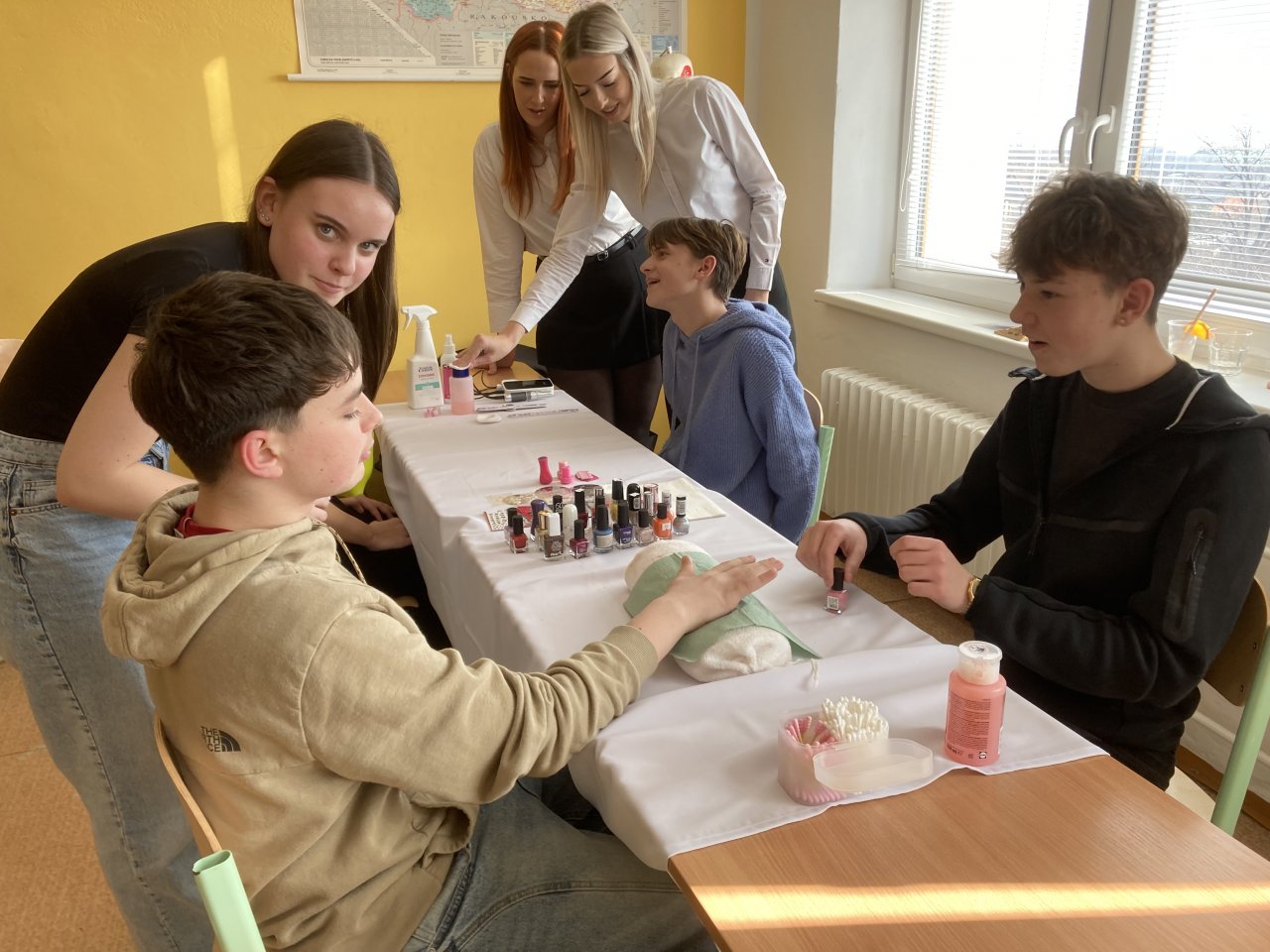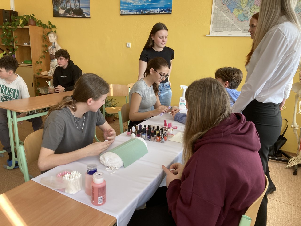 Druhou část programu tvořila prezentace oboru Kosmetické služby. Studentky oboru nás seznámily s modeláží a lakováním nehtů. Tuto činnost si opět s radostí vyzkoušely nejen dívky, ale také chlapci.