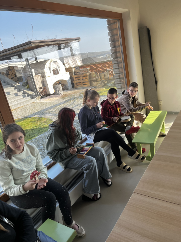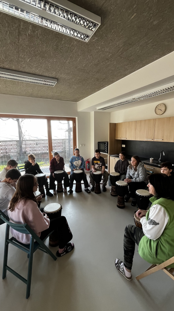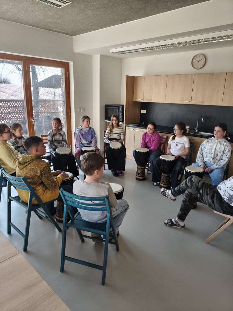 Druhá část programu děti zavedla do Afriky. Žáci si poslechli poutavé vyprávění o životě na tomto kontinentu, o místních zvycích i přírodě. Velkým zážitkem bylo také vyzkoušení afrických bubnů, na které si děti mohly zahrát a společně si vytvořit vlastní rytmus.
