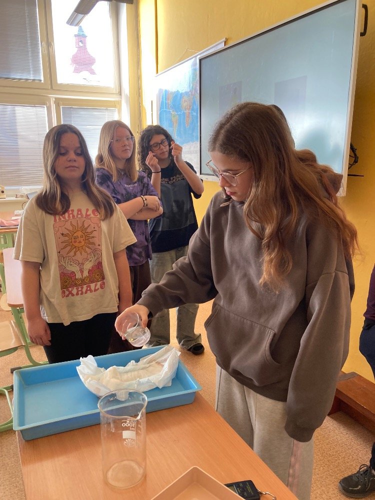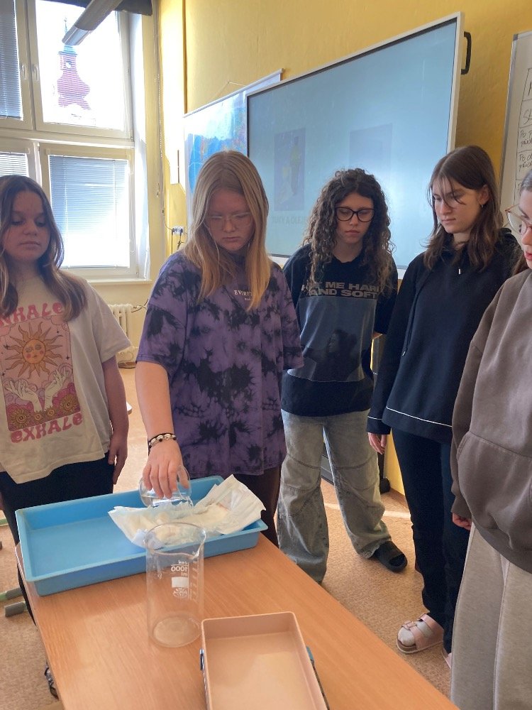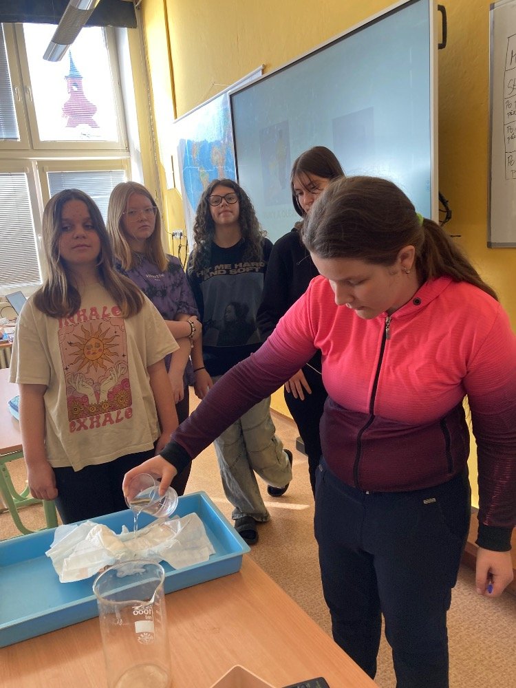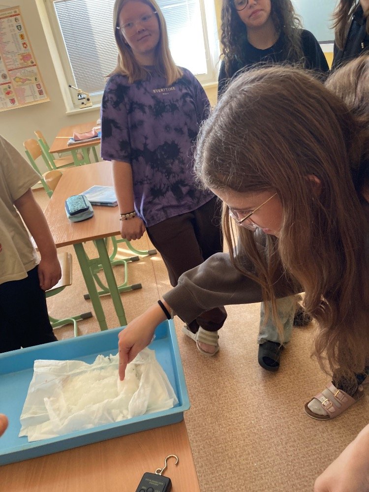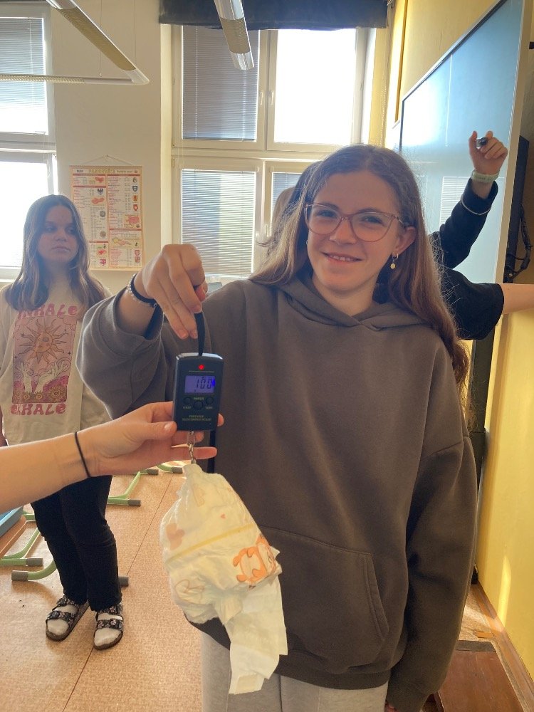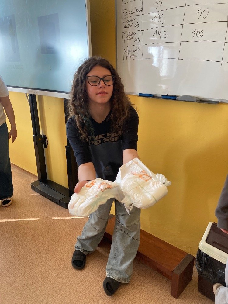 Poté se pustili do praktických pokusů. Děvčata plnila první část s názvem „Co udělá dětská plena v kanalizaci?“. Zjišťovala, kolik vody dokáže dětská plena pojmout a jak dramaticky zvětší svůj objem. Výsledek všechny překvapil – plena nasála velké množství vody a výrazně nabobtnala, což názorně ukázalo, proč do kanalizace rozhodně nepatří.