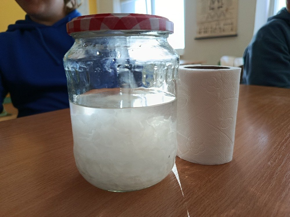 Chlapci se věnovali druhé části: „Co se stane, když do záchodu vyhodíme, co tam nepatří?“. Do sklenic s vodou postupně přidávali toaletní papír, vlhčené ubrousky, olej, mouku, těstoviny nebo zbytky banánu. Sklenice poté protřepali a pozorovali, co se s jednotlivými materiály stane. Pokus ukázal, že některé věci se ve vodě nerozloží a mohou v kanalizaci způsobit velké problémy.