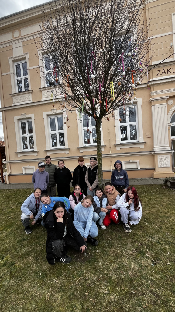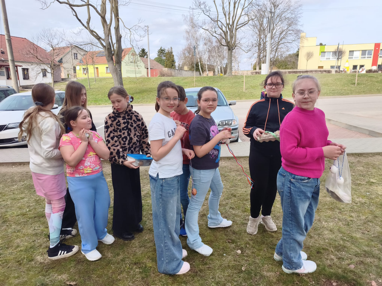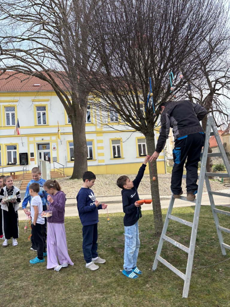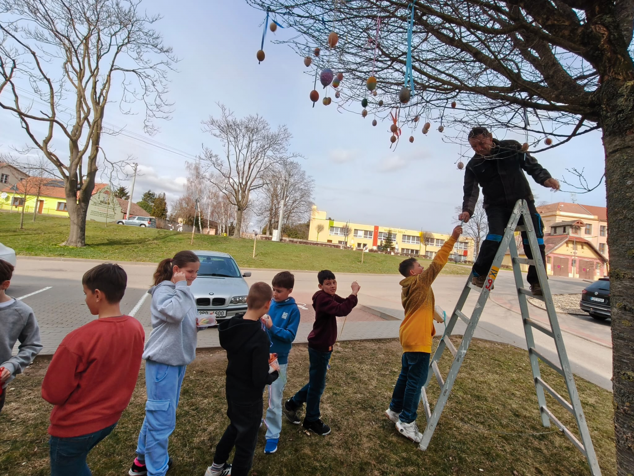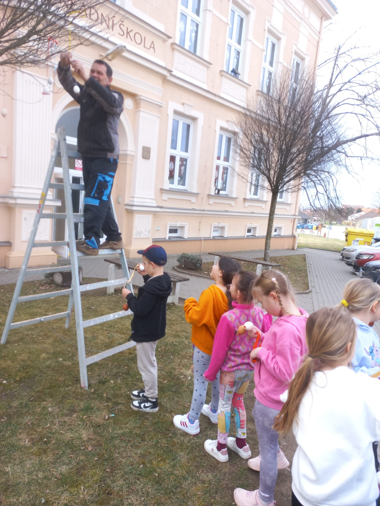 Společné zdobení stromů se stalo příjemnou venkovní aktivitou, která nám všem připomněla, že zima už je definitivně pryč. Skořápkovníky teď dělají radost nejen žákům a učitelům, ale i všem kolemjdoucím.
