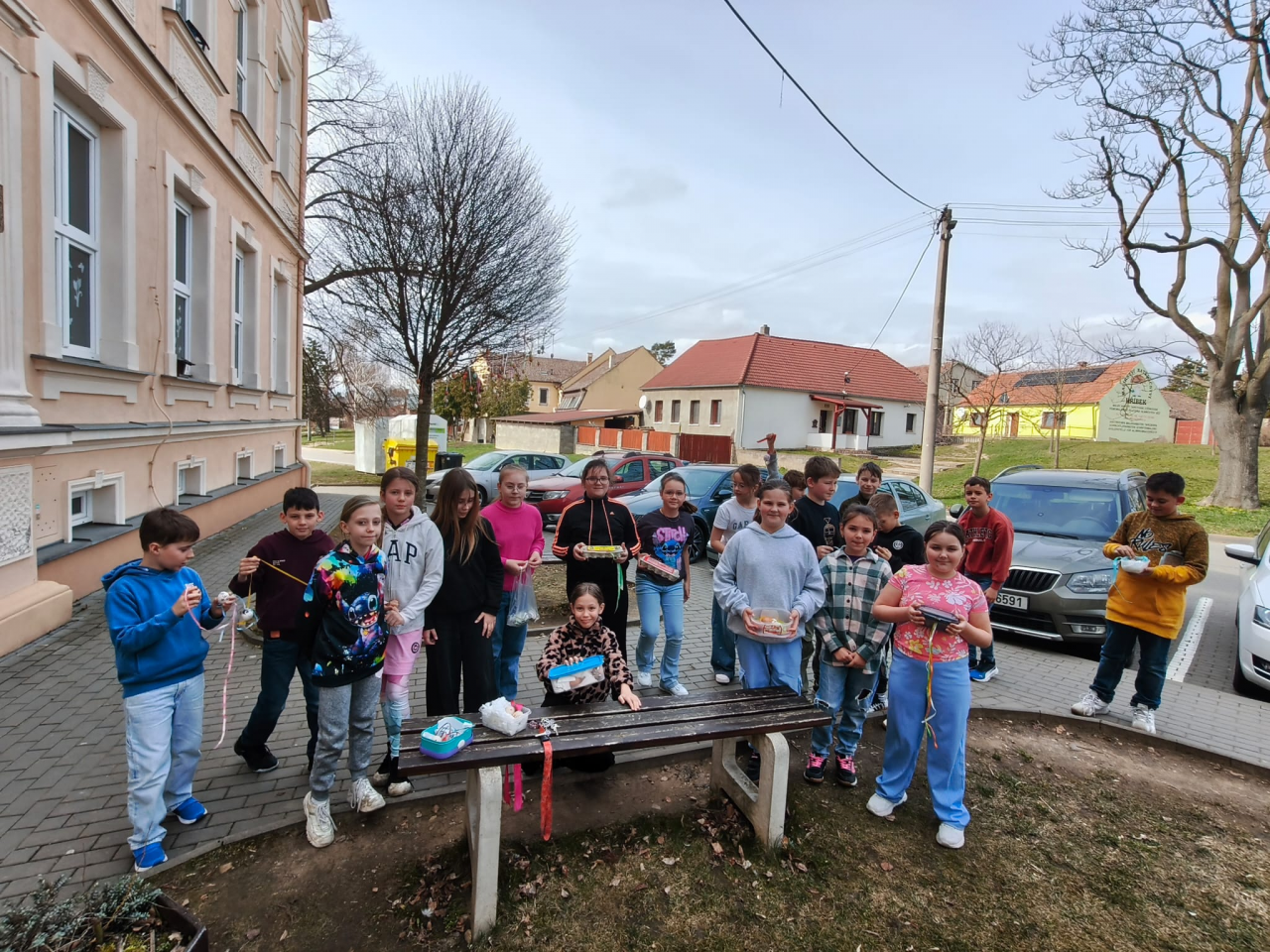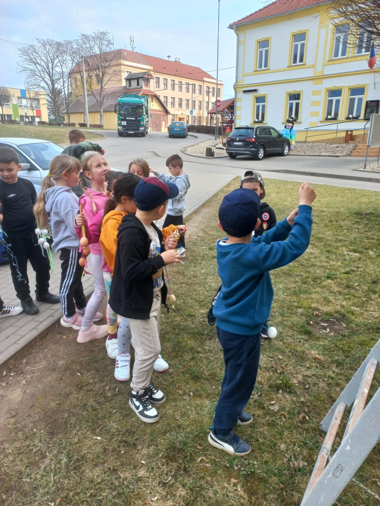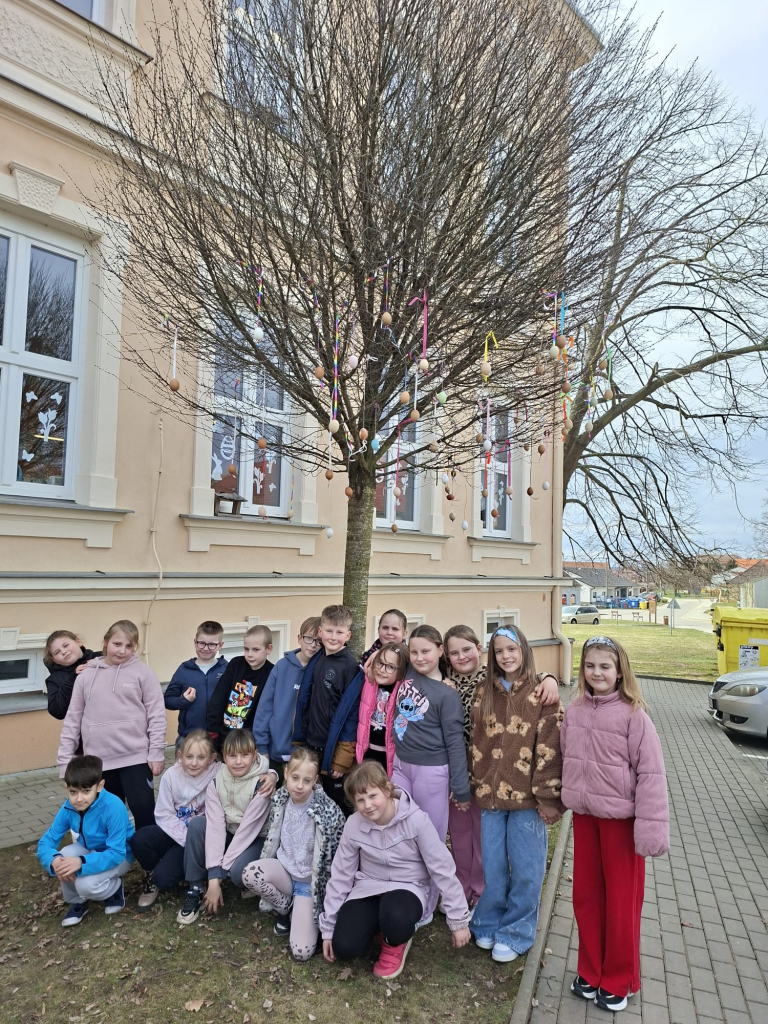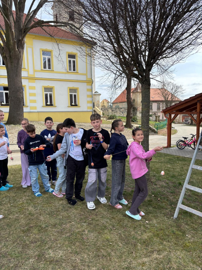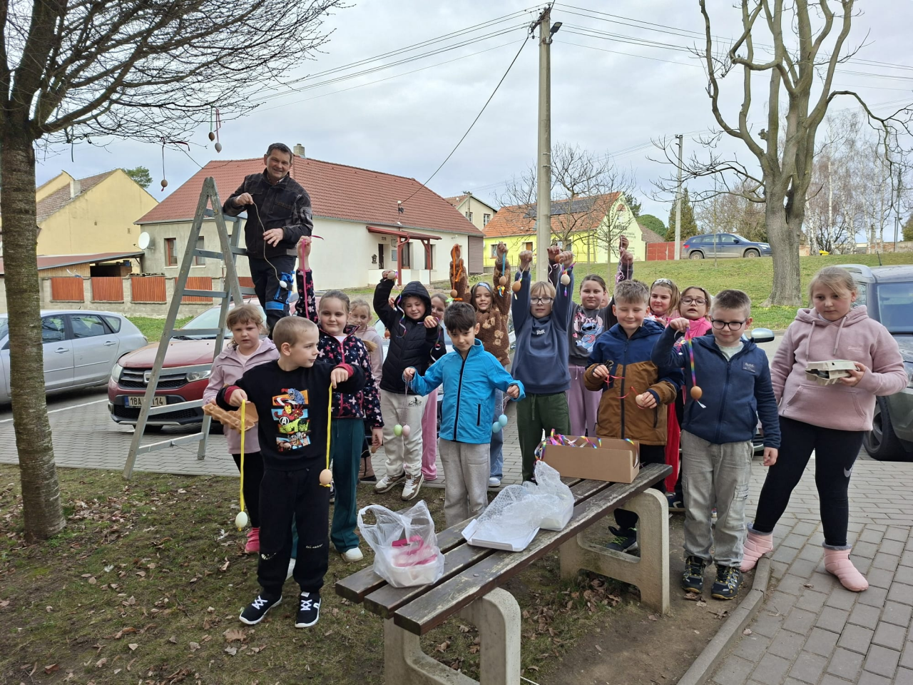 Společné zdobení stromů se stalo příjemnou venkovní aktivitou, která nám všem připomněla, že zima už je definitivně pryč. Skořápkovníky teď dělají radost nejen žákům a učitelům, ale i všem kolemjdoucím.