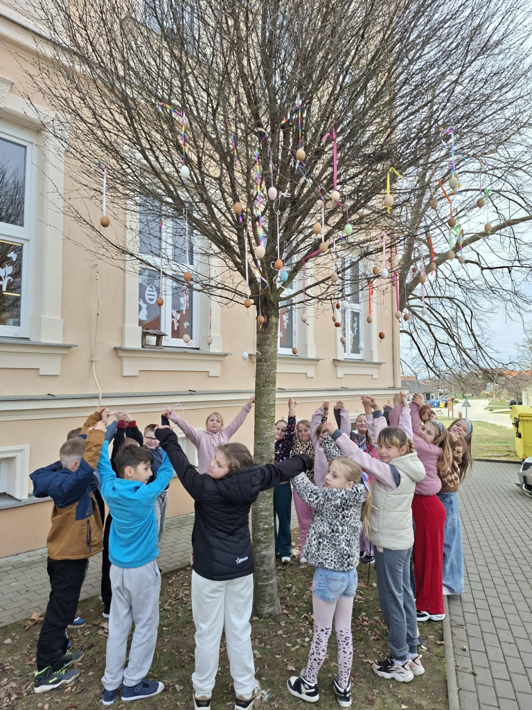 O tuto velikonoční výzdobu se postarali žáci 1. stupně. Děti si do školy přinesly vyfouknutá vajíčka. Aby na stromech dobře držela a dělala parádu i ve větru, děti je pečlivě navázaly na pestrobarevné stužky.