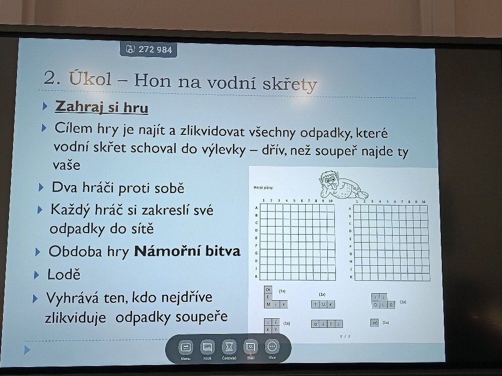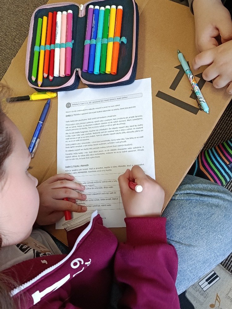 Páťáci navíc vyplňovali pracovní listy, ve kterých si upevnili získané znalosti, a zahráli si hru „Hon na vodní skřety“ ve stylu námořní bitvy s loděmi. Hravou formou tak procvičili správné třídění odpadu a jeho dopad na životní prostředí.