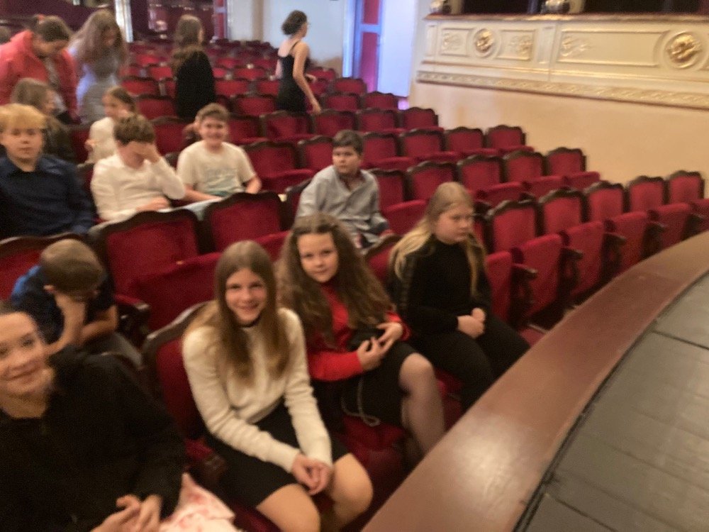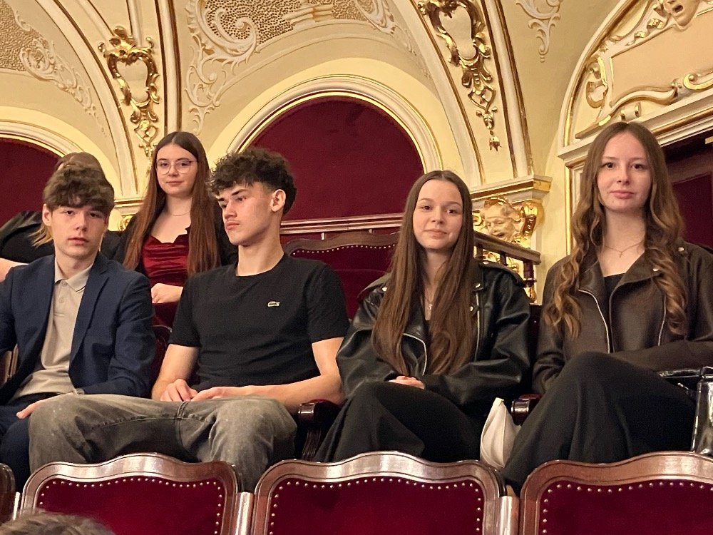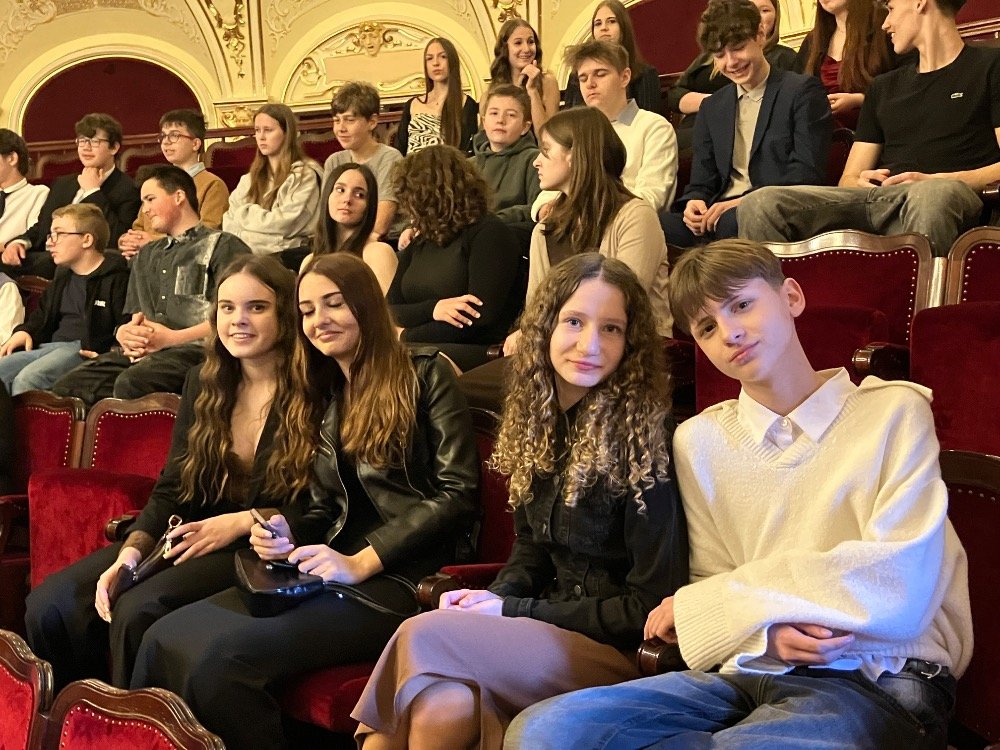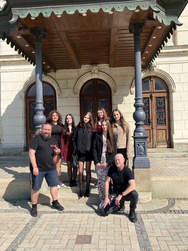 Během představení se žáci seznámili s jednotlivými rolemi v divadle, poznali práci herců, režiséra i dalších členů tvůrčího týmu. Nechyběl ani humor, nadsázka a interakce s publikem, která přispěla k uvolněné atmosféře a aktivnímu zapojení diváků. Před budovou divadla nás pak čekalo milé překvapení – potkali jsme se s herci, kteří nám před chvílí hráli. Požádali jsme je o společné foto a někteří z žáků získali i autogramy.