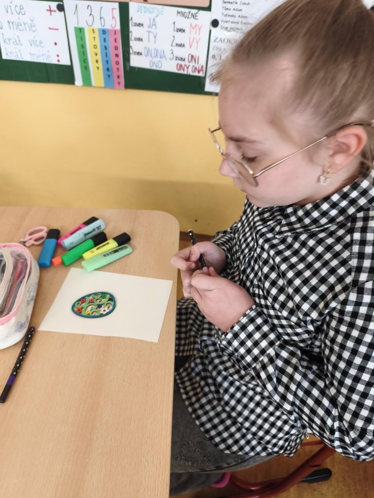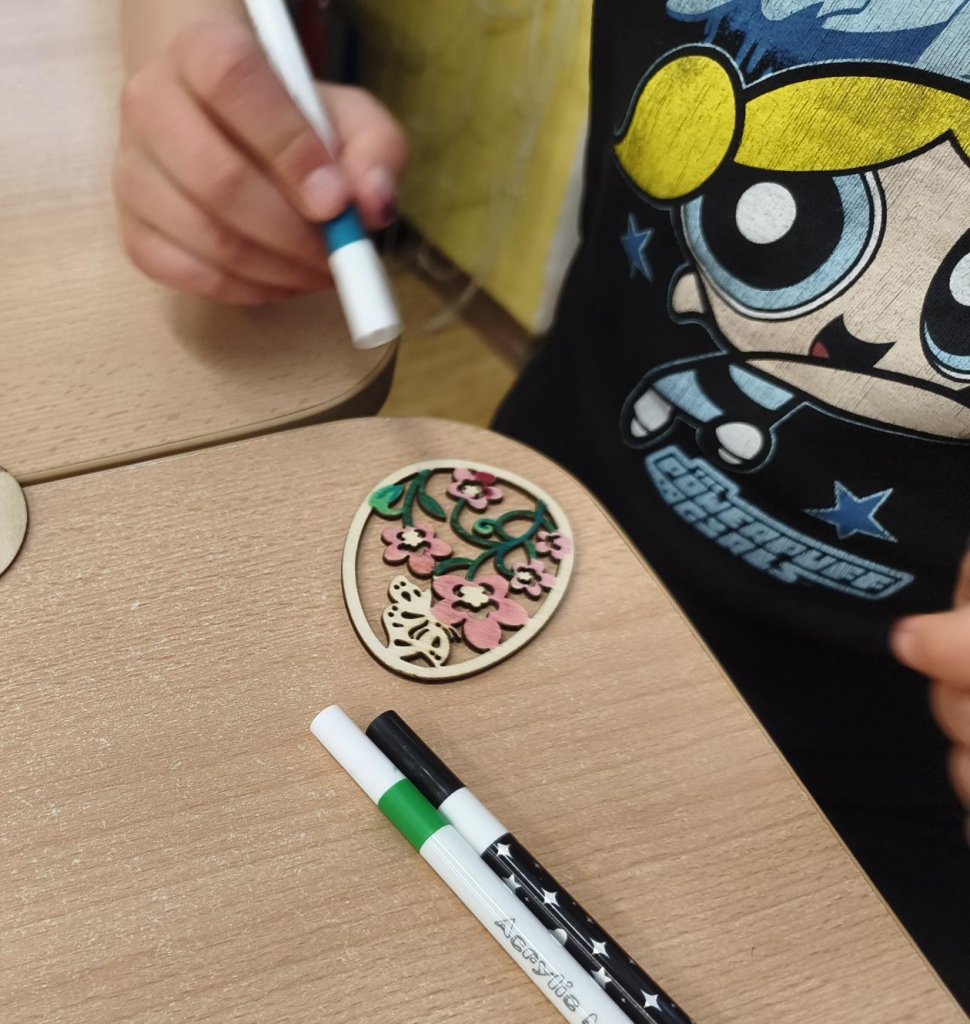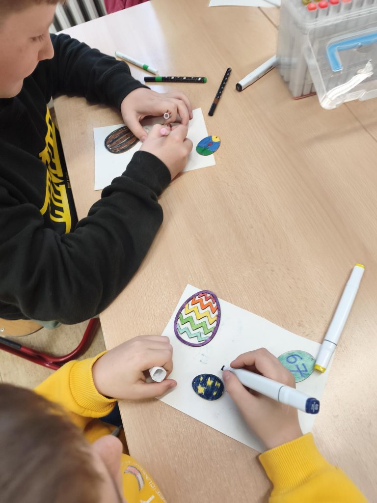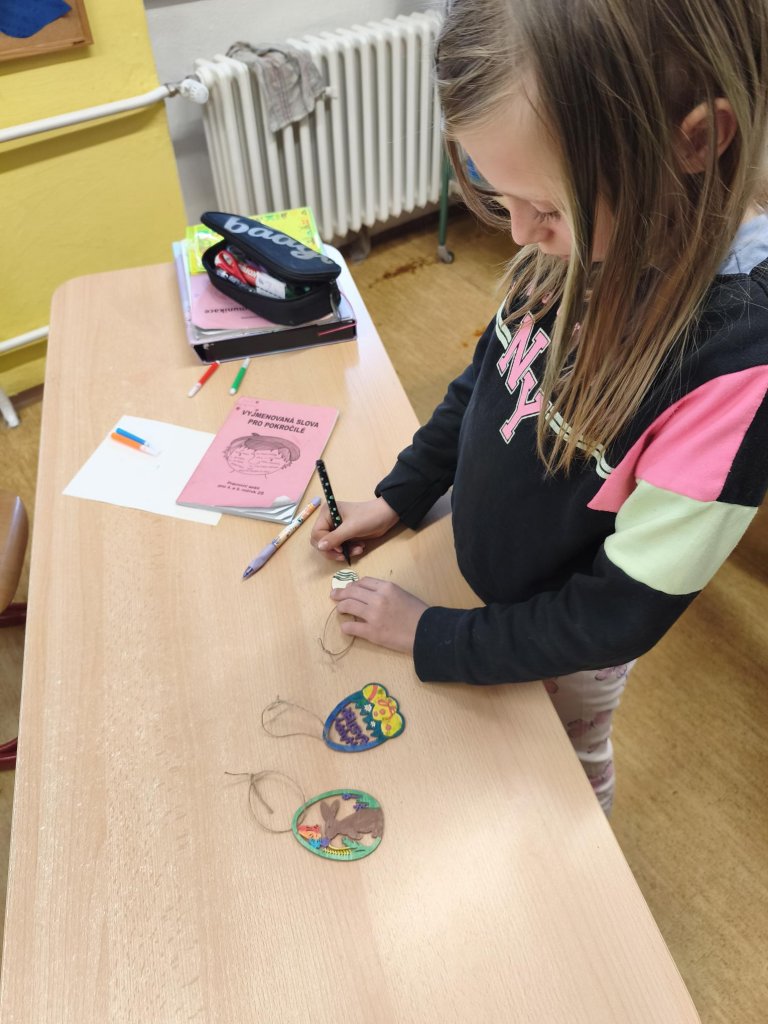 Žáci si v hodině výtvarné výchovy kreativně vyzdobili dřevěná vajíčka s velikonočními motivy. K dotváření využili různé druhy barevných fixů, díky nimž vznikly pestré a originální vzory. Hotová vajíčka vytvořila veselou jarní atmosféru.