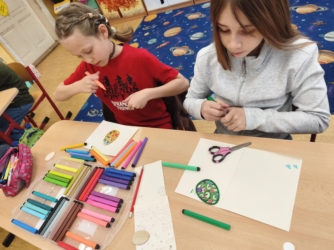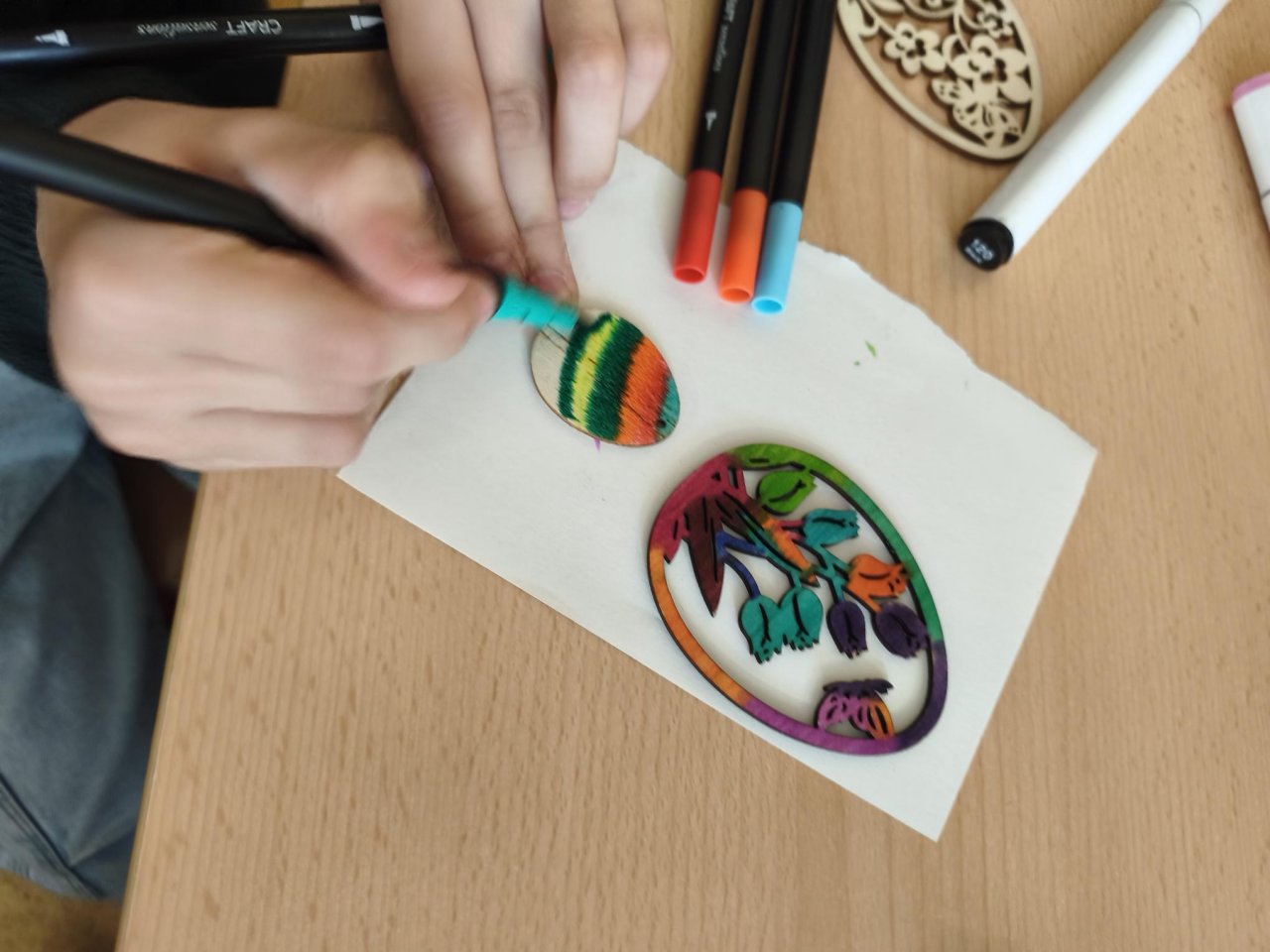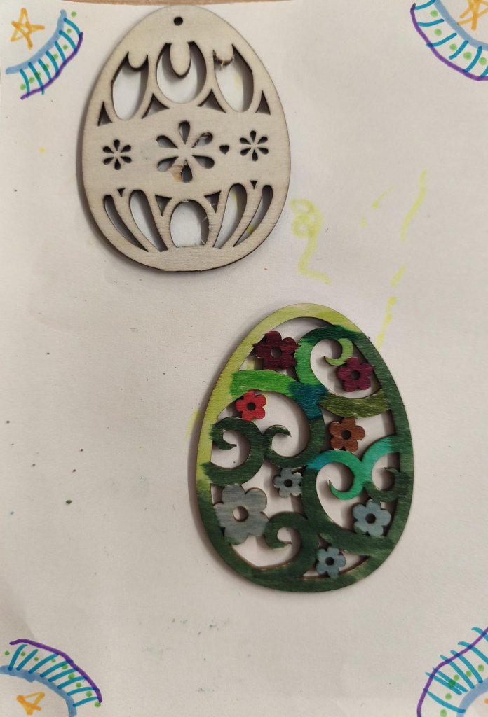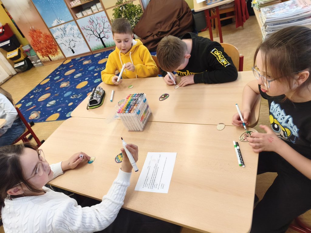 Žáci si v hodině výtvarné výchovy kreativně vyzdobili dřevěná vajíčka s velikonočními motivy. K dotváření využili různé druhy barevných fixů, díky nimž vznikly pestré a originální vzory. Hotová vajíčka vytvořila veselou jarní atmosféru.