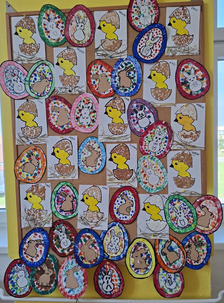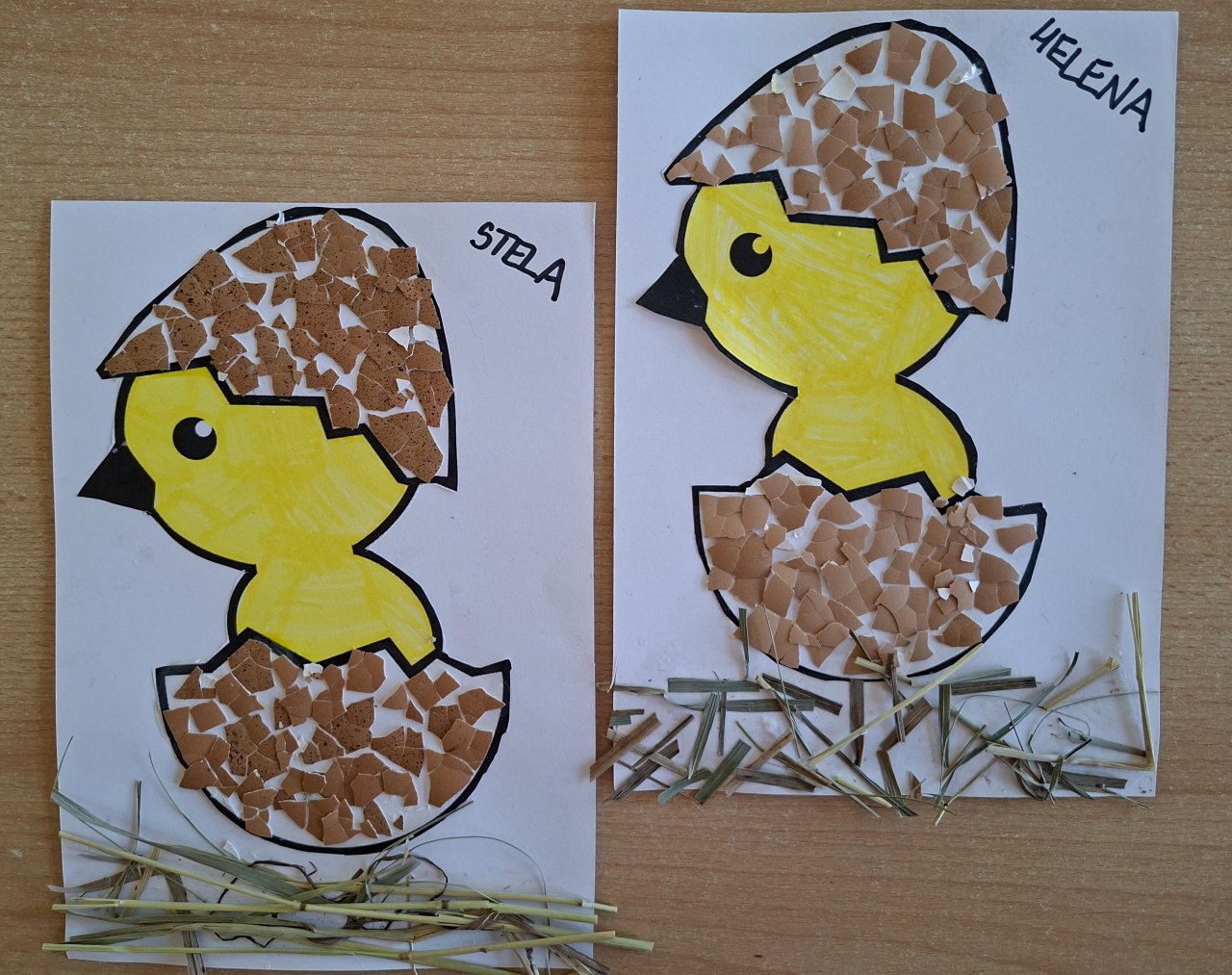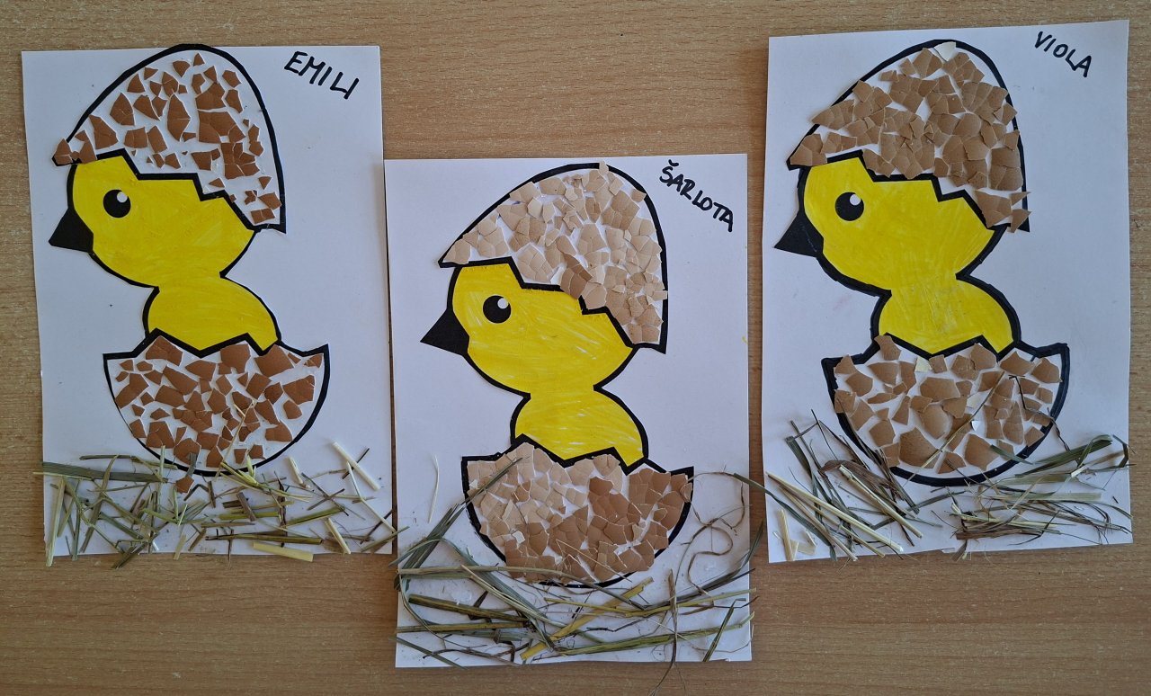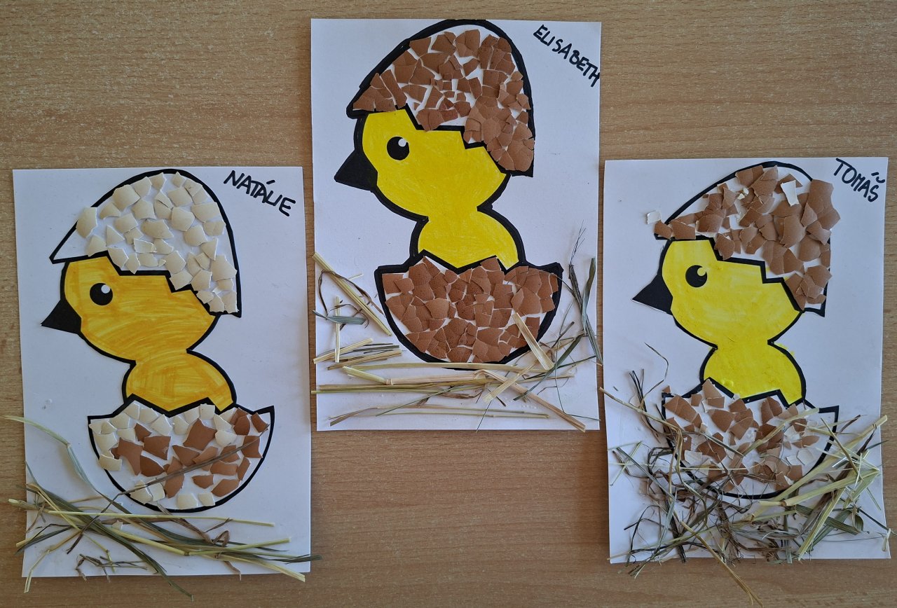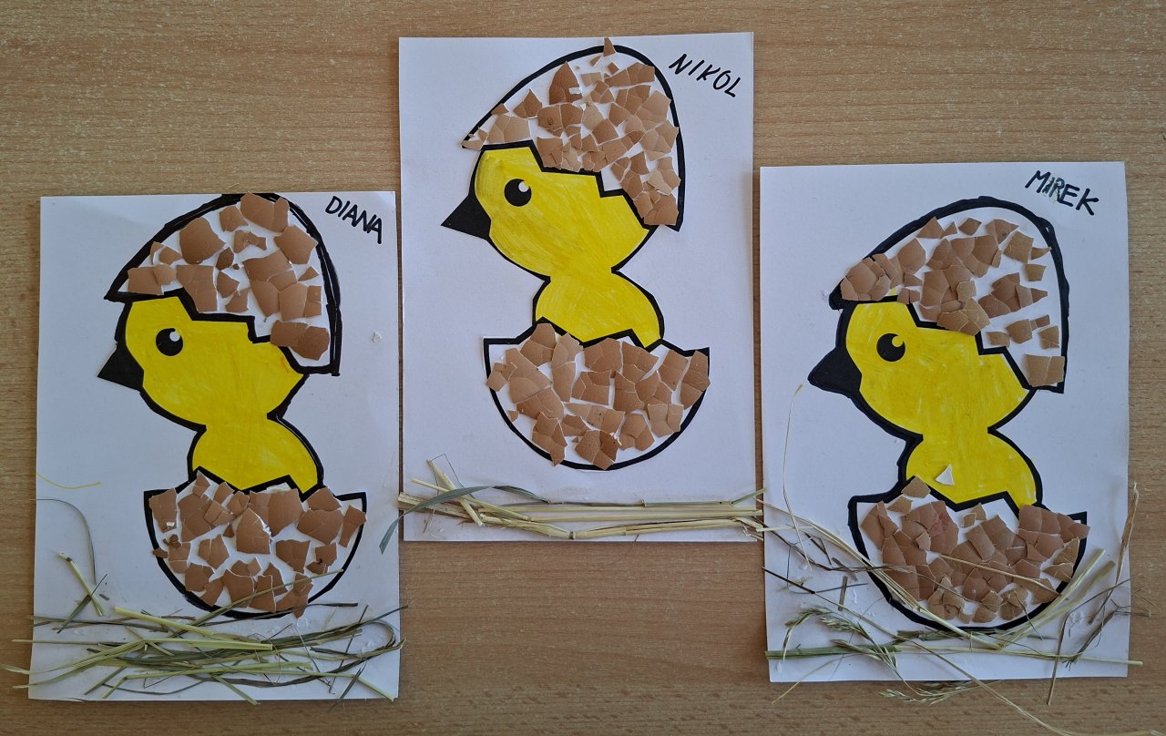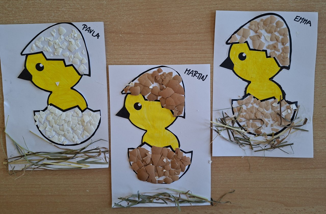 Žáci vyráběli velikonoční kuřátka. Při zdobení použili skořápky z vyfouknutých vajec, kuřata dokreslili fixami a výrobek dozdobili nalepeným senem.