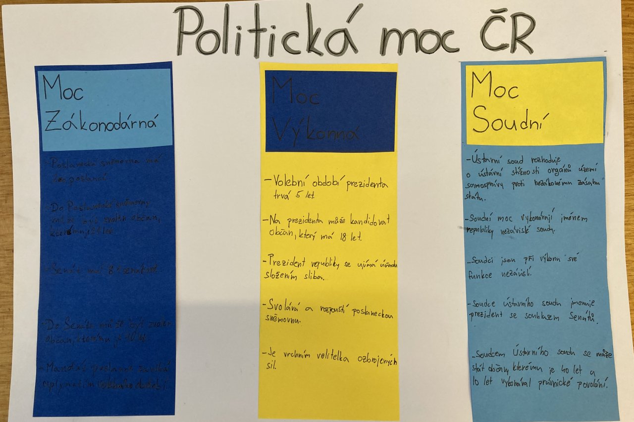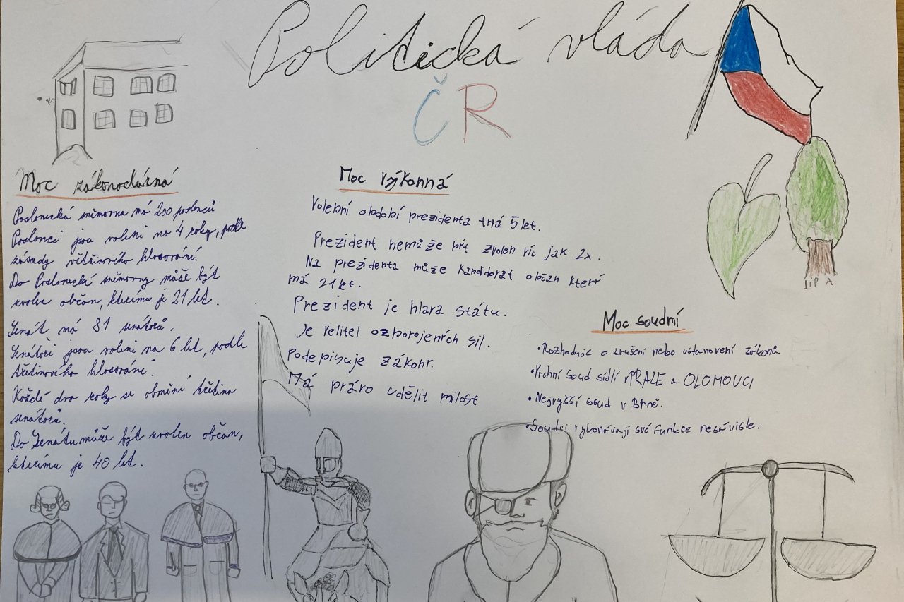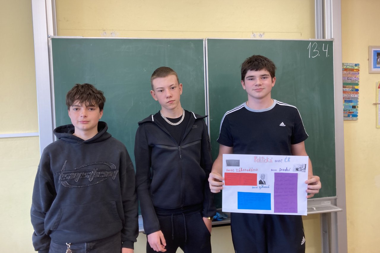 Datum: 15. 4. 2026Žáci 8. třídy se ve výchově k občanství věnovali složitému tématu politické moci v České republice prostřednictvím projektu Politická moc ČR. Pracovali ve skupinách a zaměřili se na jednotlivé složky státní moci, jejich funkce a vzájemné vztahy.