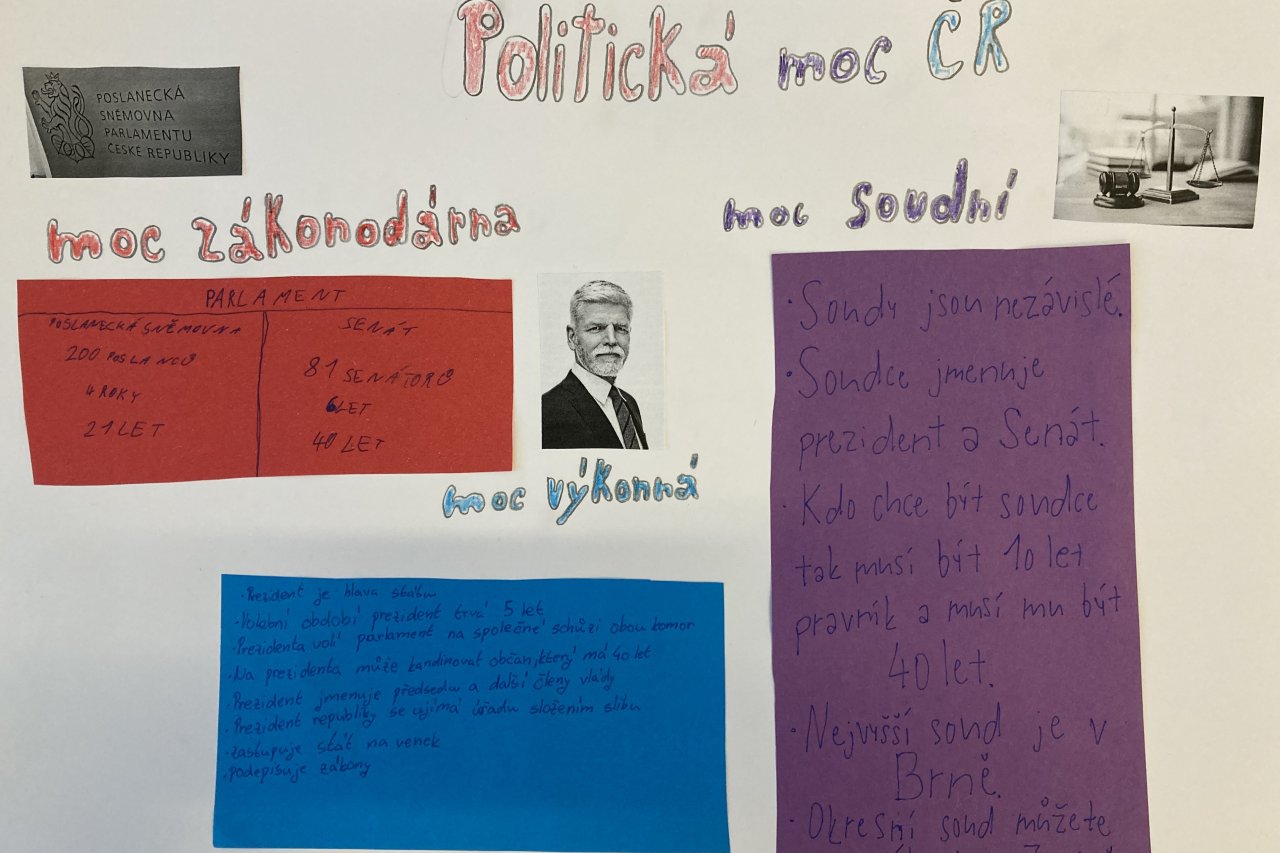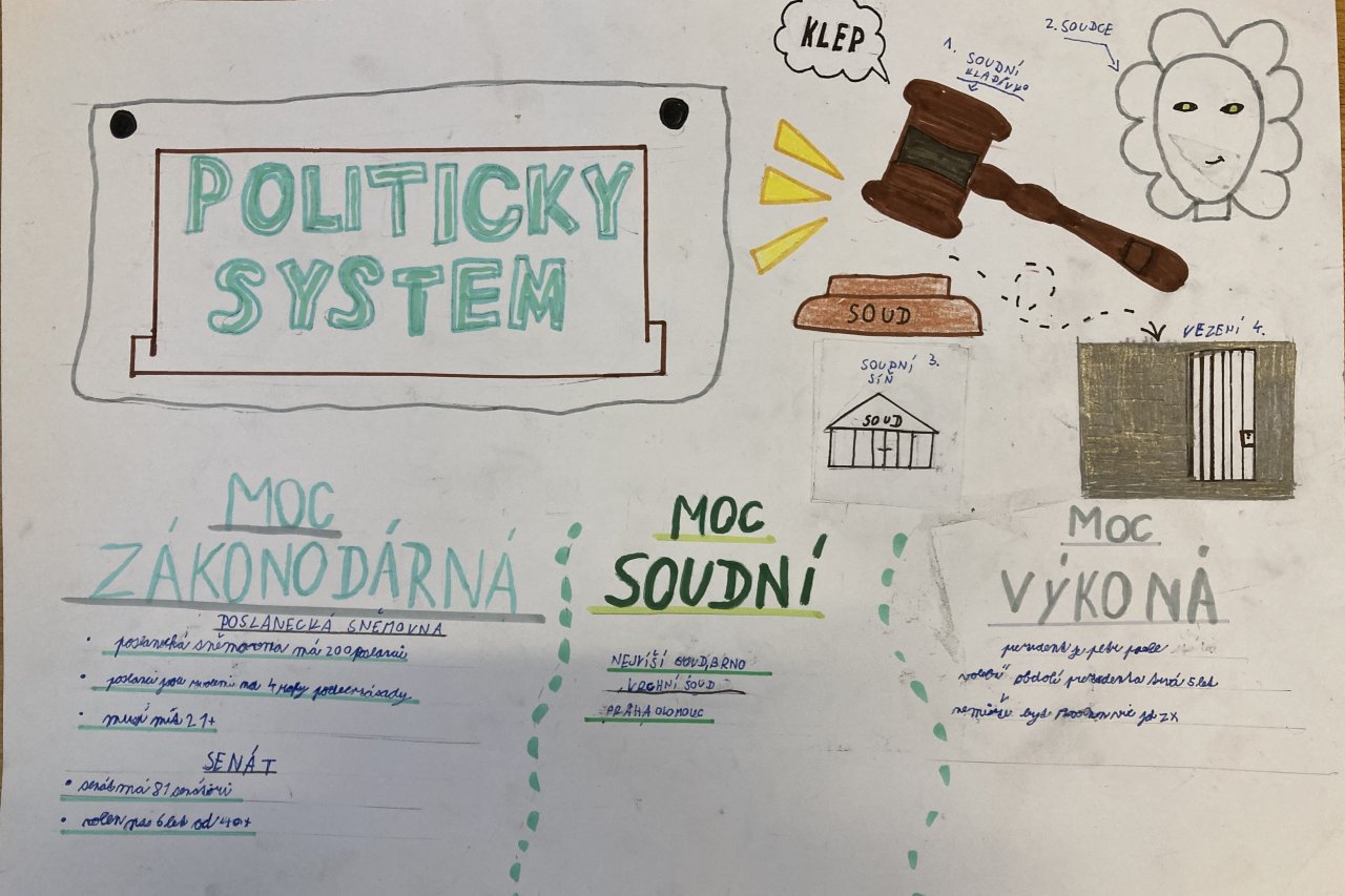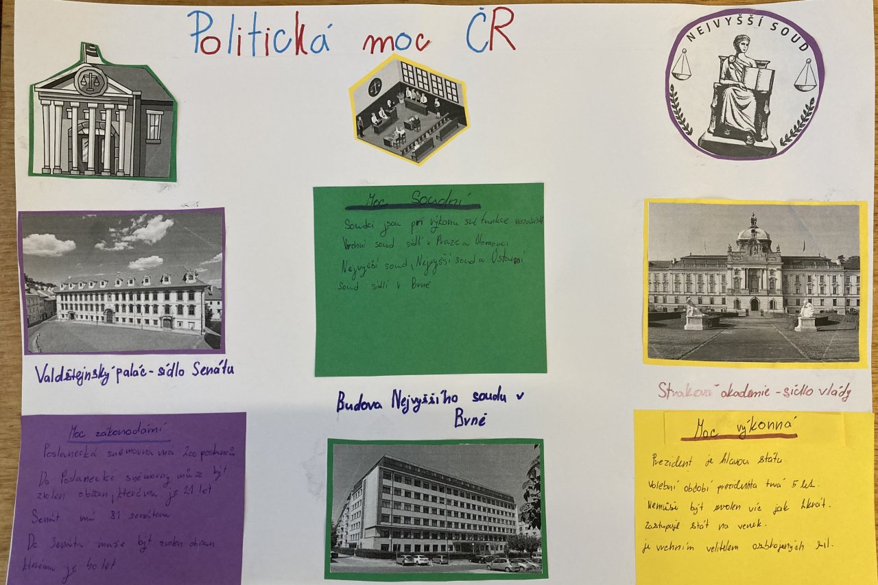 Datum: 15. 4. 2026Žáci 8. třídy se ve výchově k občanství věnovali složitému tématu politické moci v České republice prostřednictvím projektu Politická moc ČR. Pracovali ve skupinách a zaměřili se na jednotlivé složky státní moci, jejich funkce a vzájemné vztahy.