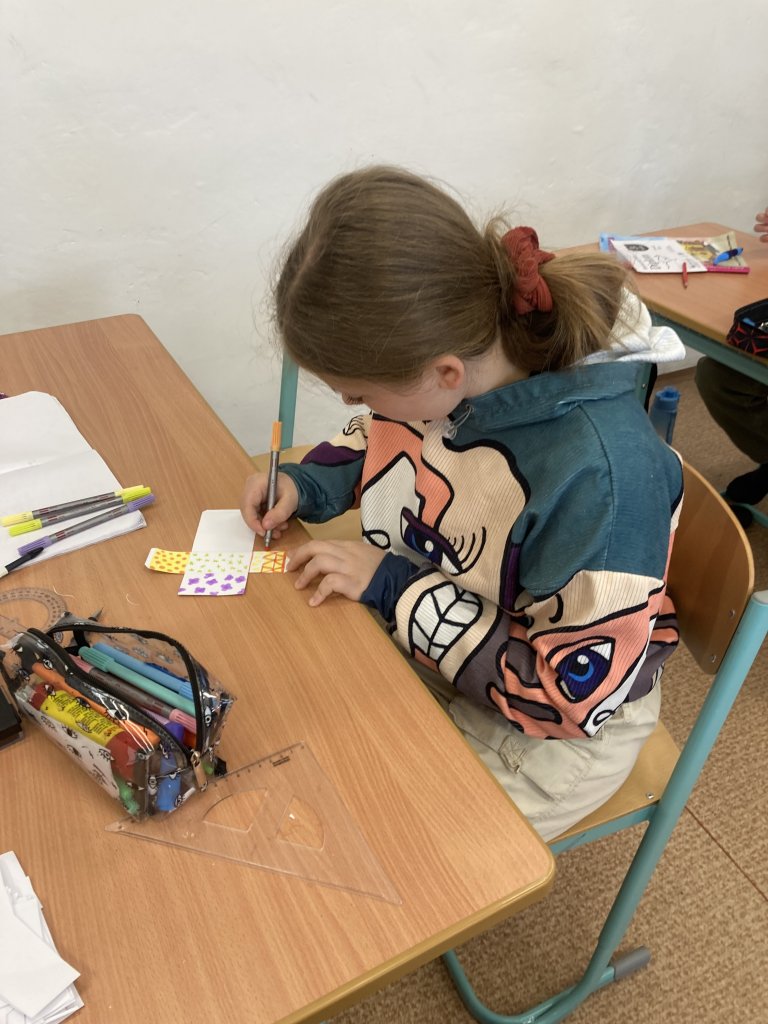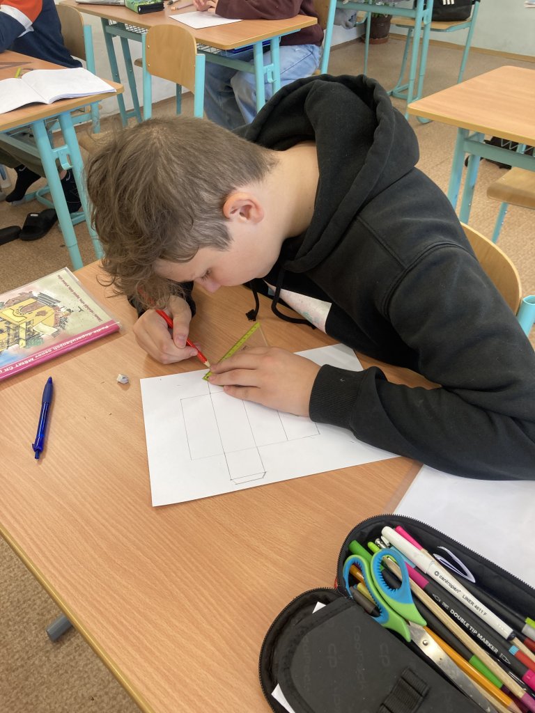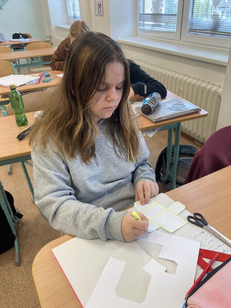 Další část výuky byla zaměřena na vytvoření sítě hranolu. Žáci si narýsovali sítě hranolů na papír, pečlivě vystřihli jednotlivé části a následně je slepili do prostorových modelů. Díky této aktivitě lépe pochopili vztah mezi rovinným zobrazením a skutečným tělesem.