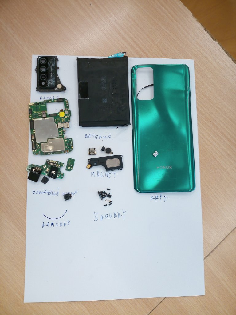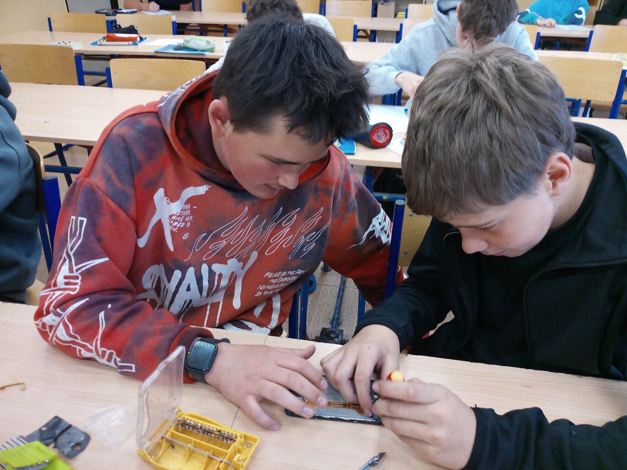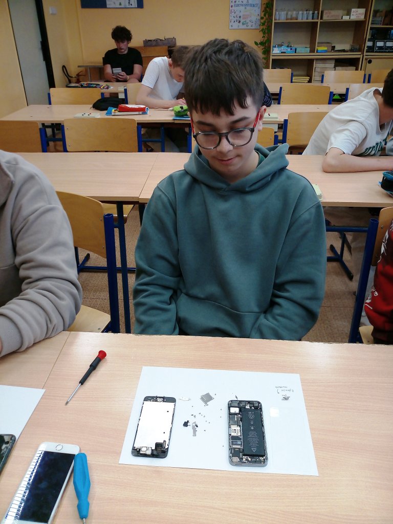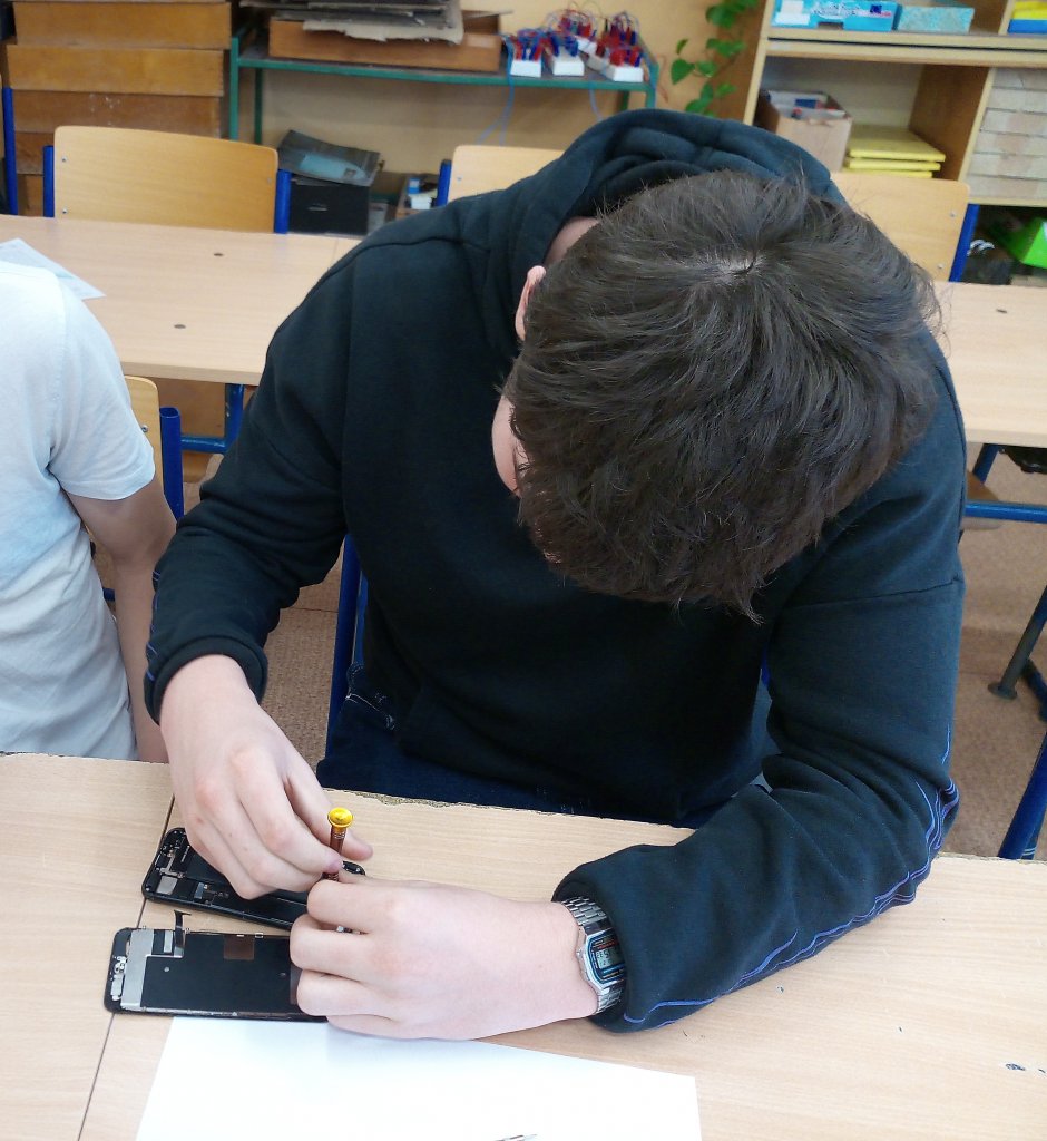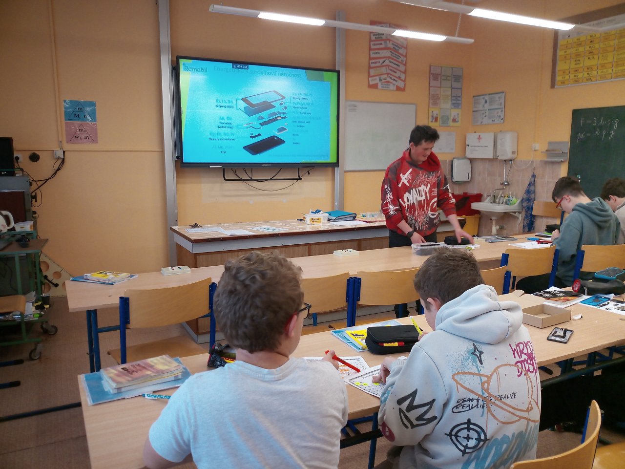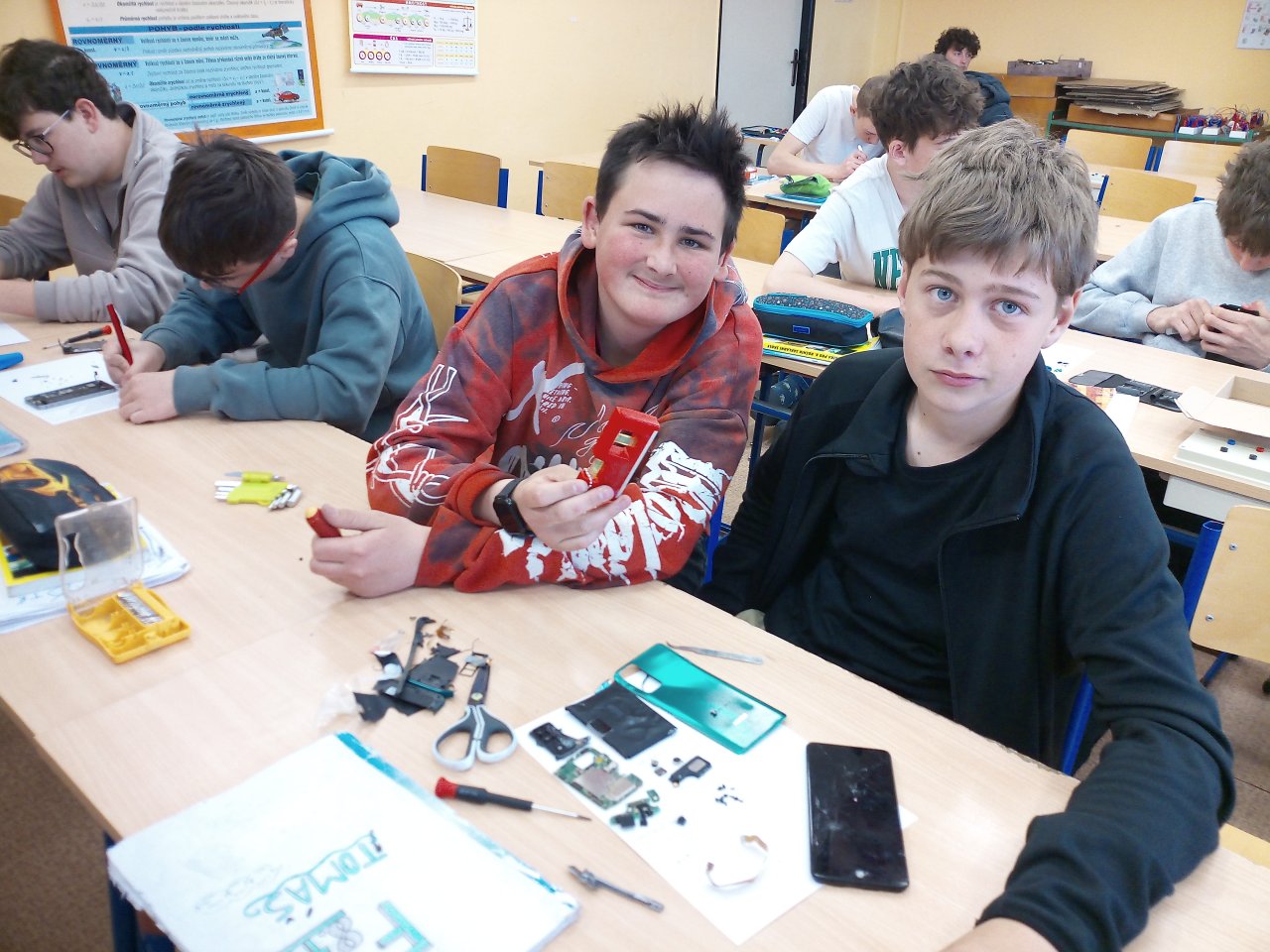 Datum: 21. 4. 2026Do hodiny fyziky si žáci 8. třídy přinesli staré mobilní telefony a společně je rozebrali. Zjistili, že mobil obsahuje nejen plast a sklo, ale i řadu prvků z periodické tabulky – například měď, hliník, železo, ale také cenné kovy jako zlato či stříbro. V baterii objevili lithium a kobalt.