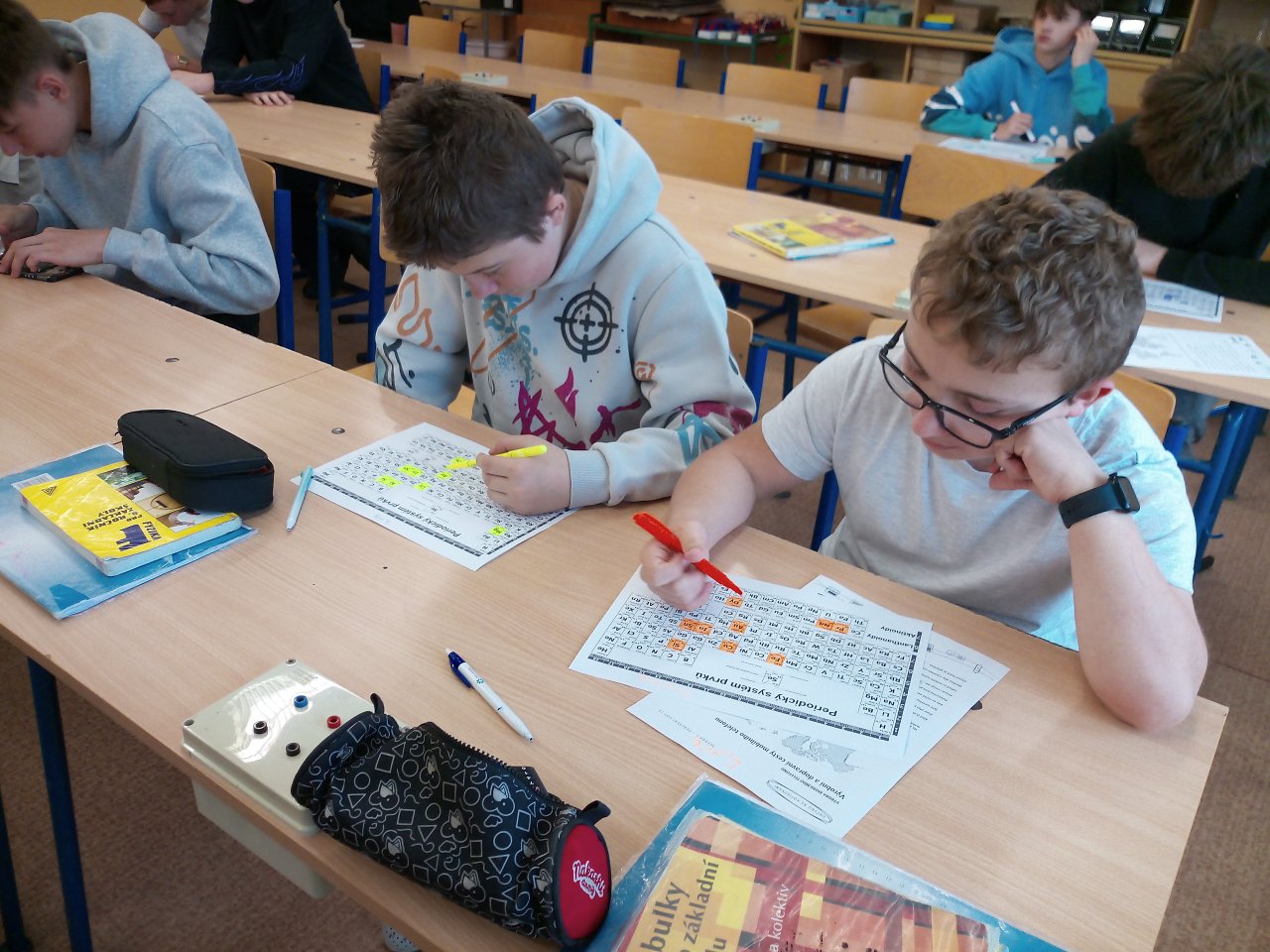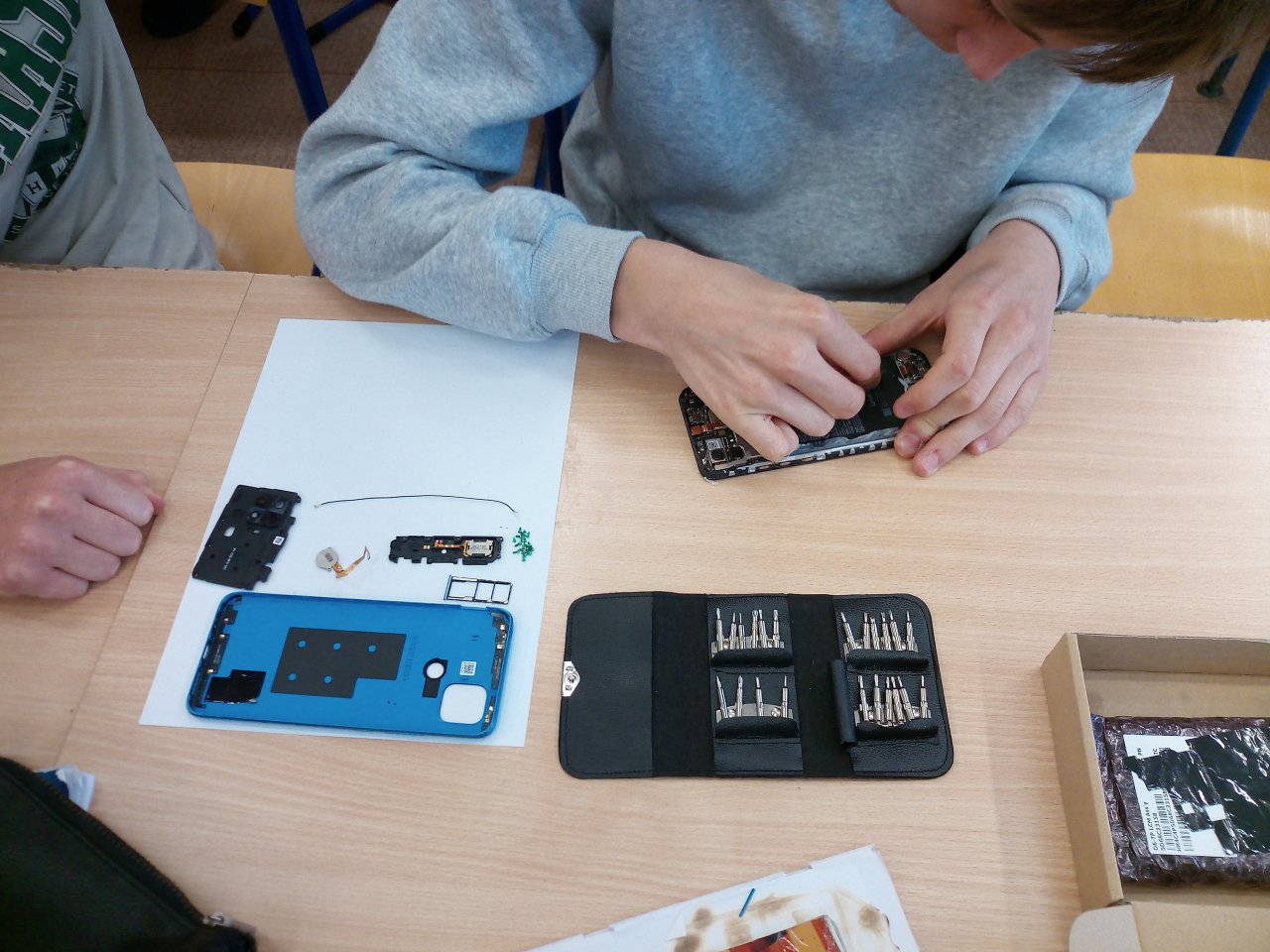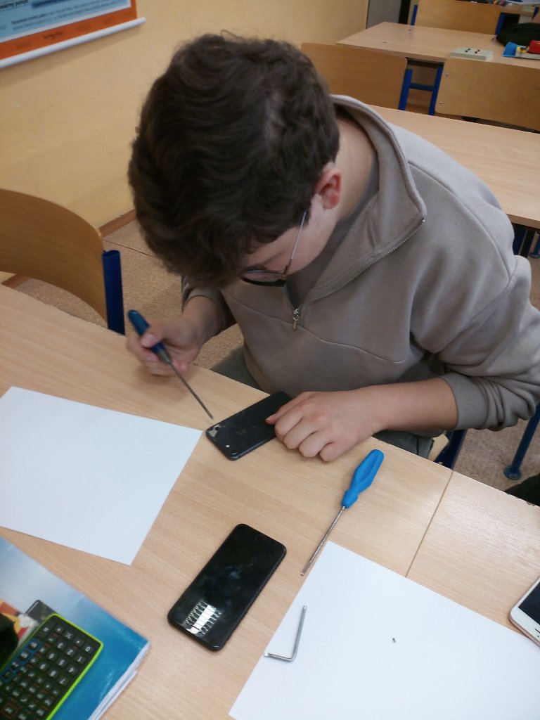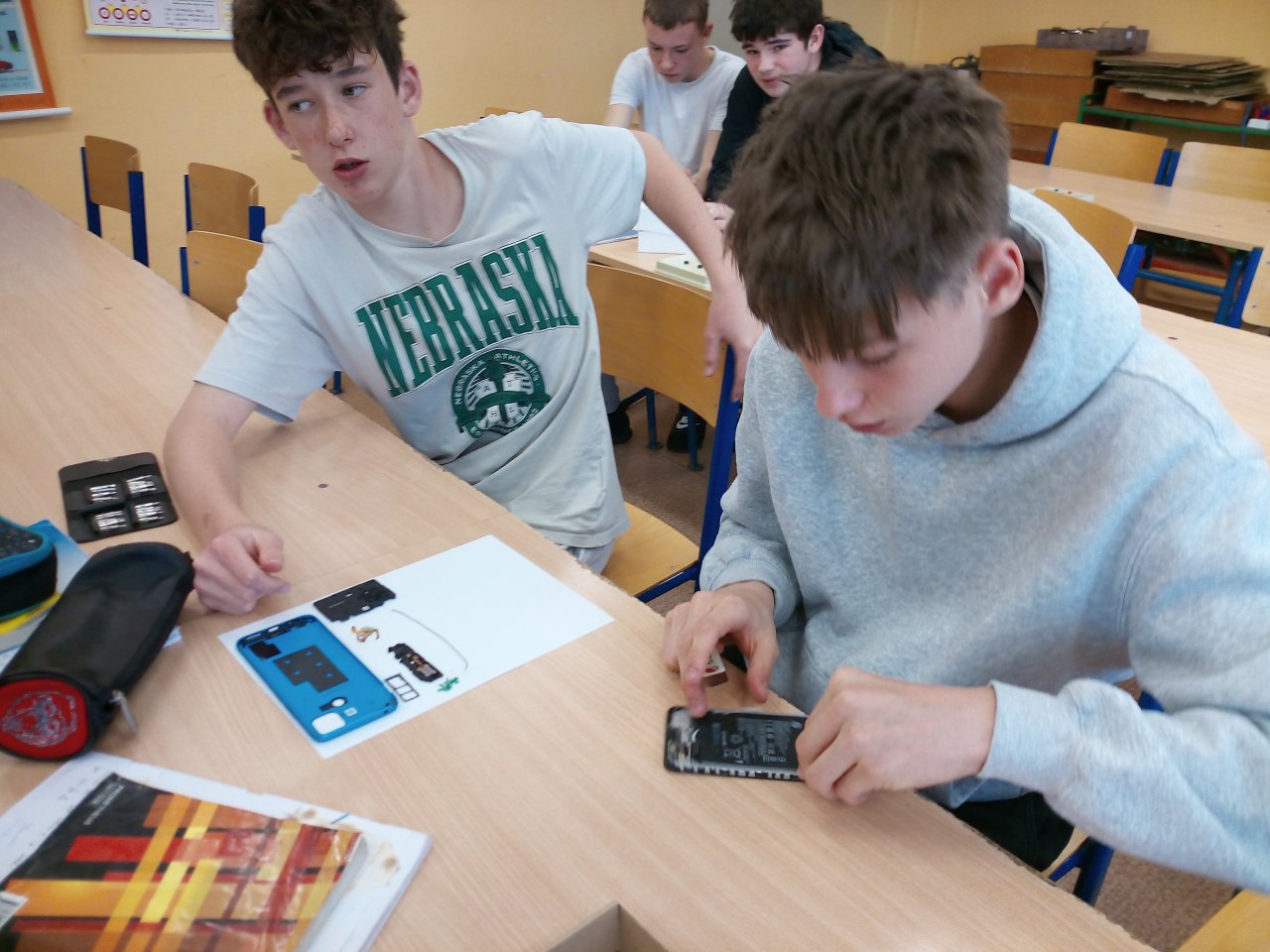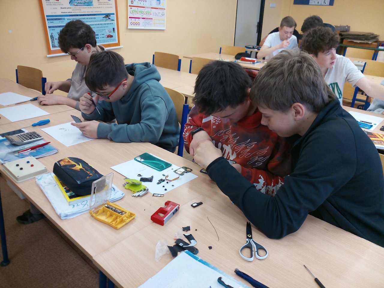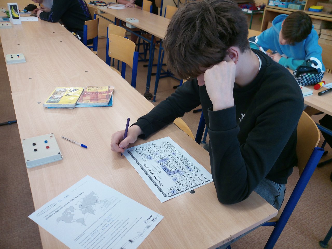 Datum: 21. 4. 2026Do hodiny fyziky si žáci 8. třídy přinesli staré mobilní telefony a společně je rozebrali. Zjistili, že mobil obsahuje nejen plast a sklo, ale i řadu prvků z periodické tabulky – například měď, hliník, železo, ale také cenné kovy jako zlato či stříbro. V baterii objevili lithium a kobalt.