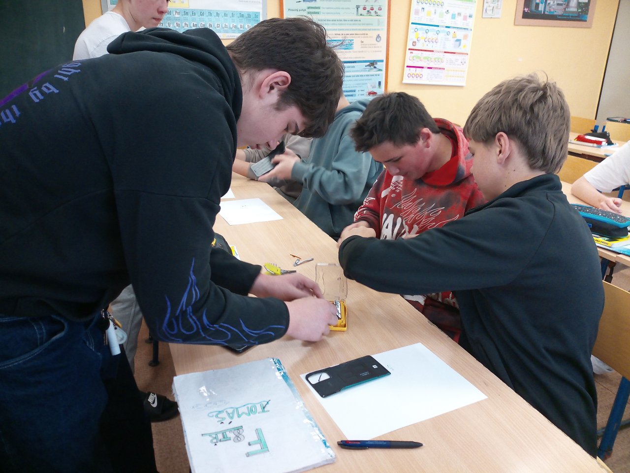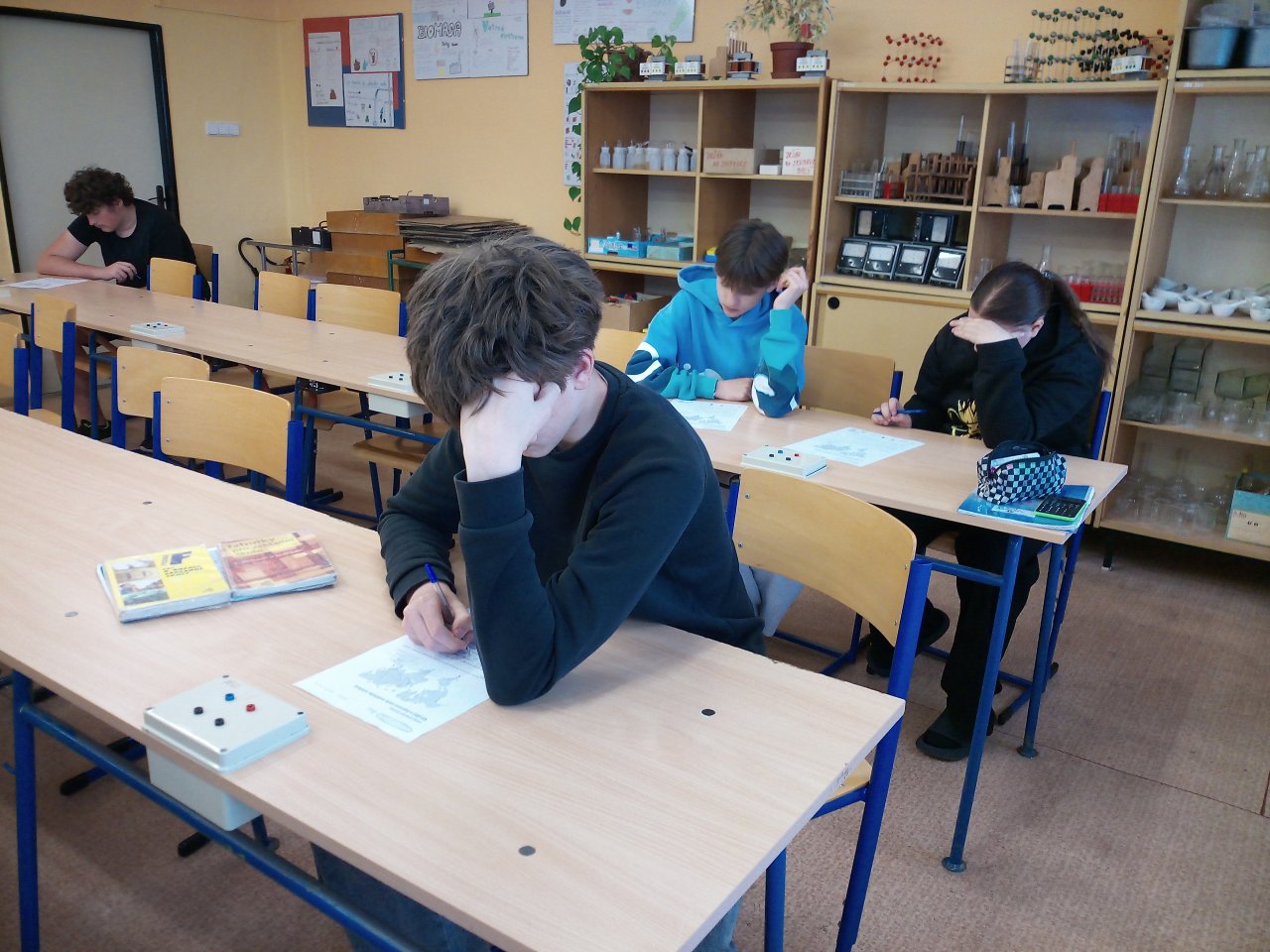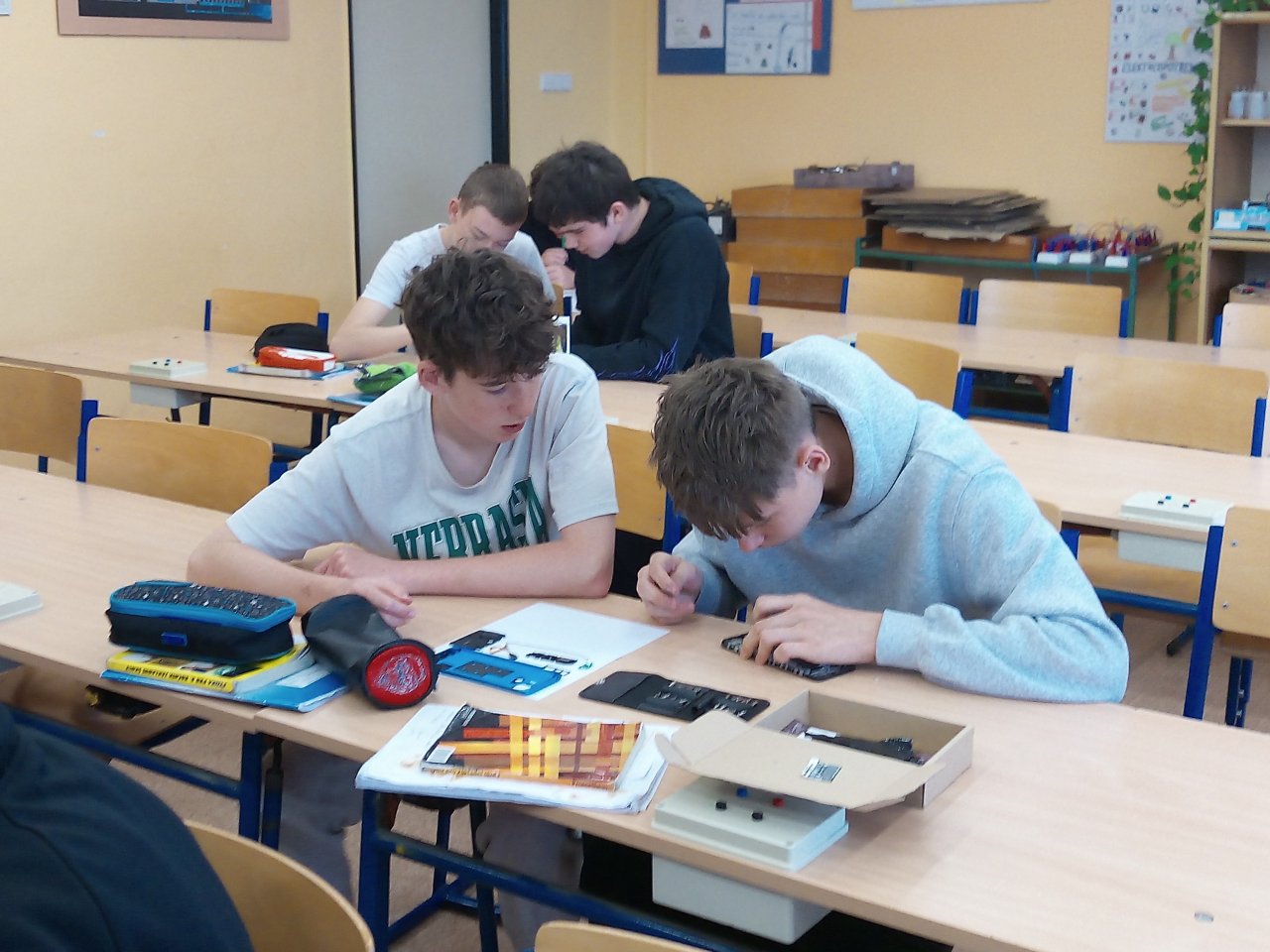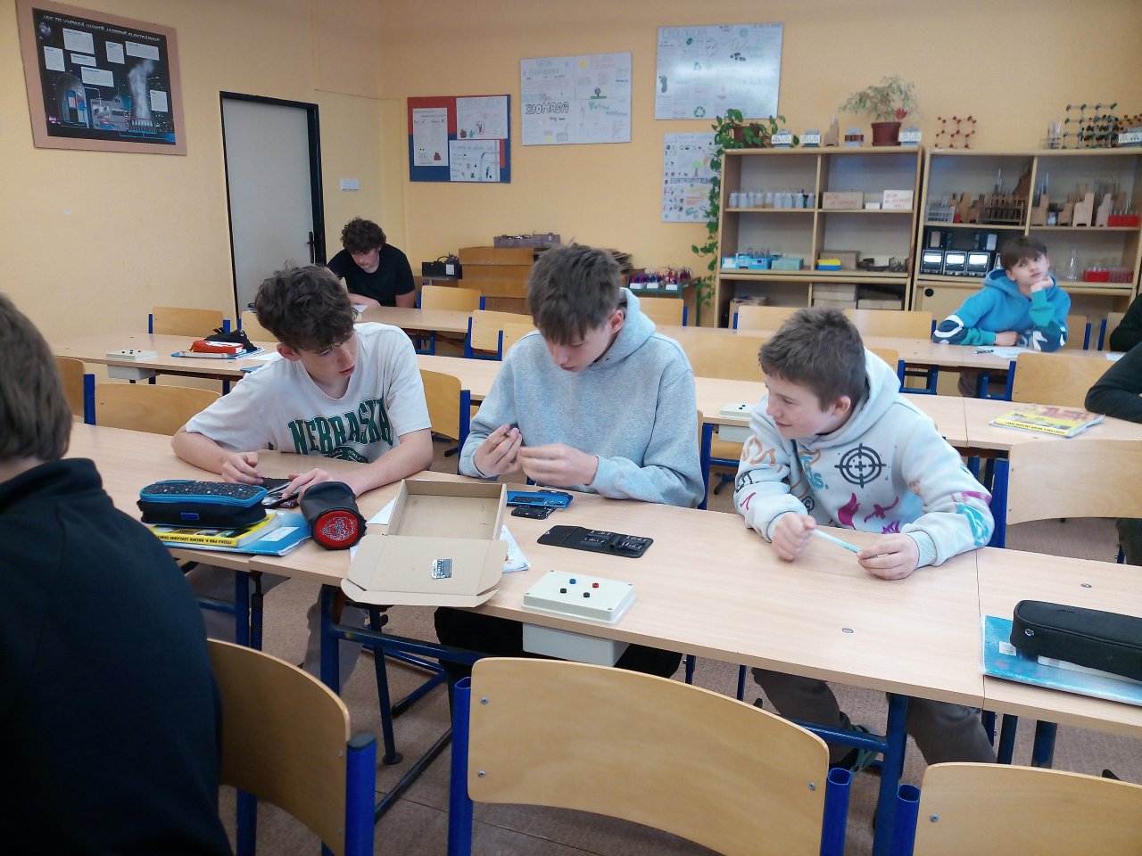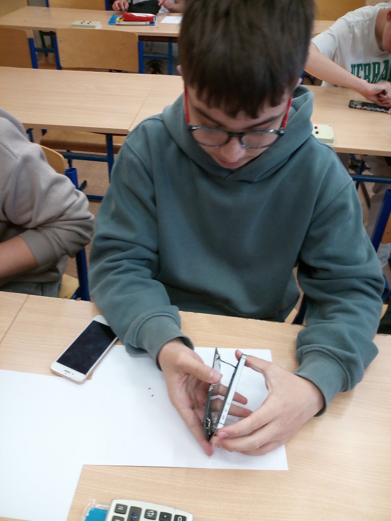 Datum: 21. 4. 2026Do hodiny fyziky si žáci 8. třídy přinesli staré mobilní telefony a společně je rozebrali. Zjistili, že mobil obsahuje nejen plast a sklo, ale i řadu prvků z periodické tabulky – například měď, hliník, železo, ale také cenné kovy jako zlato či stříbro. V baterii objevili lithium a kobalt.